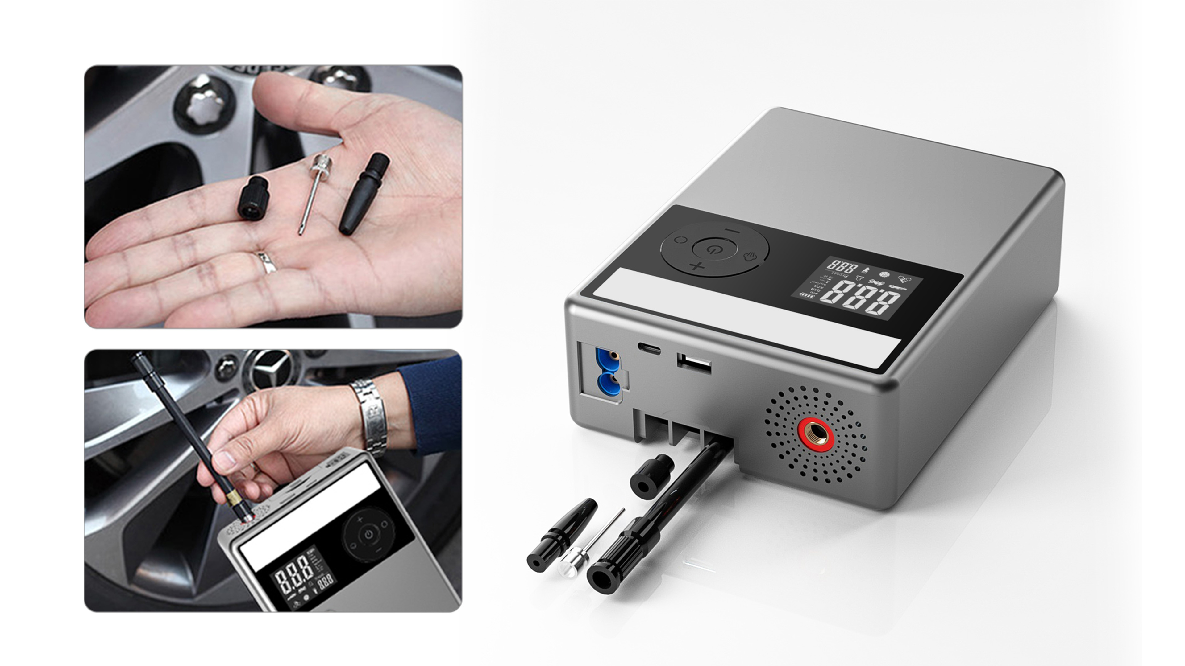 Forget searching for parts. This device integrates the inflation nozzle directly into the body, allowing you to start inflating immediately. Additional adapters are stored in built-in modular slots, ensuring fast access, eliminating the need for a separate bag and making it especially useful in emergencies or for first-time users.