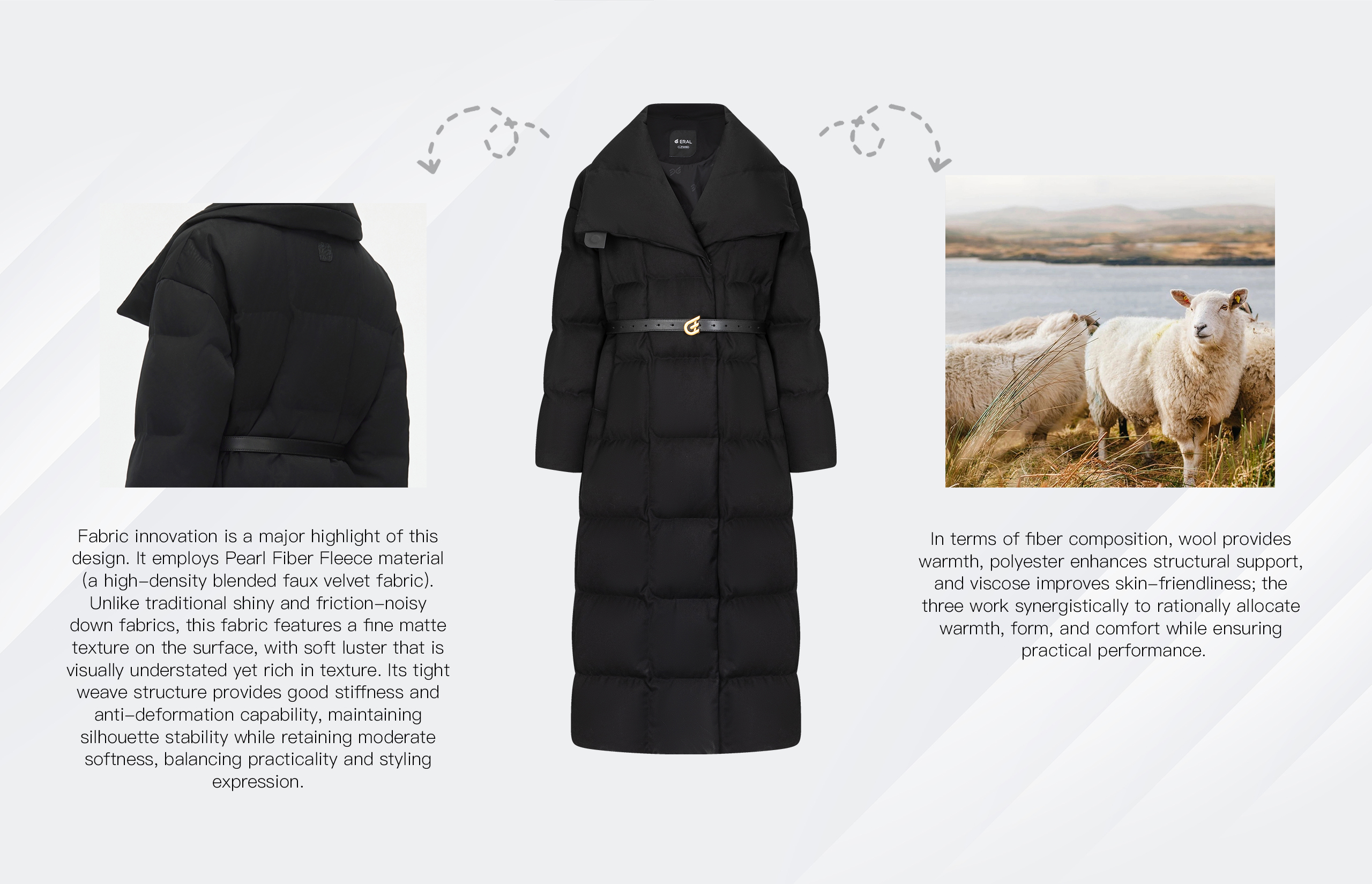 The bag's waist loop design features continuous detailing that accentuates vertical lines. The refined waist buckle serves as a tasteful accent, while the leather belt and down fabric create a striking material contrast that elevates the ensemble's layered structure and silhouette definition. The most notable design distinction lies in the fabric: The Gloss Series employs Peri-fiber velvet as the primary material, contrasting with traditional polycarbonate-coated fabrics that often produce noise through frequent friction. This velvet boasts a delicate matte finish with soft sheen, achieving understated elegance through its refined texture. Its tightly woven structure maintains excellent crispness and shape retention while preserving moderate softness, striking a perfect balance between practicality and visual impact.