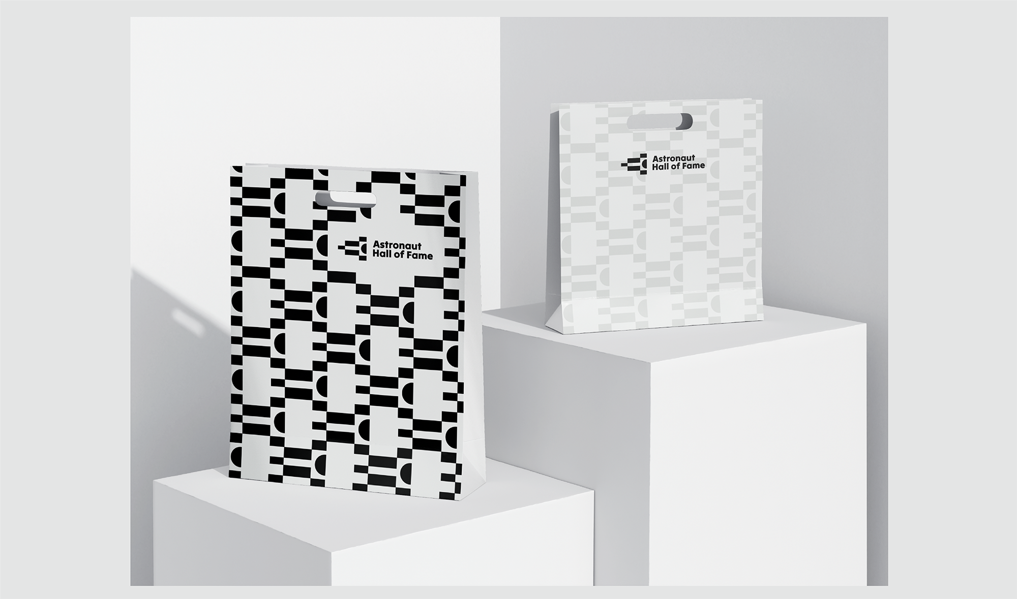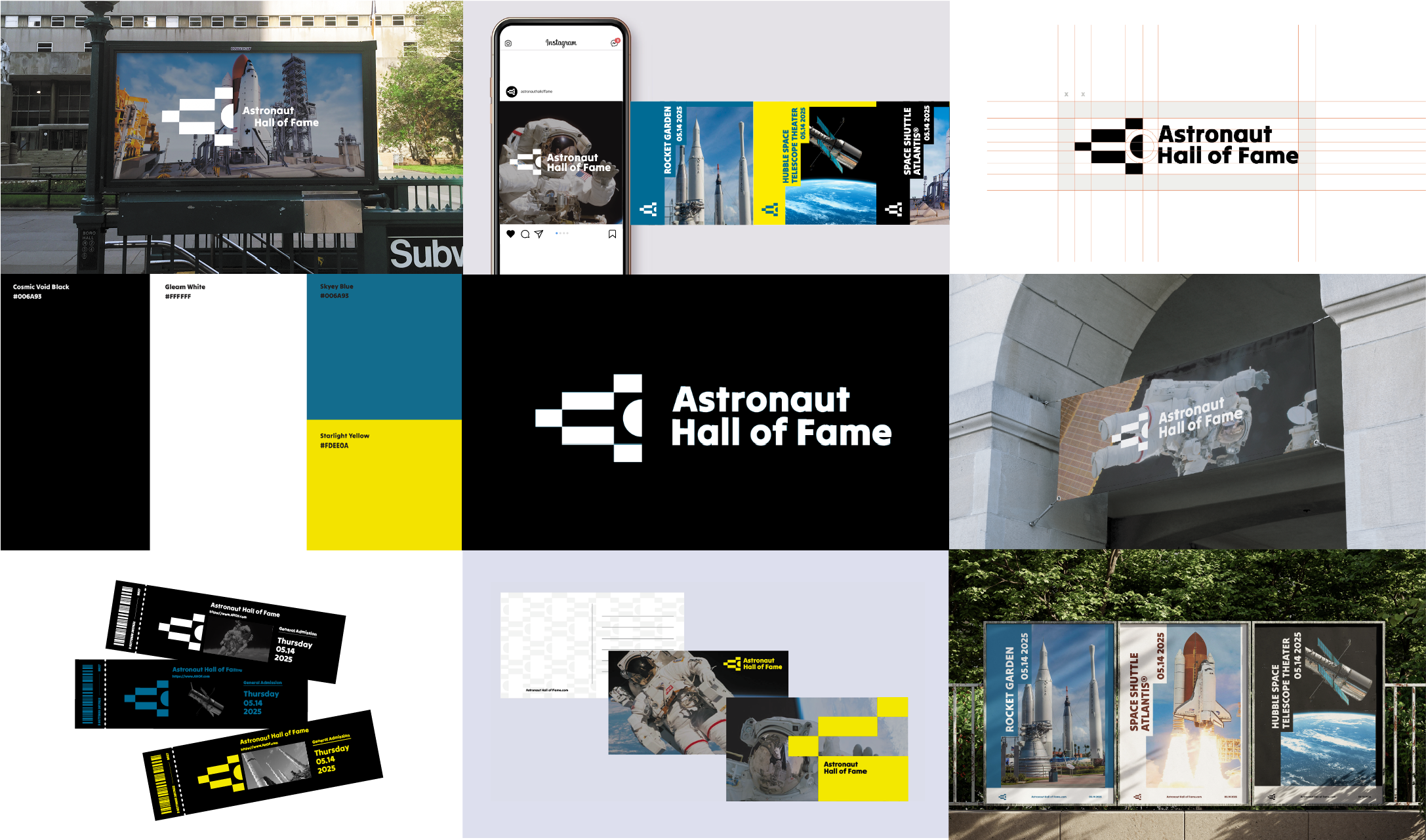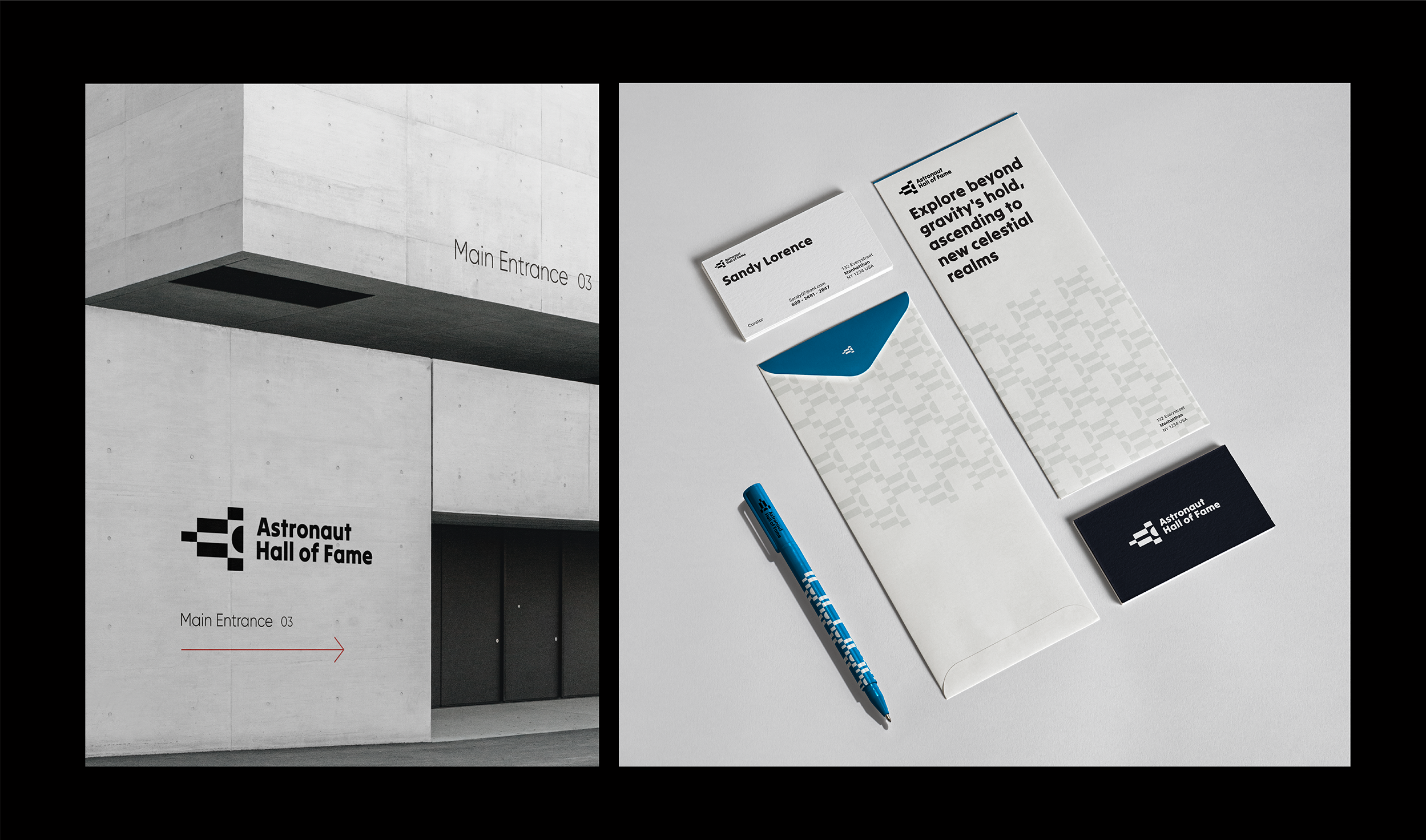The Astronaut Hall of Fame logo depicts a spaceship departing from a planet, designed with smooth curves that reflect NASA’s dynamic movement, innovation, and futuristic vision. It symbolizes the endless curiosity and research of scientists and engineers, as well as humanity’s pursuit of technological advancement and exploration of the boundless universe. As a result, the brand identity is built around the logo’s dynamic, distinctive shapes, which are consistently applied throughout the system to create an engaging and cohesive experience for viewers.