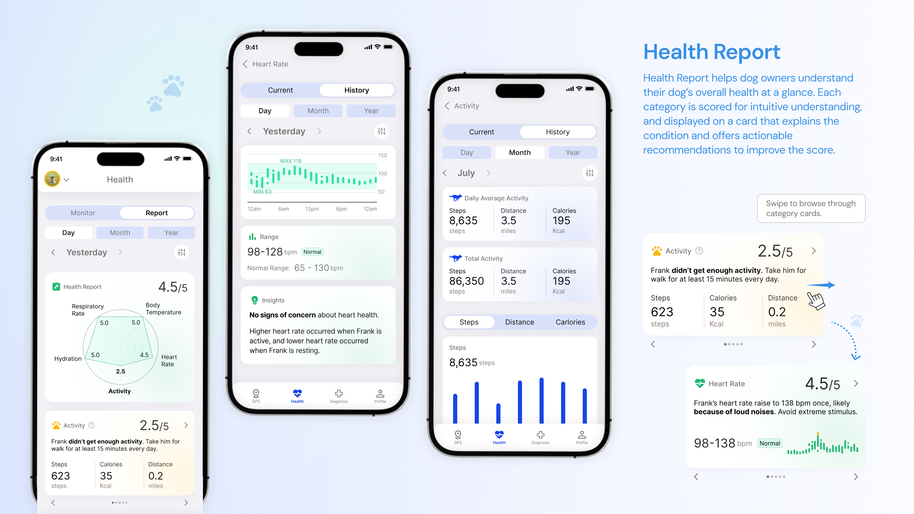 - Health Report: Provides daily, monthly, and yearly summaries covering heart health, activity, endurance, and temperature regulation. Each category is scored and paired with AI-powered recommendations, giving owners a comprehensive view of their dog’s overall well-being.