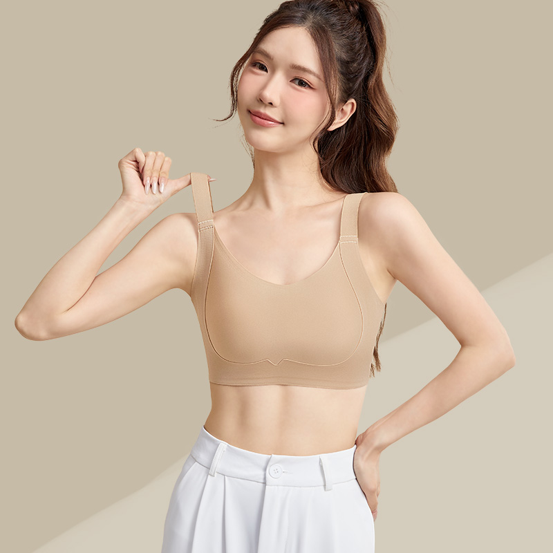 This Bra features a rabbit-ear cup that not only prevents nipple show-through but also instantly reduces the bust size by two cups. Combined with 3D three-dimensional shock-absorbing cups, this Bra scientifically distributes breast pressure. Even in sports scenarios like running, it can keep the breasts stable and reduce jolting. It incorporates a tech-driven lifting strap, enabling anti-gravity lifting to easily address breast sagging.