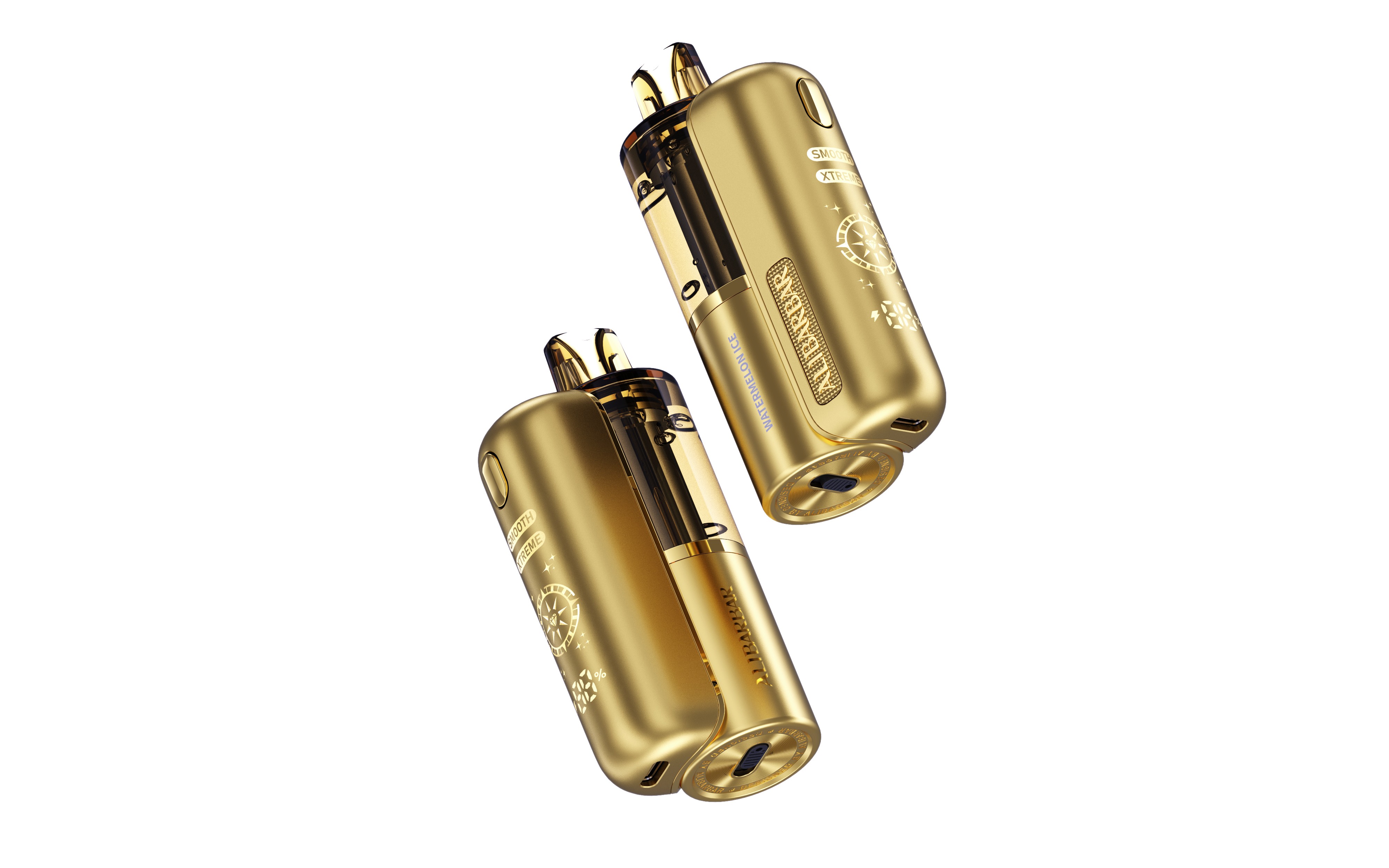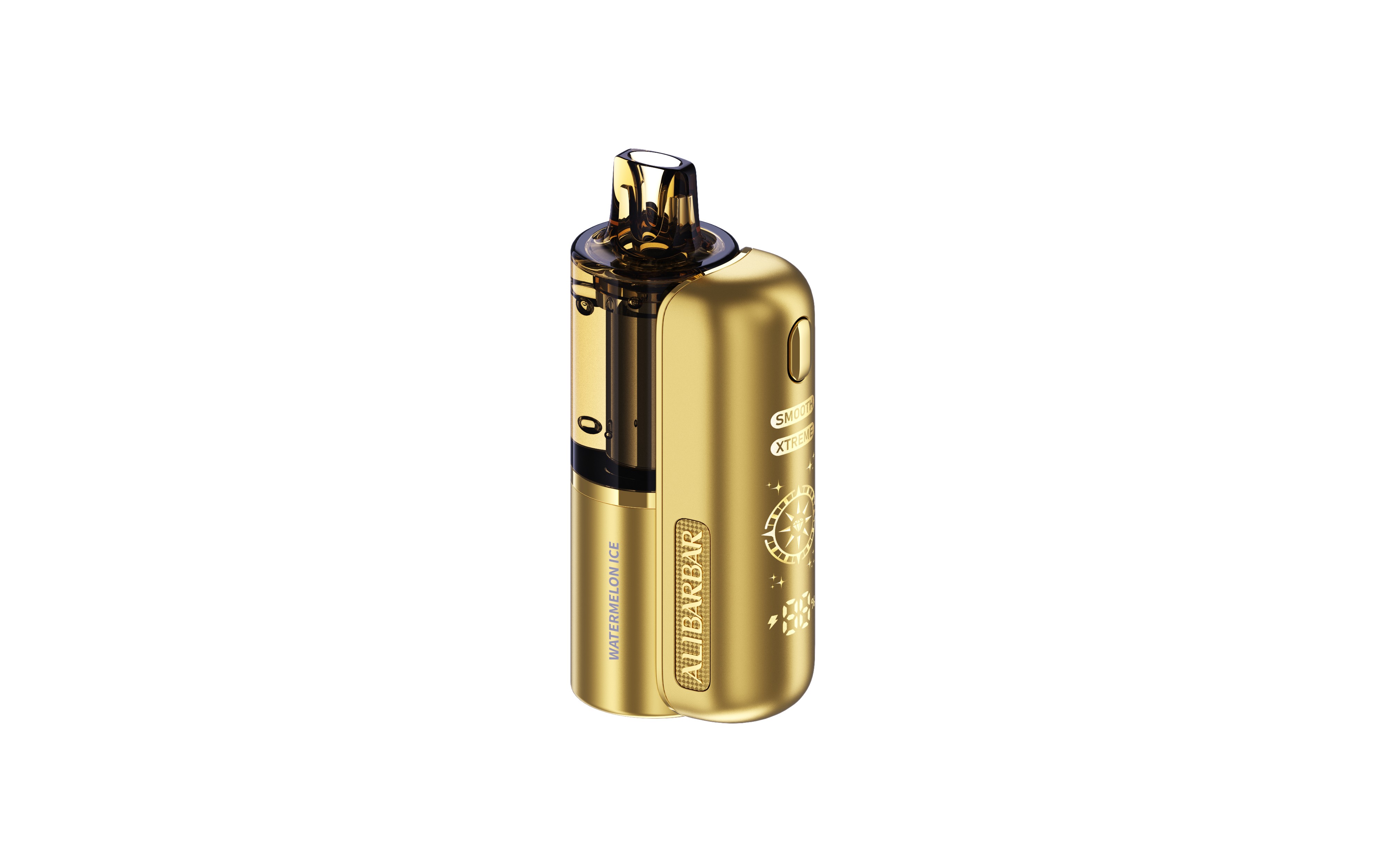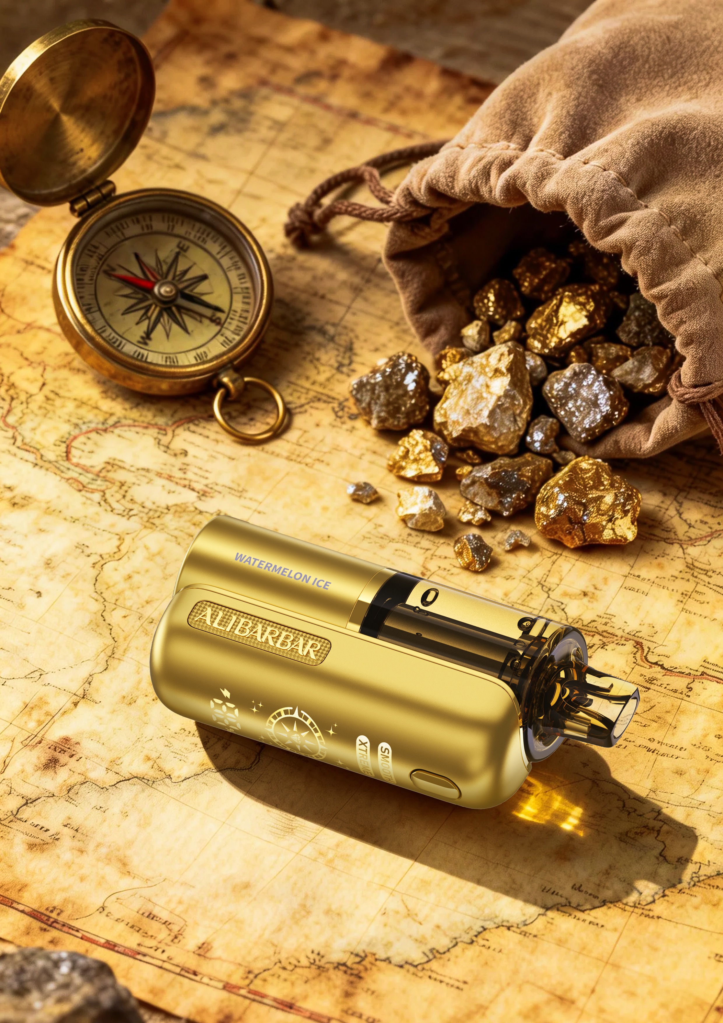 This e-cigarette boasts a compact, rounded body, providing a comfortable grip and high portability. An elegant, luxurious gold hue paired with a finely textured matte surface results in a gentle tactile feel and an upscale style. The single functional button is accentuated with a high-gloss electroplated finish, creating a striking contrast against the matte backdrop. This not only ensures intuitive operation but also improves visual layering. The exquisite logo plaque on the front presents a restrained yet sophisticated aesthetic—exuding quiet luxury. Moreover, the transparent e-liquid tank serves a dual purpose: it allows users to instantly check the remaining amount, eliminating concerns about low e-liquid levels; its interplay with light infuses the device with a touch of dynamism, softening the potential visual weight of the gold hue. Notably, the side screen displays the battery status in real time. The UI draws inspiration from vintage treasure maps, featuring a compass motif; at its center, a diamond icon appears as the user engages with the device—symbolizing the “discovery of treasure.” This subtle narrative imbues every puff with emotional warmth and a sense of ritual.