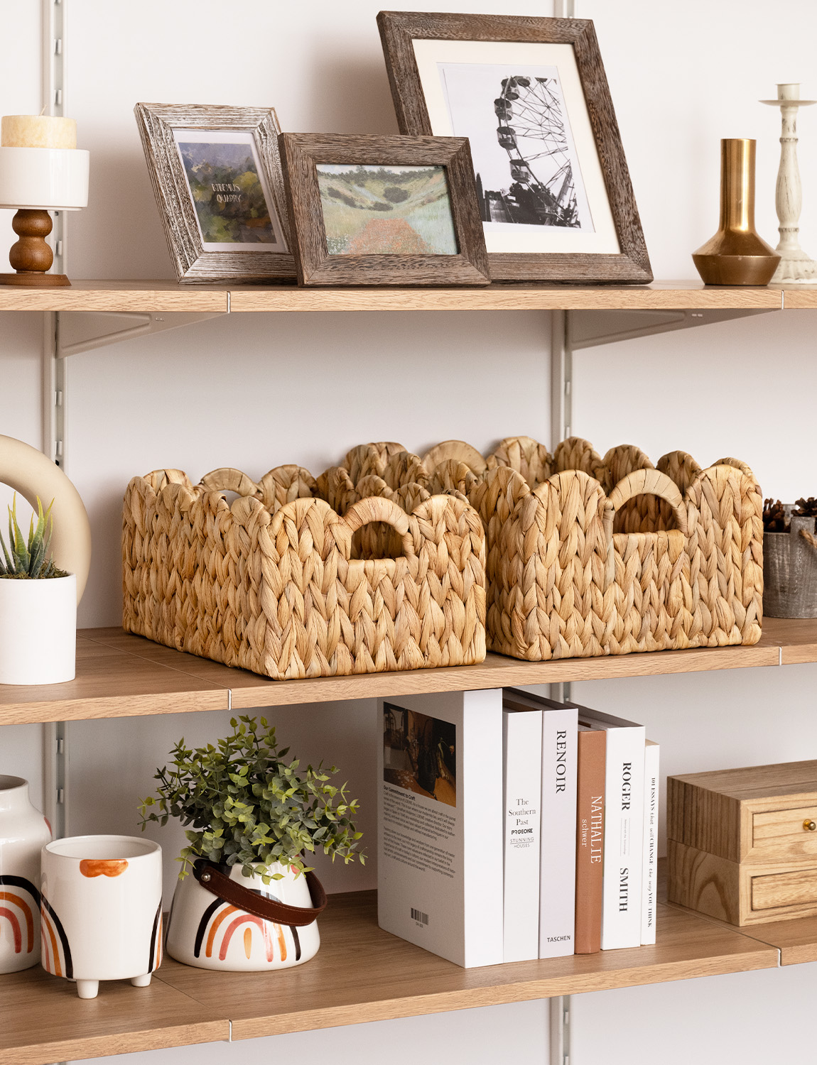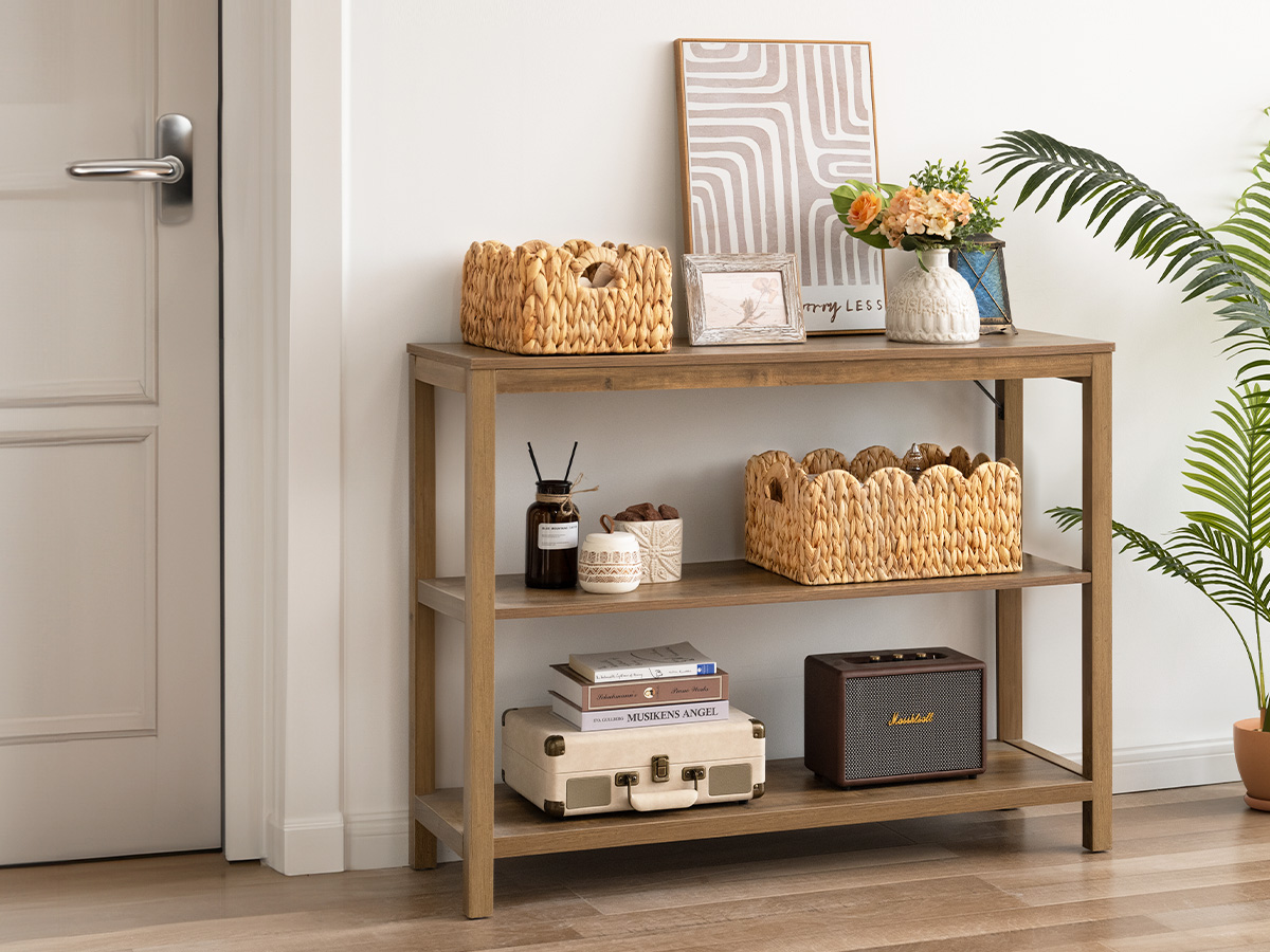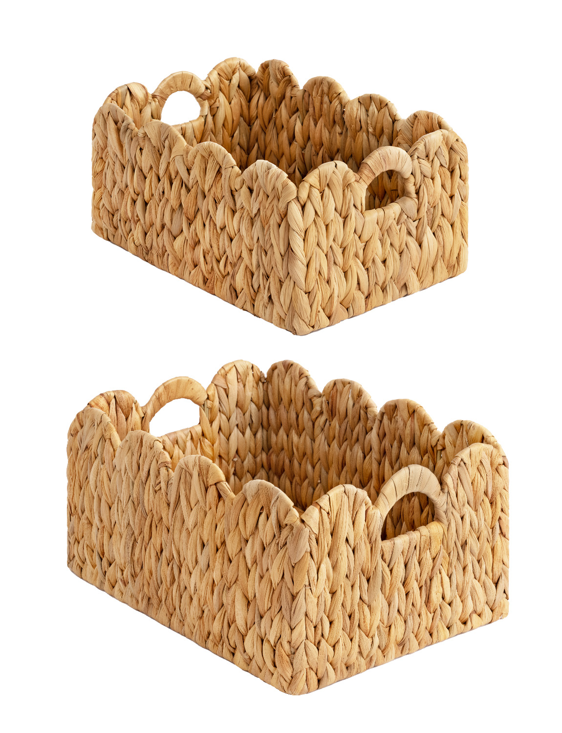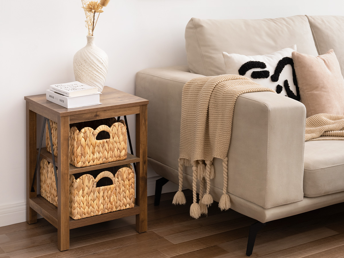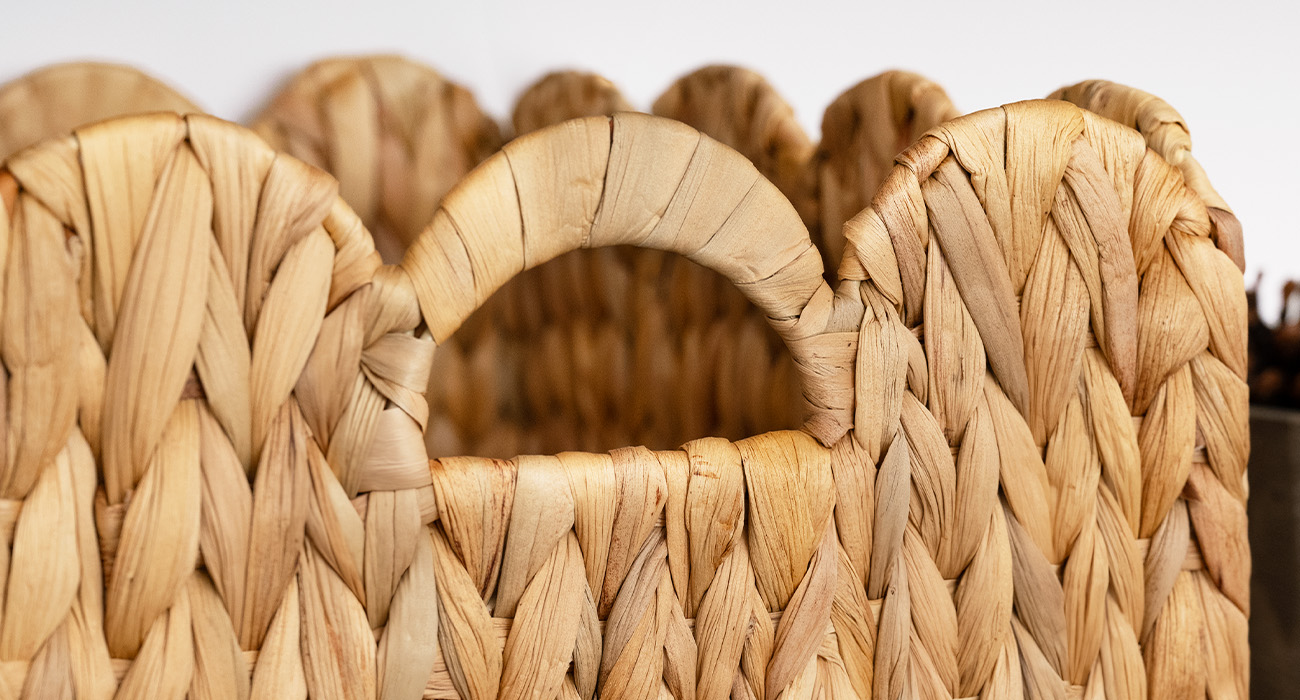 Handwoven from natural water hyacinth, it preserves a warm tactile quality and organic texture. An internal metal frame reinforces the structure and helps maintain its shape over time. With its neutral palette and flexible placement, it fits easily into different interiors, supporting everyday organization while keeping the space calm and natural.