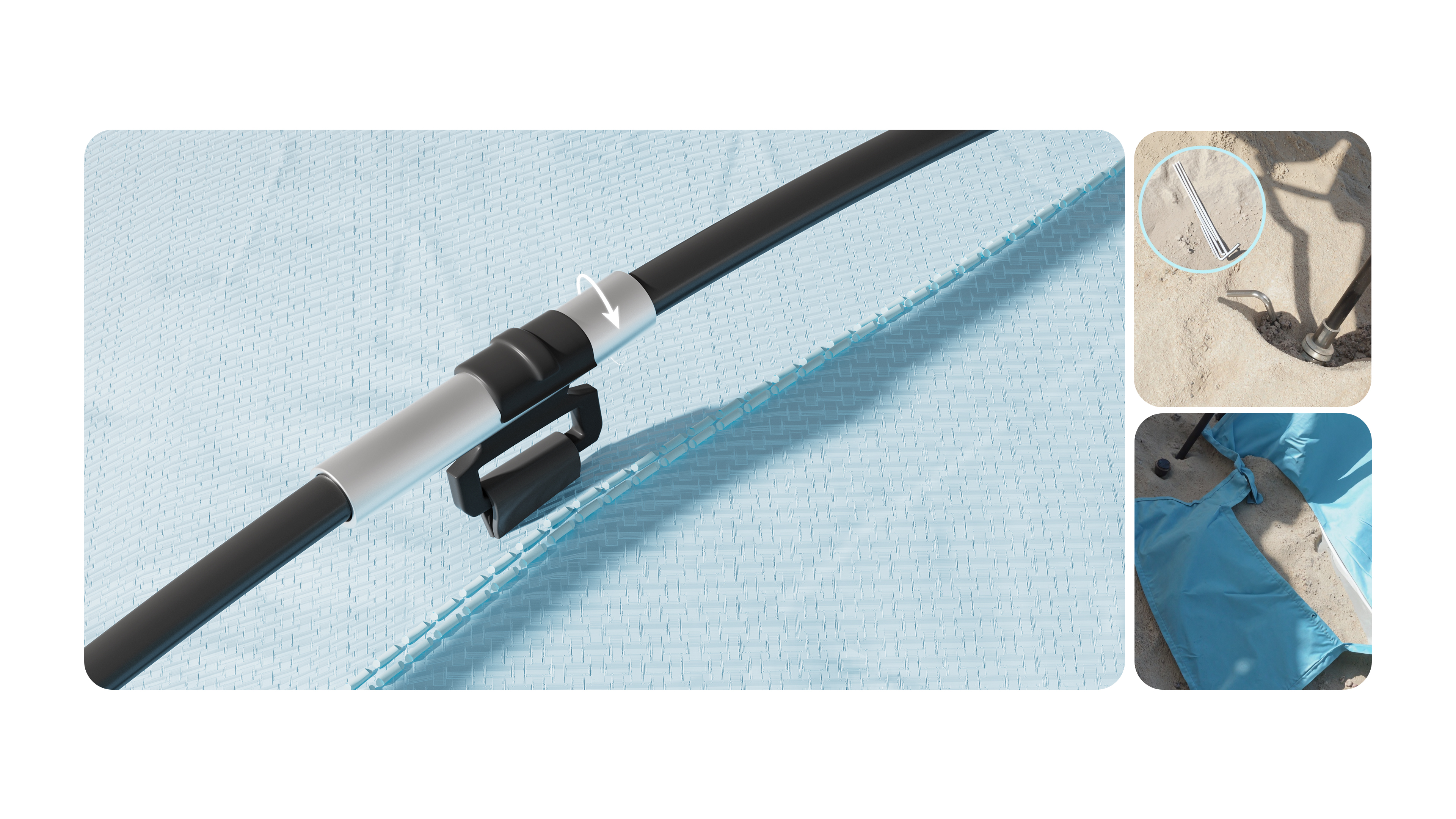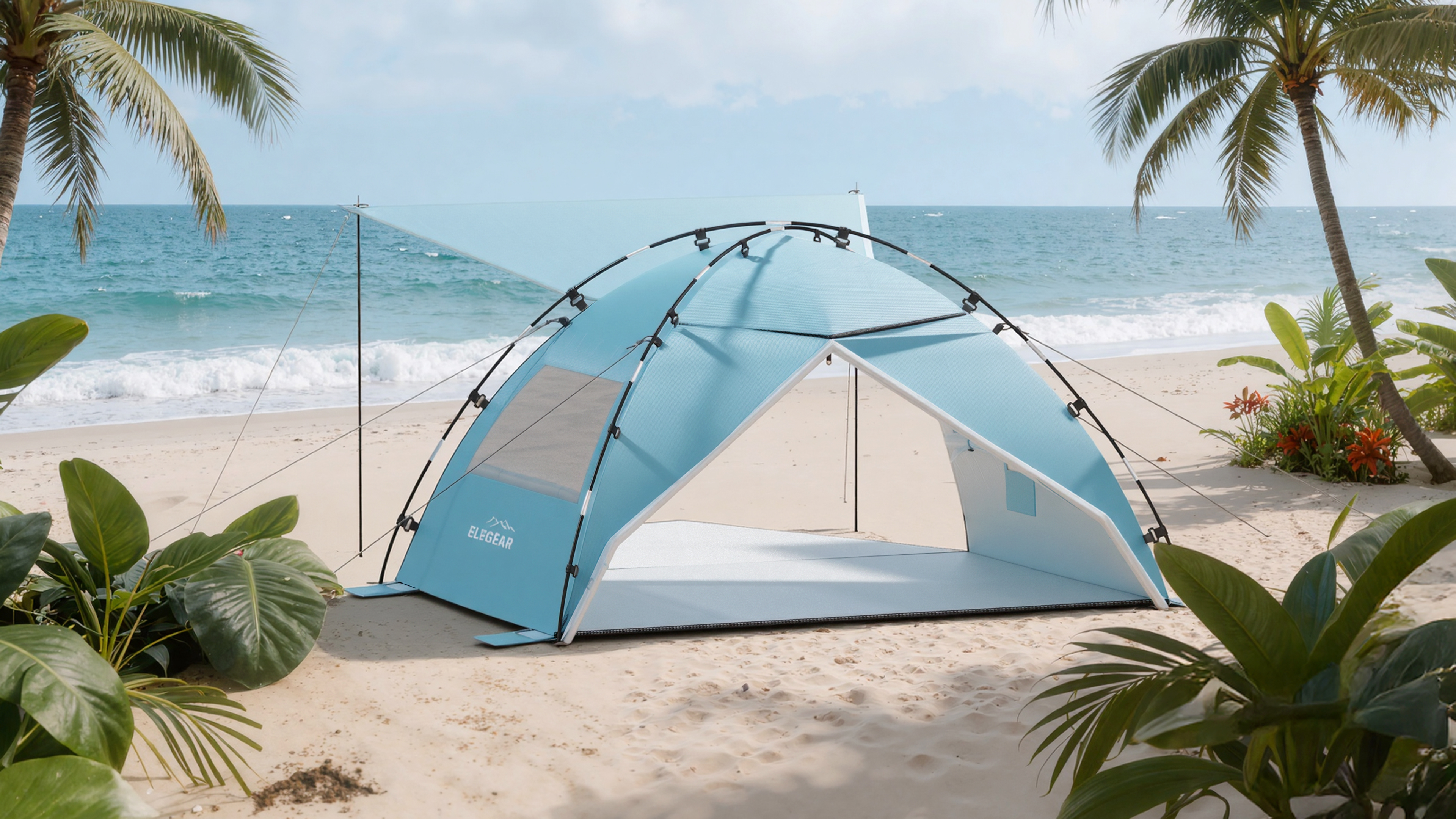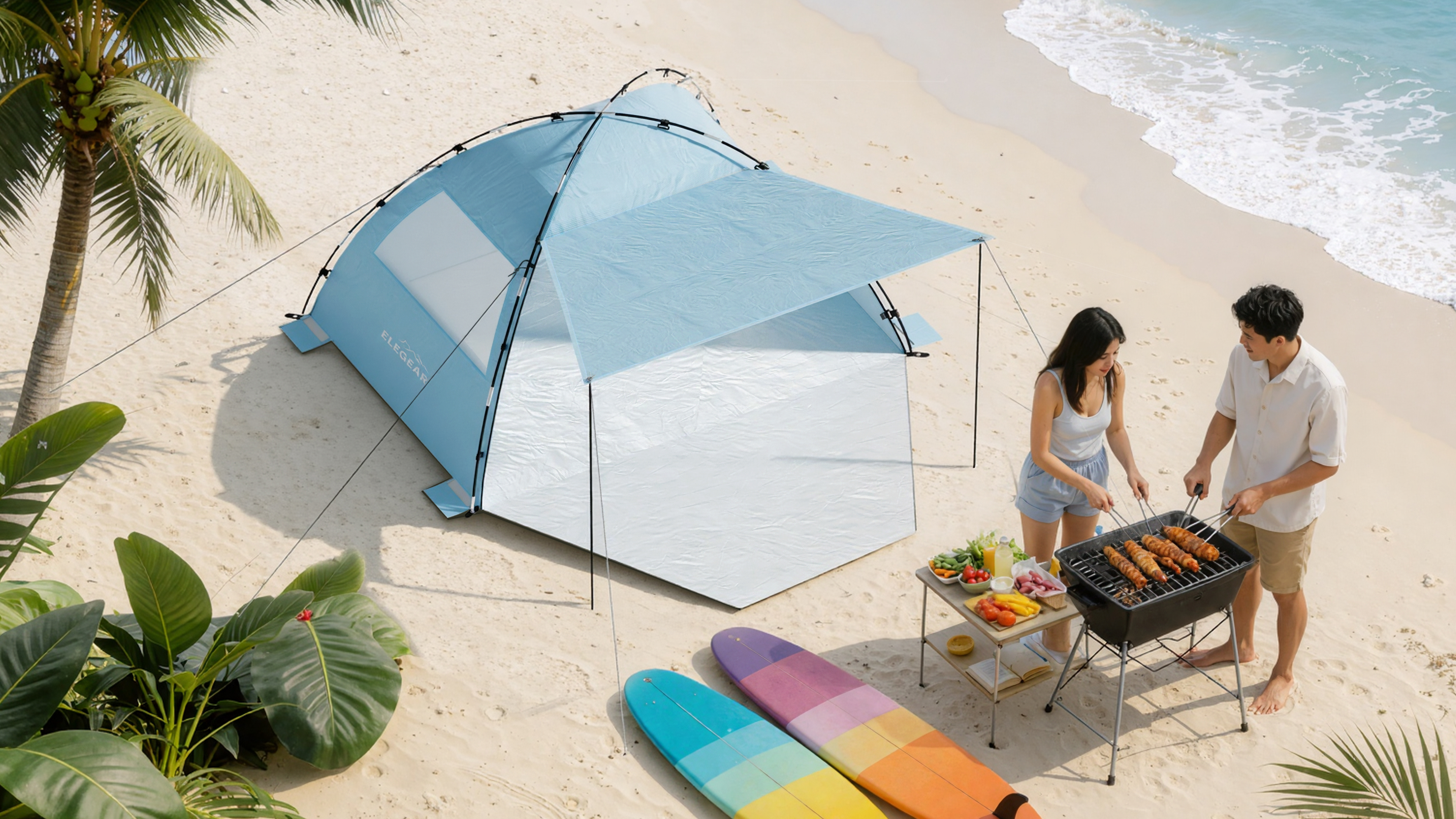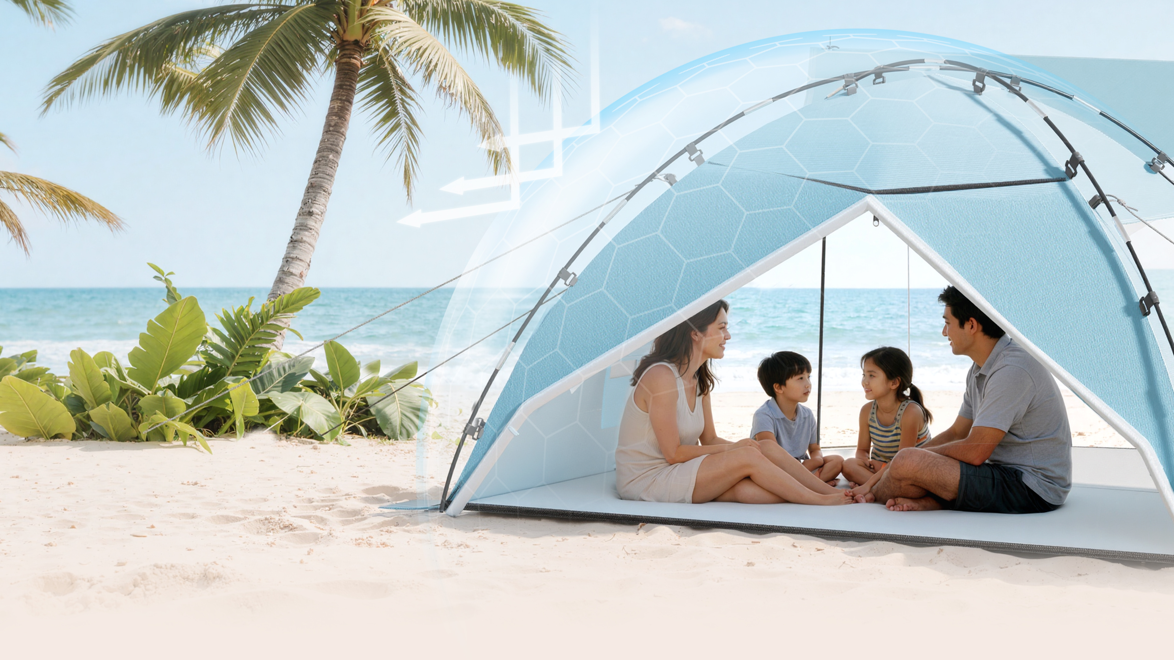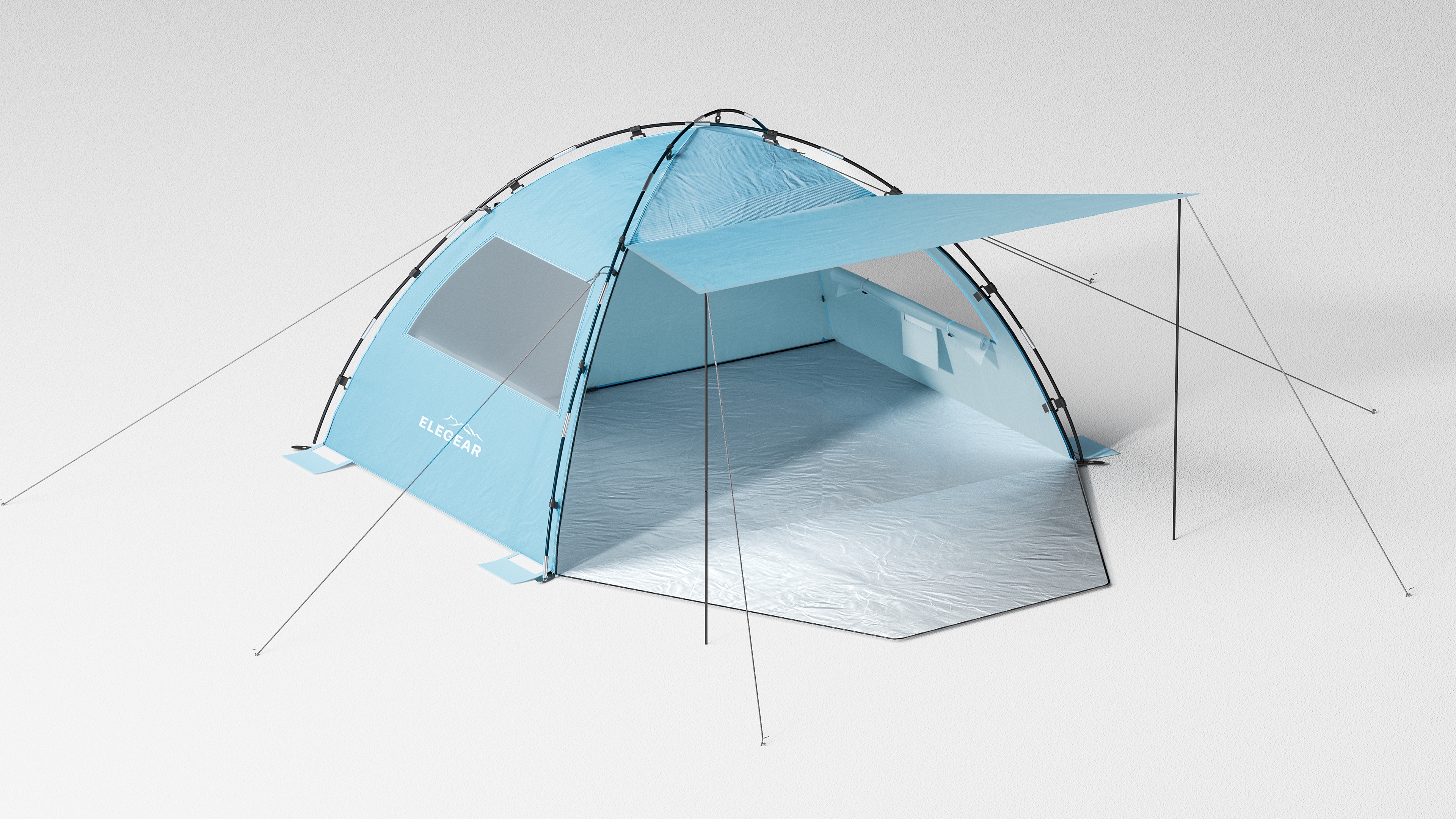 This design focuses on "multi-scenario versatility" as its core concept. Addressing the limitations of traditional beach tents—which often suffer from singular functions and rigid forms—this design introduces an extendable sun canopy and a multi-opening structure. by controlling the combination of the canopy, front and rear doors, and side vents, the tent can transition seamlessly between fully enclosed, semi-enclosed, and open states. This ensures that sun protection, rain resistance, ventilation, and privacy are no longer trade-offs, but dynamic features that adapt to changing environmental conditions. The tent's visual identity is defined by the integration of the sun canopy and the main body structure. Its overall proportions are designed around its expanded footprint, ensuring it maintains a stable and cohesive visual form even when fully deployed. The minimalist sky-blue colorway reduces visual strain in bright environments and helps minimize heat absorption. Furthermore, the overall form utilizes clear structural zoning, allowing users to intuitively understand how to use the tent simply by looking at its exterior. Constructed from 190T double-layer silver-coated polyester, the tent features a UPF 50+ rating, blocking up to 99% of UV rays and effectively reducing internal temperatures for extended beach and camping use. The extendable front canopy expands the shaded area, while the mesh ventilation windows and zippered rear door create a cross-ventilation system, ensuring airflow even when fully shaded. The interior comfortably accommodates 4–5 people, striking an optimal balance between sheltered space and breathable comfort.