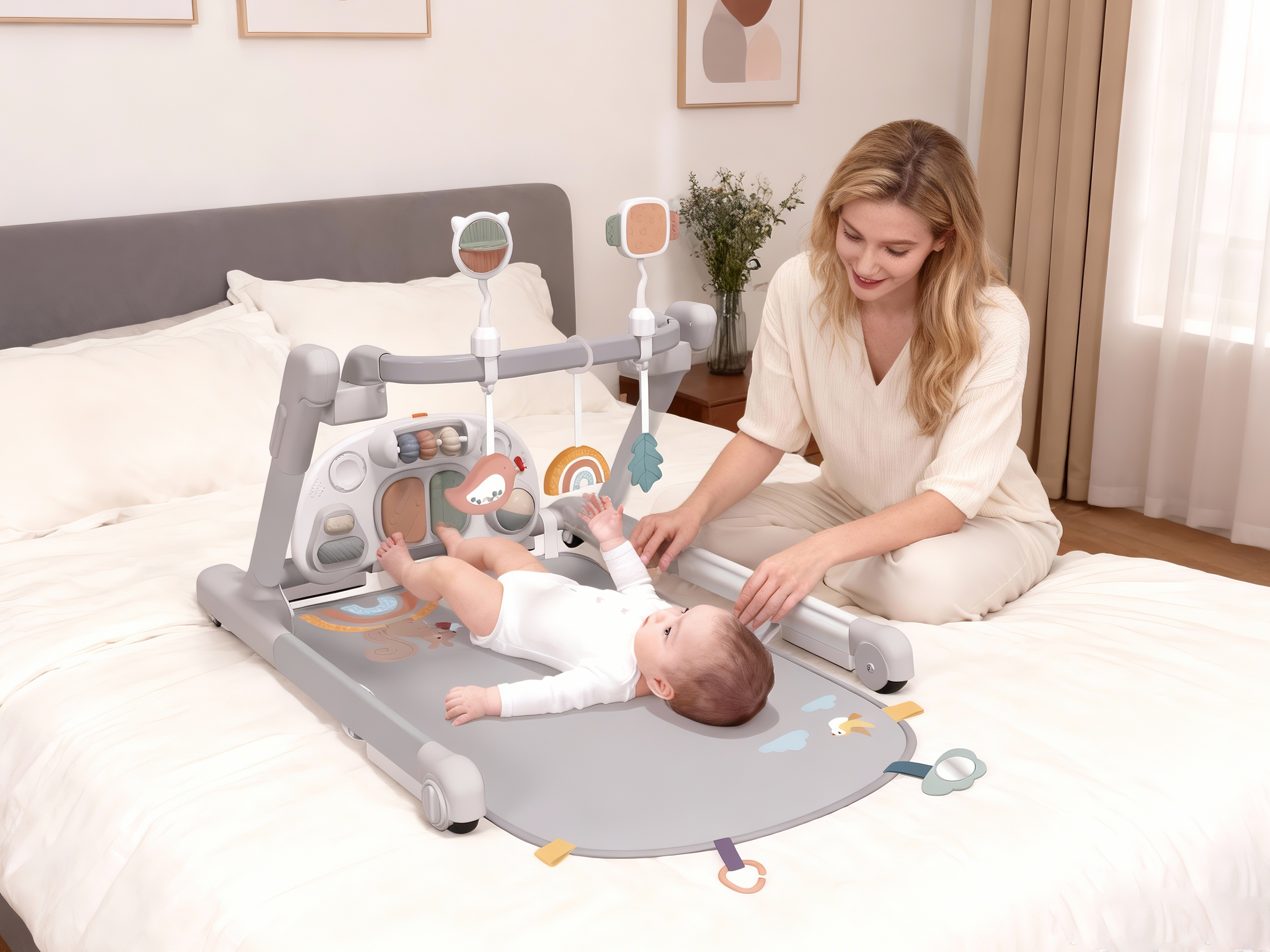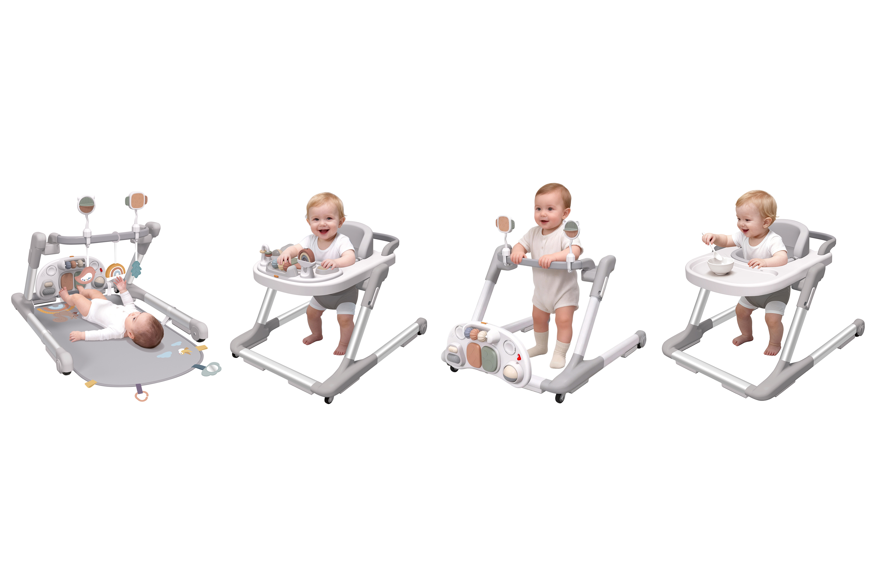 This baby walker boasts an innovative, highly integrated reconfigurable frame that enables quick conversion between four functional modes—baby gym, stable seated walker, hand-push assist walker and feeding chair/table—with no tools required, seamlessly supporting the four key developmental behaviors of lying, standing, moving and eating for infants from birth up to approximately 18 months.