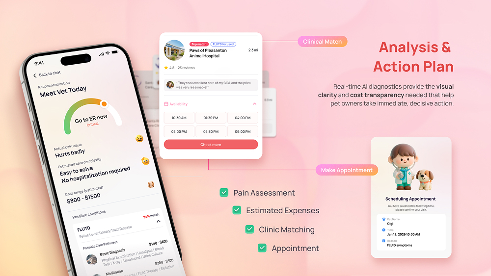 Furever.AI is an all-in-one pet health platform that closes the communication gap between owners and veterinarians through a 24/7 virtual assistant. Using a pre-visit visualization model, the app turns subtle symptoms into clear visual insights and transparent care plans so medical urgency is never delayed by uncertainty or financial stress. Together with a collaborative community ecosystem, Furever.AI gives owners reliable guidance and helps veterinarians strengthen authority, replacing clinical friction with mutual trust and proactive care.