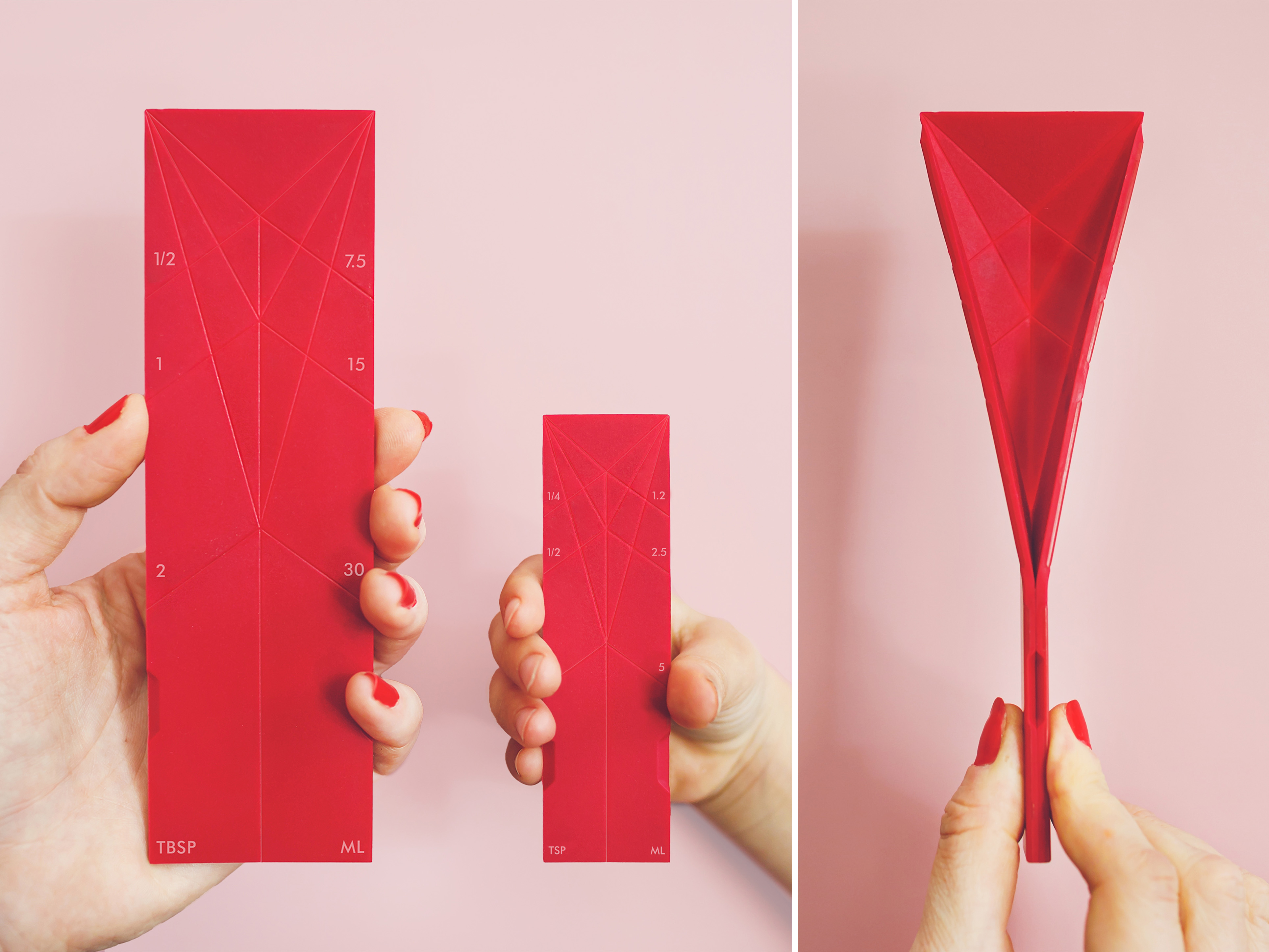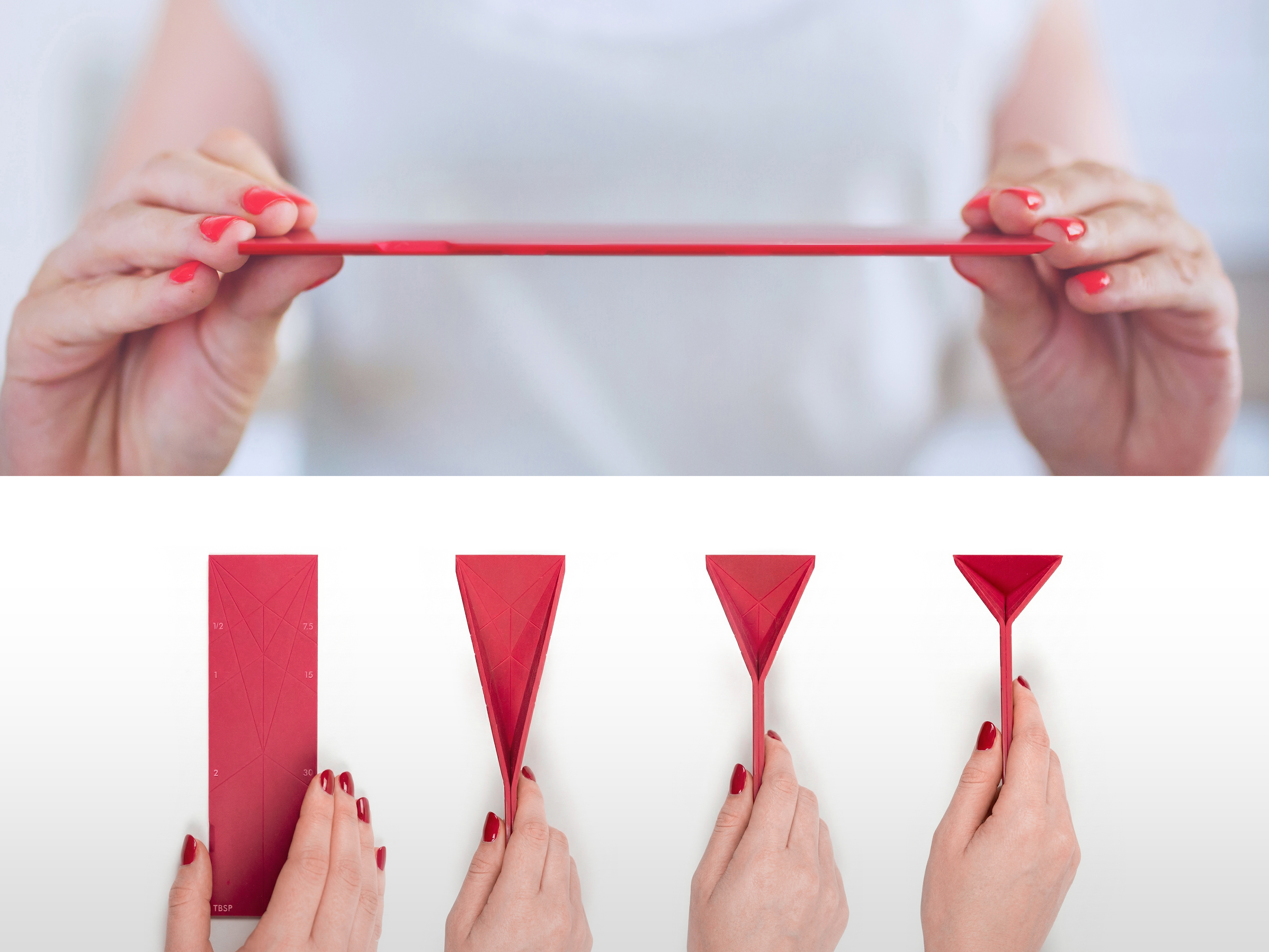 Polygons reinvents a 3000-year-old tool by compressing an entire set of measuring spoons into an origami-flat sheet, just 0.1 inches thin. Using precisely engineered multi-layer live hinges, one pinch along a crease instantly forms the three volumes cooks use most—½ Tbsp, 1 Tbsp, and 2 Tbsp on the large sheet, and ¼ tsp, ½ tsp, and 1 tsp on the small. Inserting a finger into the slotted groove lets the tool spring back to its bookmark-flat form, ready to clean in a single wipe. Hidden magnets allow it to live on the fridge, within reach and never lost in a drawer.