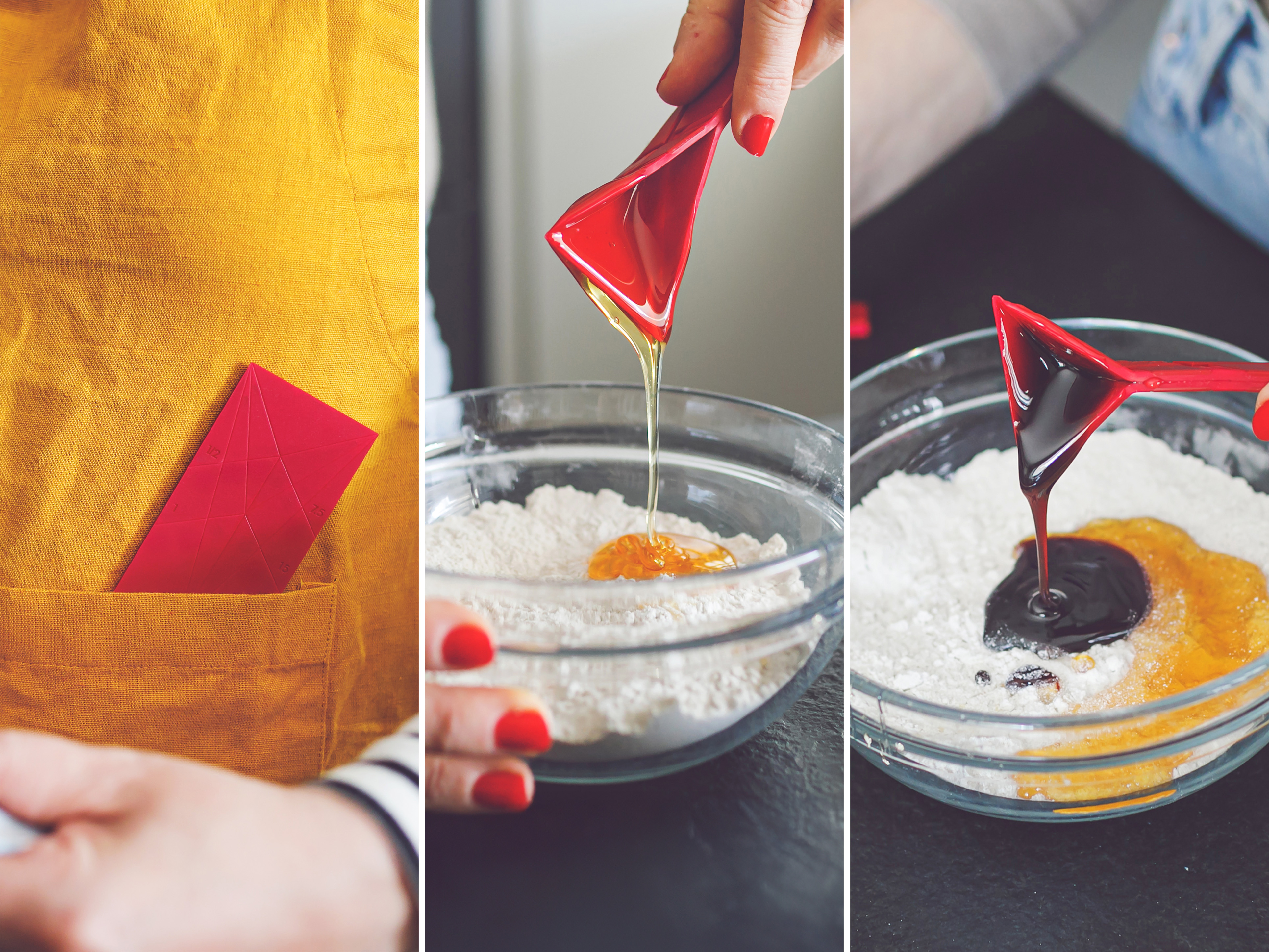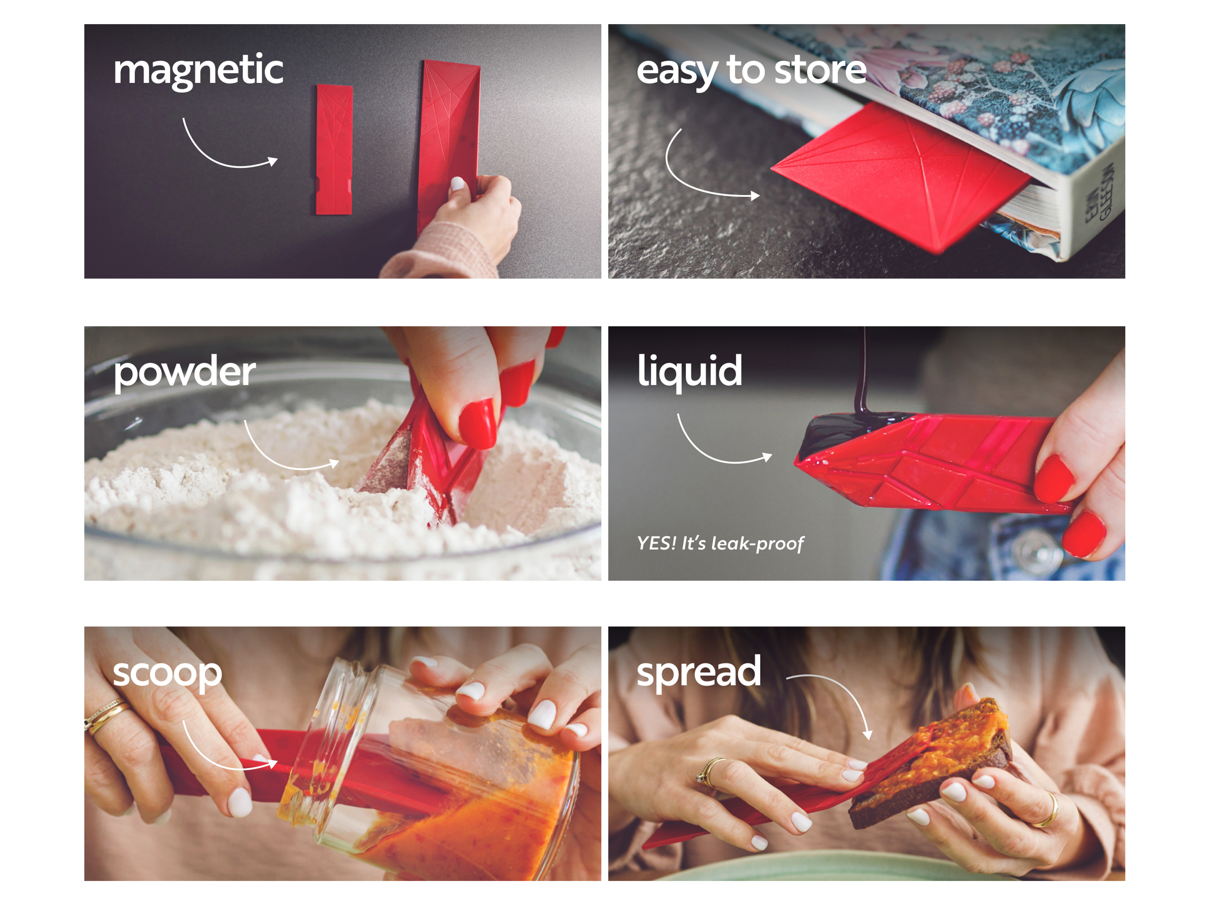 Polygons measures both wet and dry ingredients with extreme accuracy. Its flattening feature eliminates the "leftover struggle": after scooping, the rigid triangular bowls flatten to help in spreading or scraping sticky ingredients, reducing food waste dramatically. The slim profile slides into cookbooks or any drawer, and the flat face rinses in seconds, saving water and soap. With it's proprietary DuraBend technology, it is built to endure more than 100,000 bending cycles, it offers decades of reliable performance.