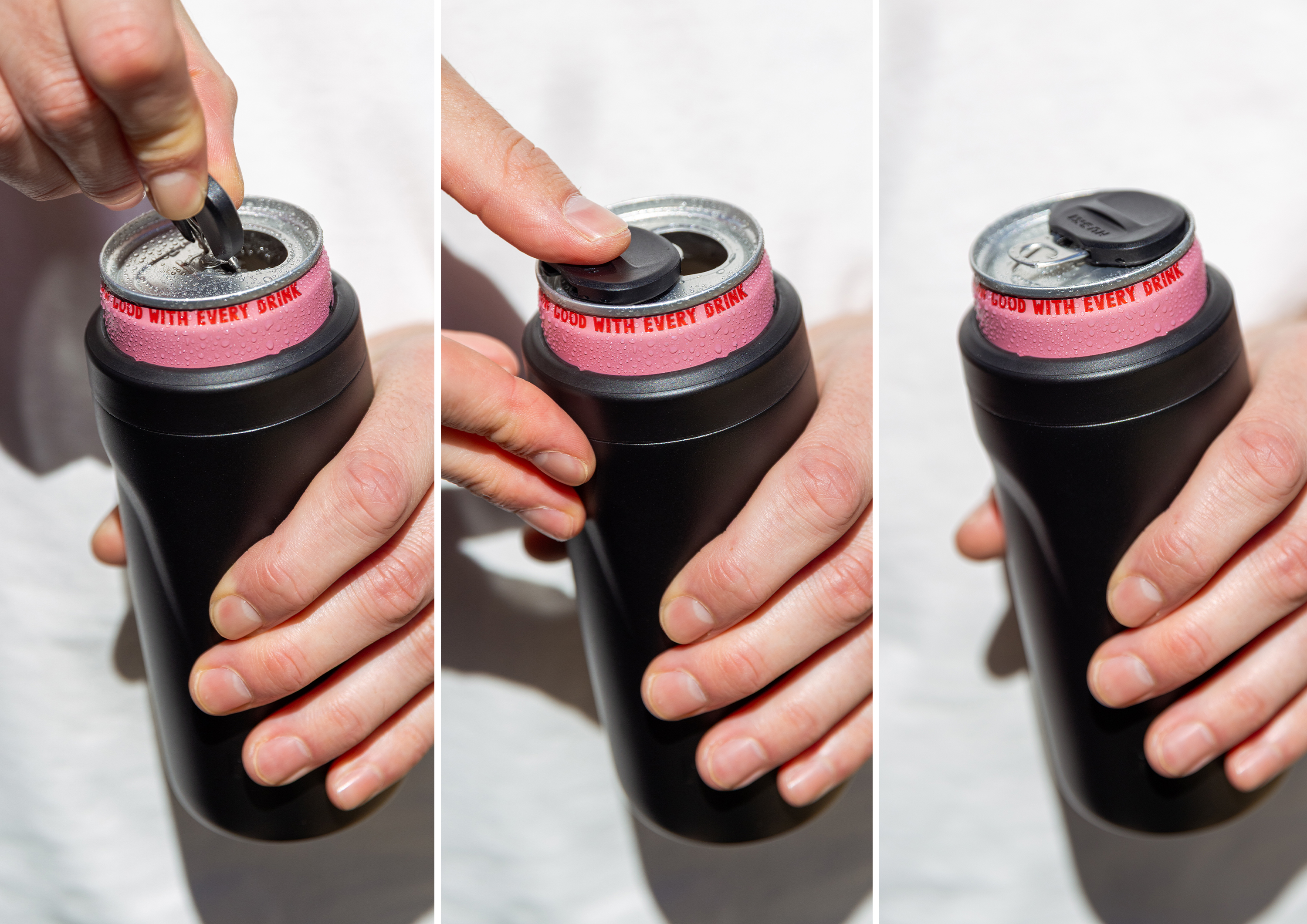 Integrated into the base is a patent-pending detachable 2-in-1 Can Tab Slider that opens cans without damaging nails, then doubles as a splash-resistant cover to help protect your drink from wasps, flies and sand.