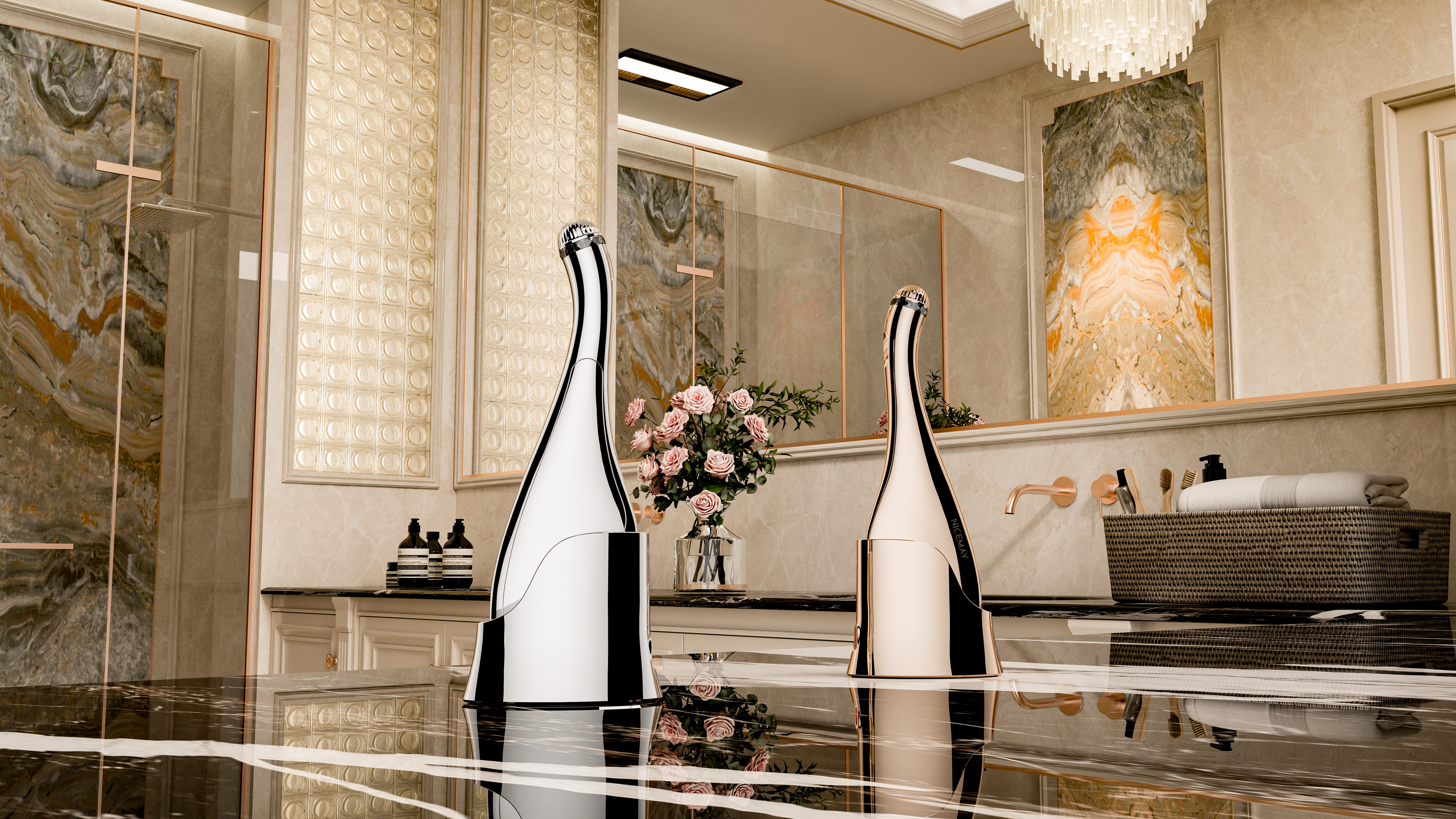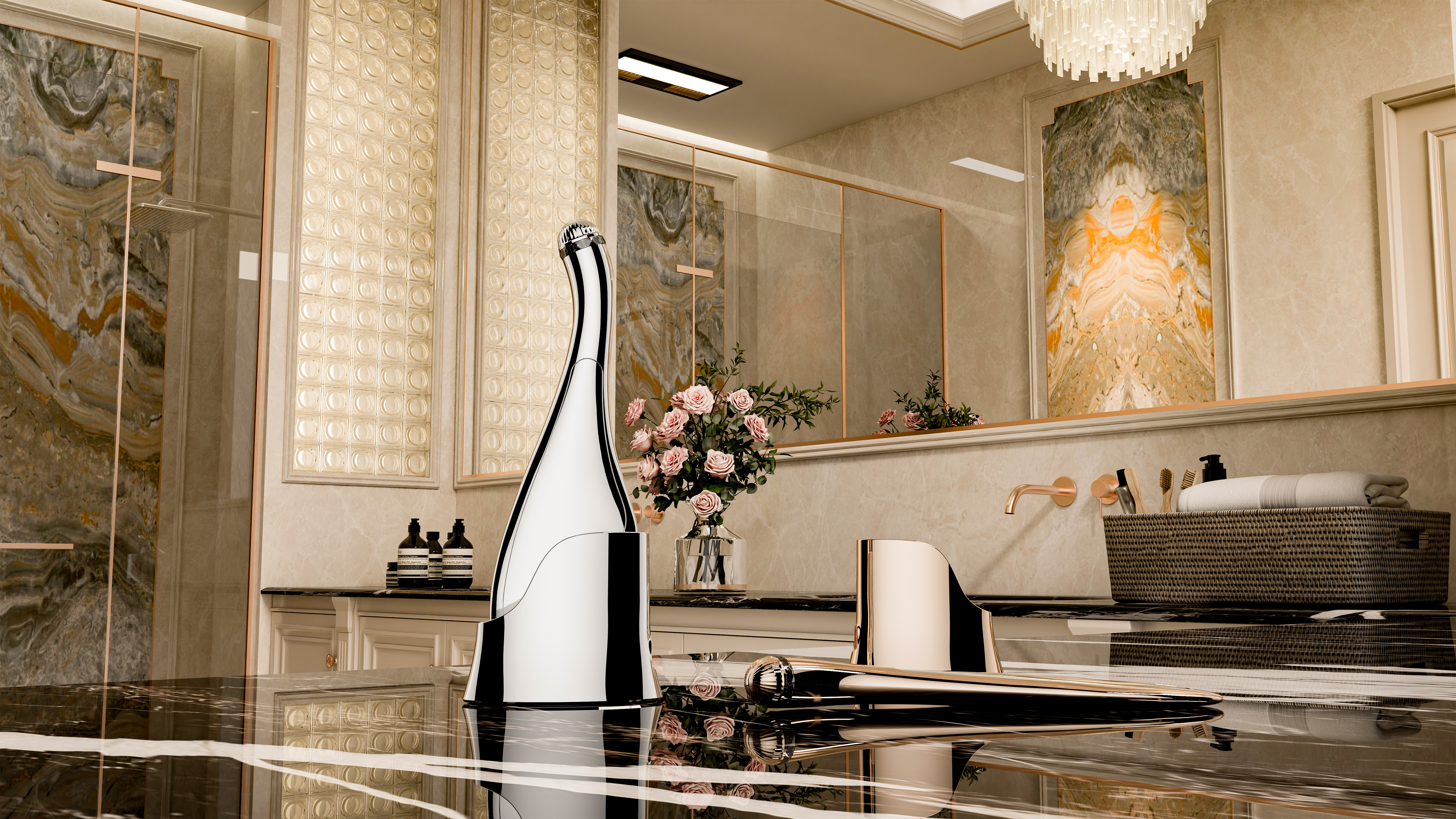 This procedural control is primarily realized through its streamlined, wing-shaped V-contour. The geometry translates primary lifting paths into a physical guide; variations in surface width and continuous curvature create a stable contact band upon skin contact, naturally constraining gliding angles and directions to eliminate manual errors. The body is crafted from electroplated silver zinc alloy, balancing structural rigidity with stable conductivity. A high-polish surface reduces skin friction for a seamless glide, while conductive and insulated zones are clearly separated to concentrate energy at the electrodes. A silicone cushioning layer further stabilizes pressure distribution. This unified aesthetic derives from structural integration rather than decorative layering, featuring a seamless construction that achieves an IPX6 waterproof rating for safe use and effortless cleaning.