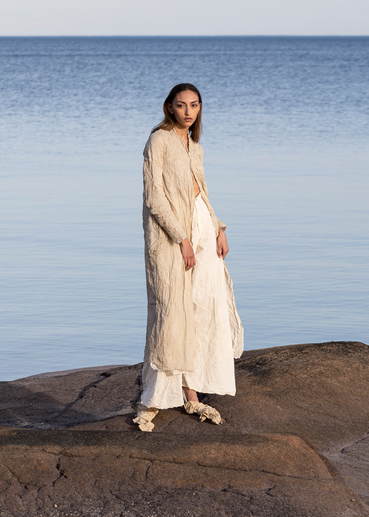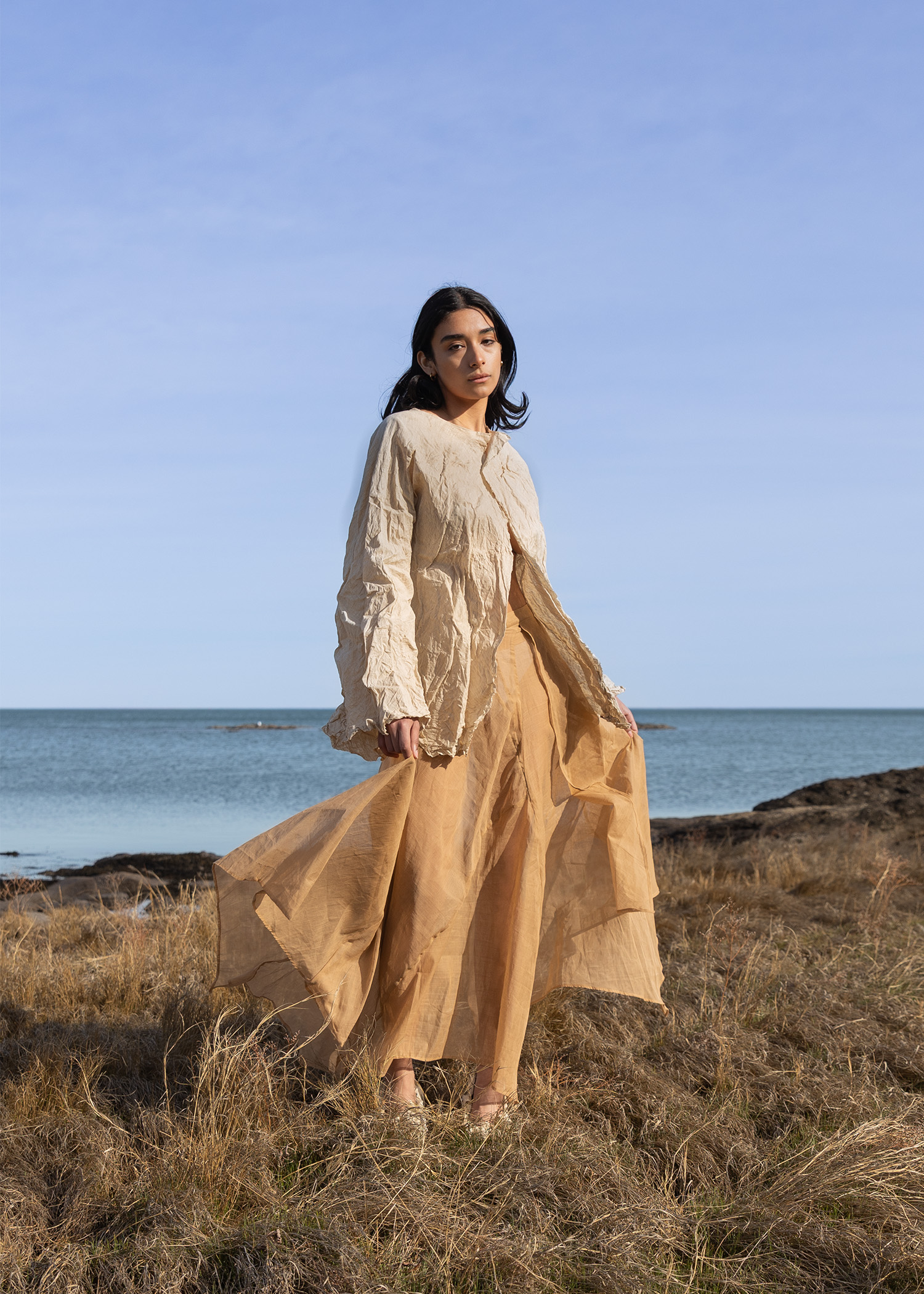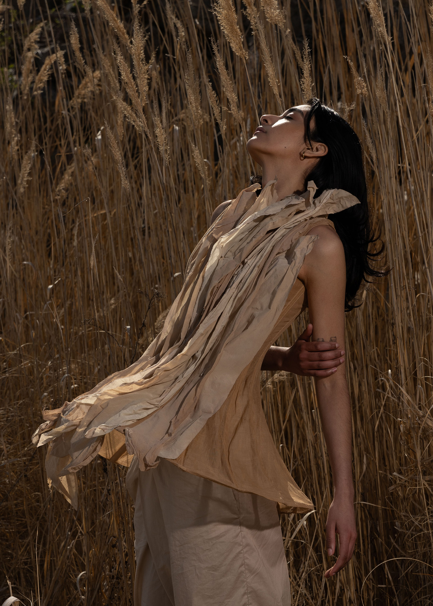 Zoen (landscaper in Japanese) embodies the art of landscaping the garden of life, capturing beautifully the art of intentionally crafting an inner and outer world that nurtures a balance between self-reflection and the inherent disorder of everyday existence. Much like a Zen garden, where every rock, ripple of sand, and blade of grass is thoughtfully placed to evoke stillness and contemplation, Zoen symbolizes the conscious act of designing one’s life in harmony with both the serene and the tumultuous aspects of the human experience. Rooted in the belief that fashion is a space for reflection, resistance, and renewal. Natasha approaches design as a collaborative dialogue between material and maker, body and form, past and future. She intentionally works with salvaged or naturally derived materials, allowing their history and texture to shape the silhouette. Each garment emerges from an intuitive process that honors the quiet language of fabric: how it collapses, crinkles, and reshapes with time, gravity, and touch.
