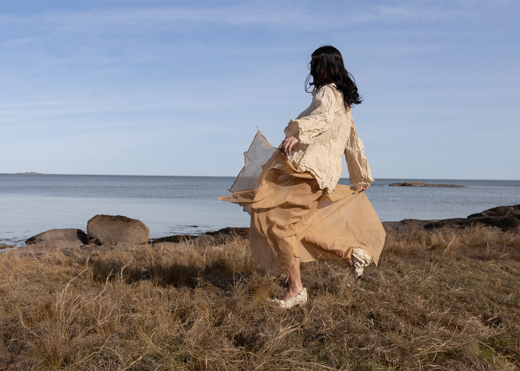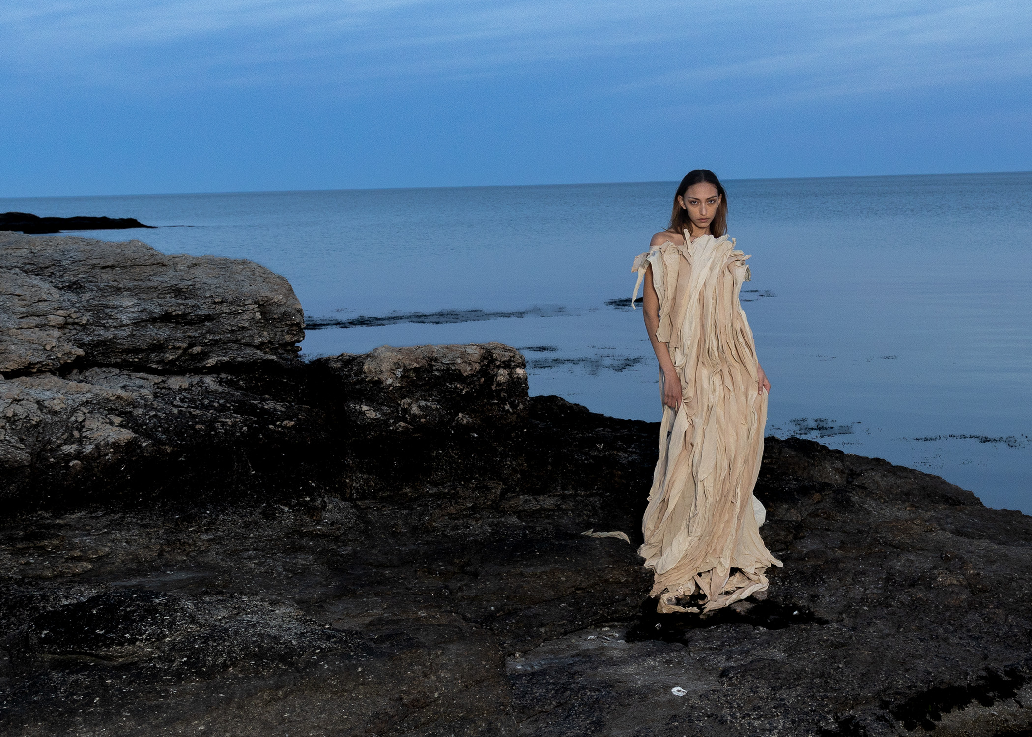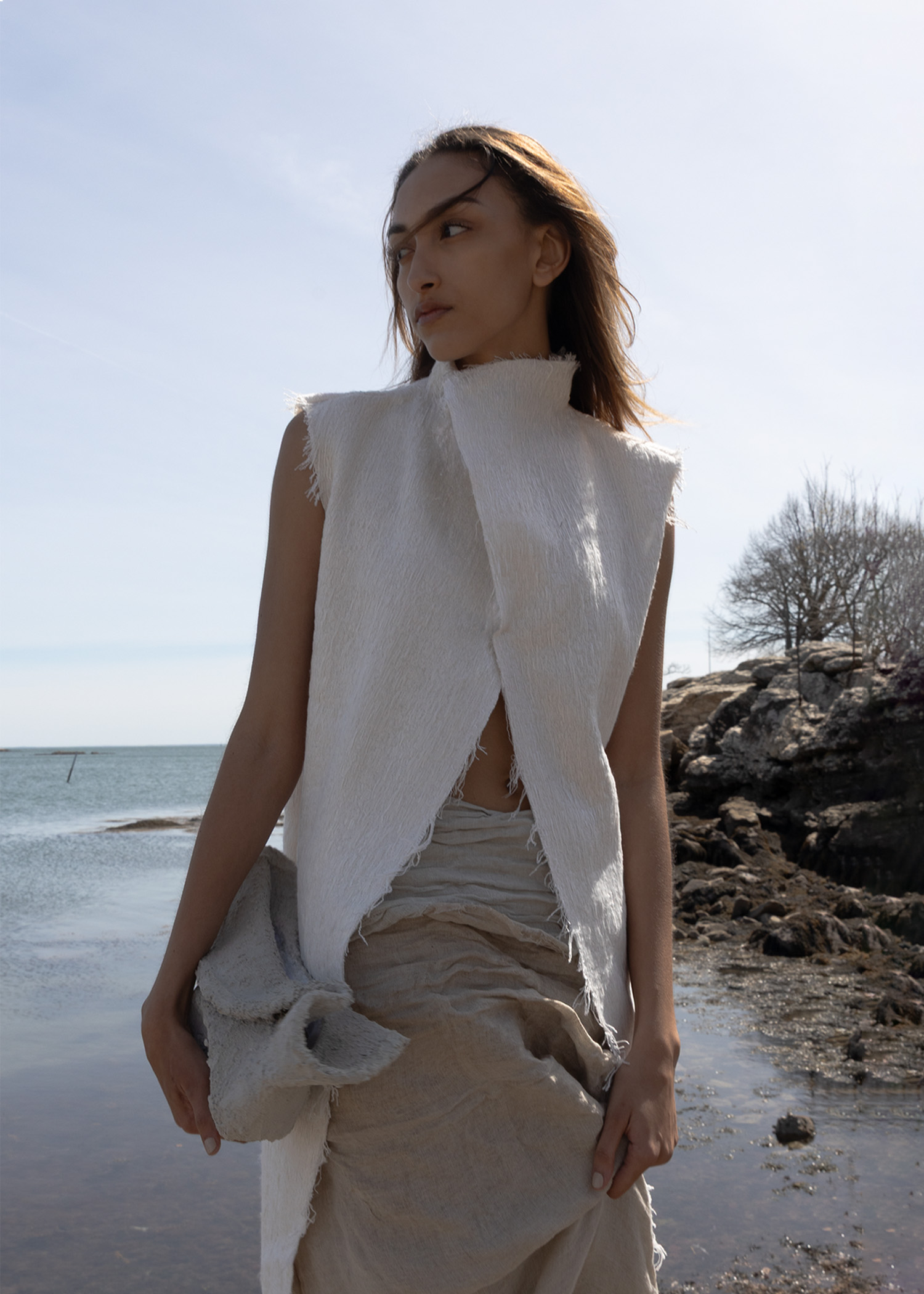 Zoen (landscaper in Japanese) embodies the art of landscaping the garden of life, capturing beautifully the art of intentionally crafting an inner and outer world that nurtures a balance between self-reflection and the inherent disorder of everyday existence. Much like a Zen garden, where every rock, ripple of sand, and blade of grass is thoughtfully placed to evoke stillness and contemplation, Zoen symbolizes the conscious act of designing one’s life in harmony with both the serene and the tumultuous aspects of the human experience. Rooted in the belief that fashion is a space for reflection, resistance, and renewal. Natasha approaches design as a collaborative dialogue between material and maker, body and form, past and future. She intentionally works with salvaged or naturally derived materials, allowing their history and texture to shape the silhouette. Each garment emerges from an intuitive process that honors the quiet language of fabric: how it collapses, crinkles, and reshapes with time, gravity, and touch.