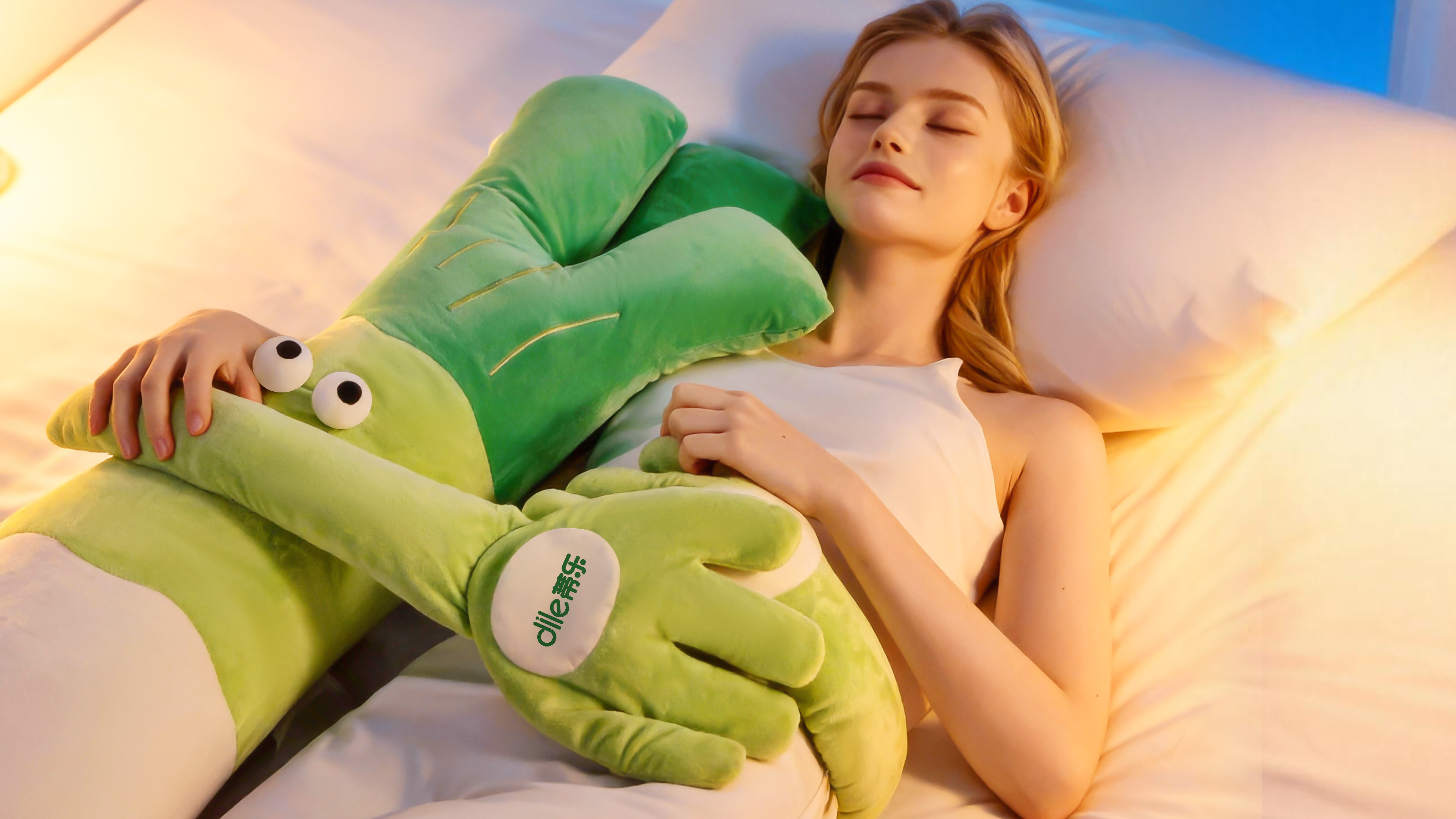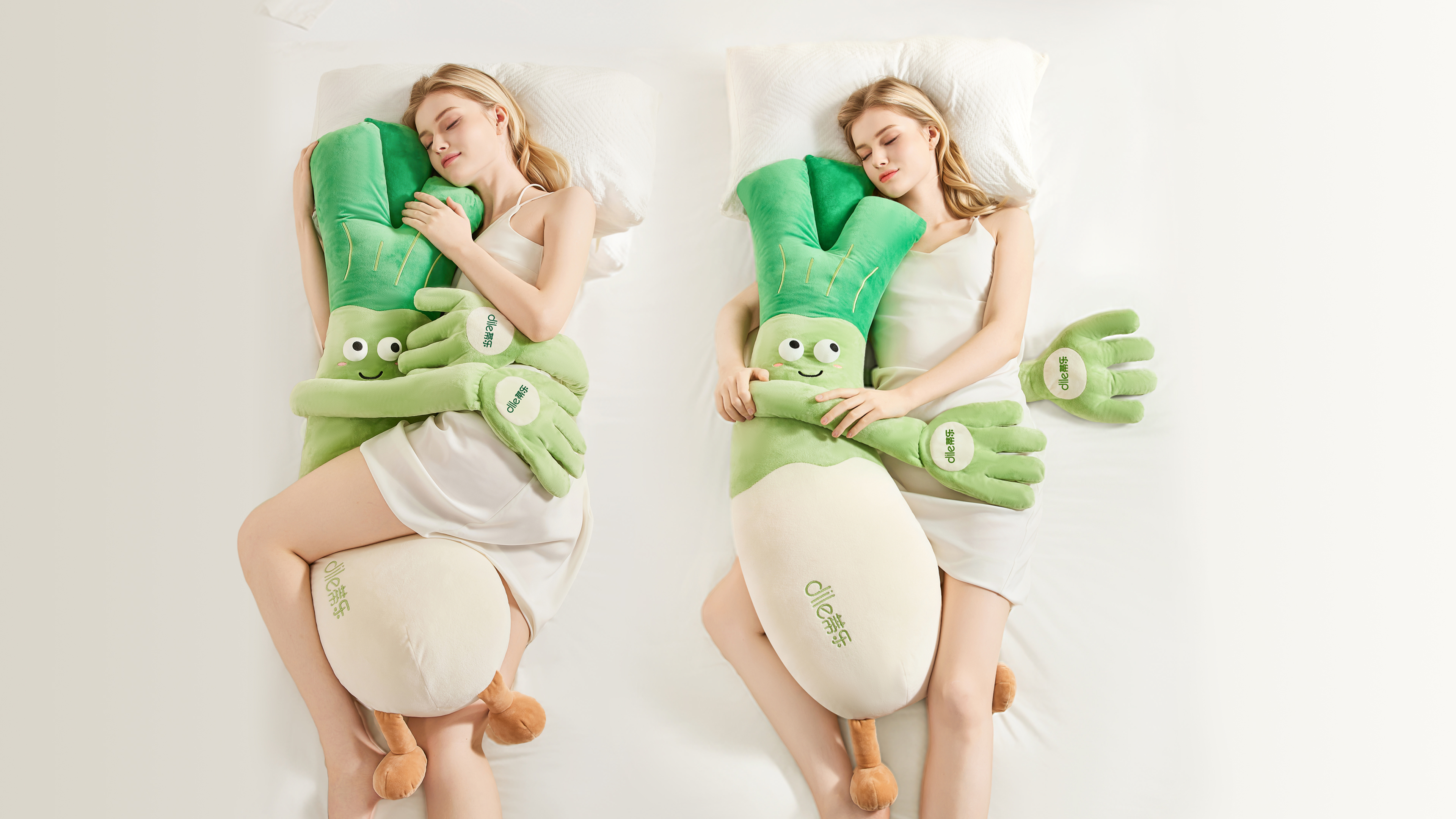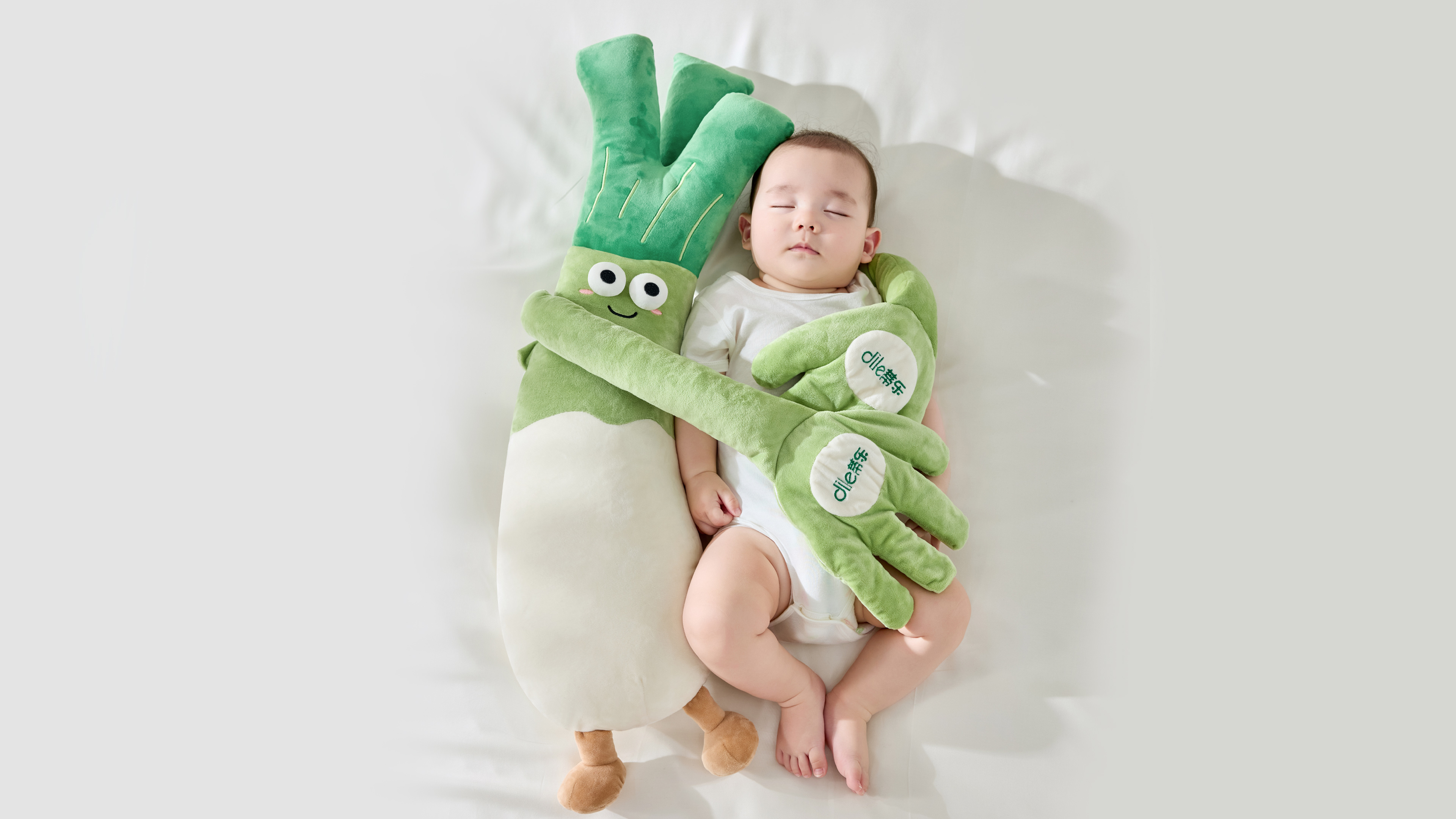 The scallion-inspired design draws from Chinese cultural symbolism, where “scallion” is a homophone for “cleverness,” representing parents’ hopes for their children’s bright future. With its gentle green color and playful form, the pillow becomes not only a functional product but also a comforting companion during early childhood.