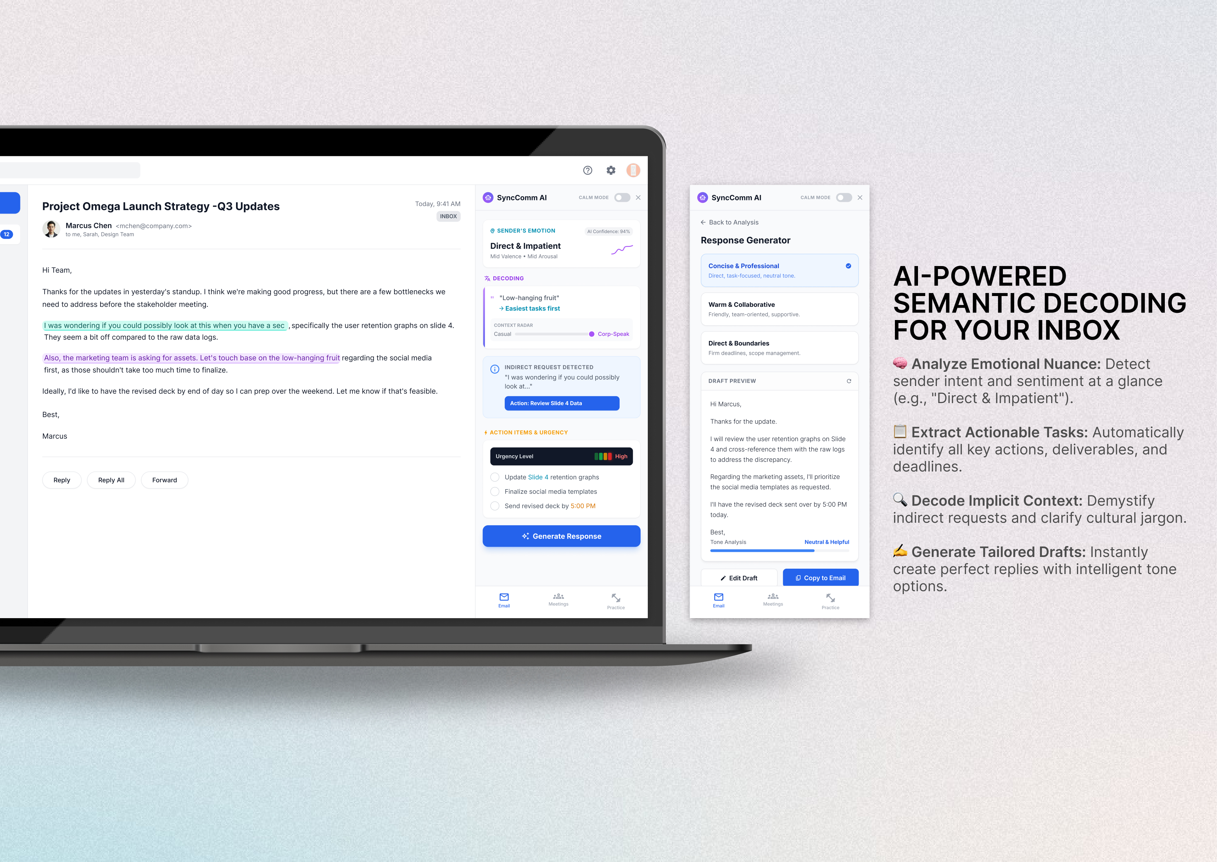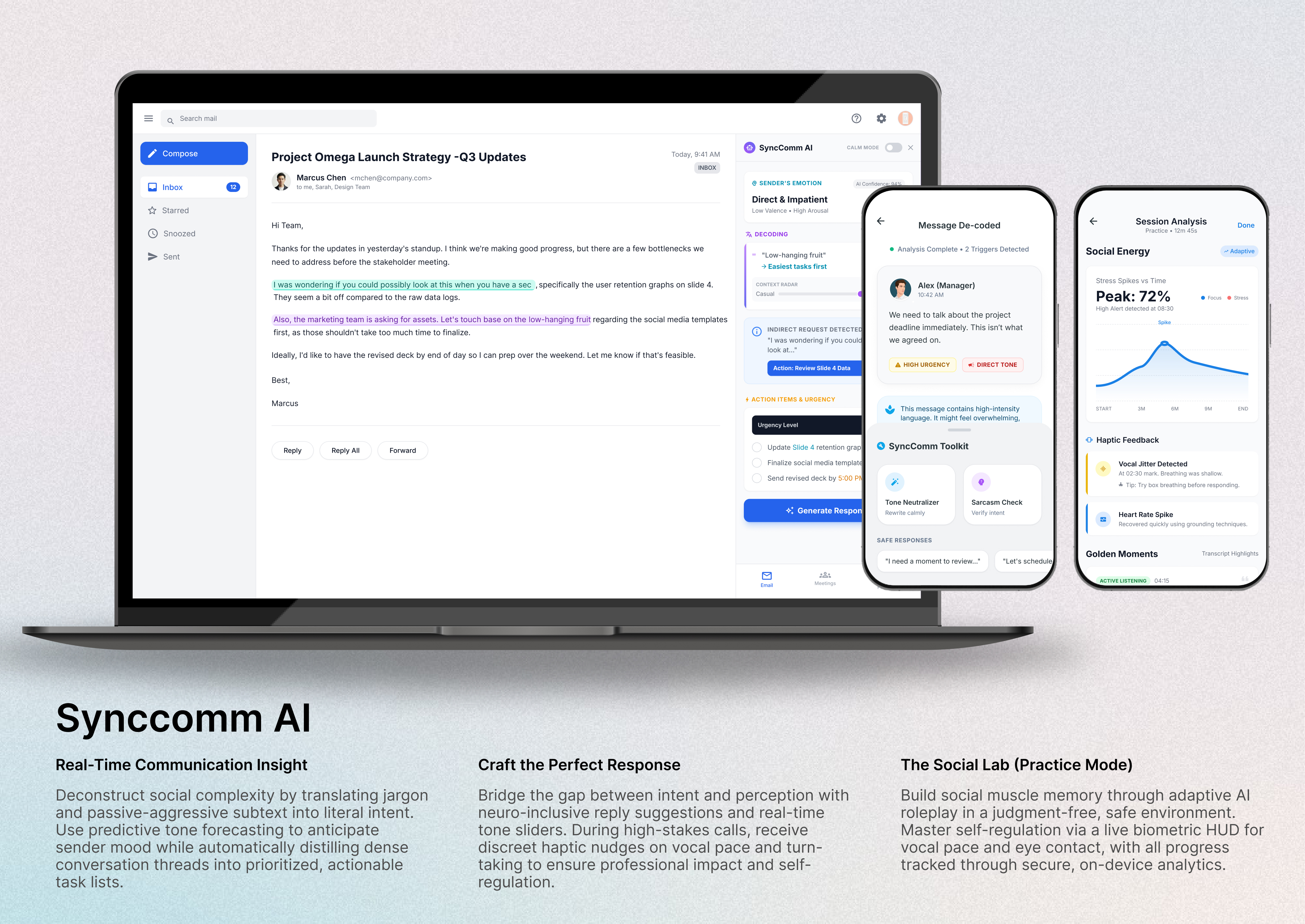SyncComm AI is a "prosthetic executive function" designed to help neurodivergent professionals navigate the unwritten social rules of the workplace. By prioritizing Empathy over Efficiency and Autonomy over Automation, the platform reduces the "Double Empathy Problem"—the mutual misunderstanding between neurodivergent and neurotypical individuals—through real-time decoding and emotional regulation.