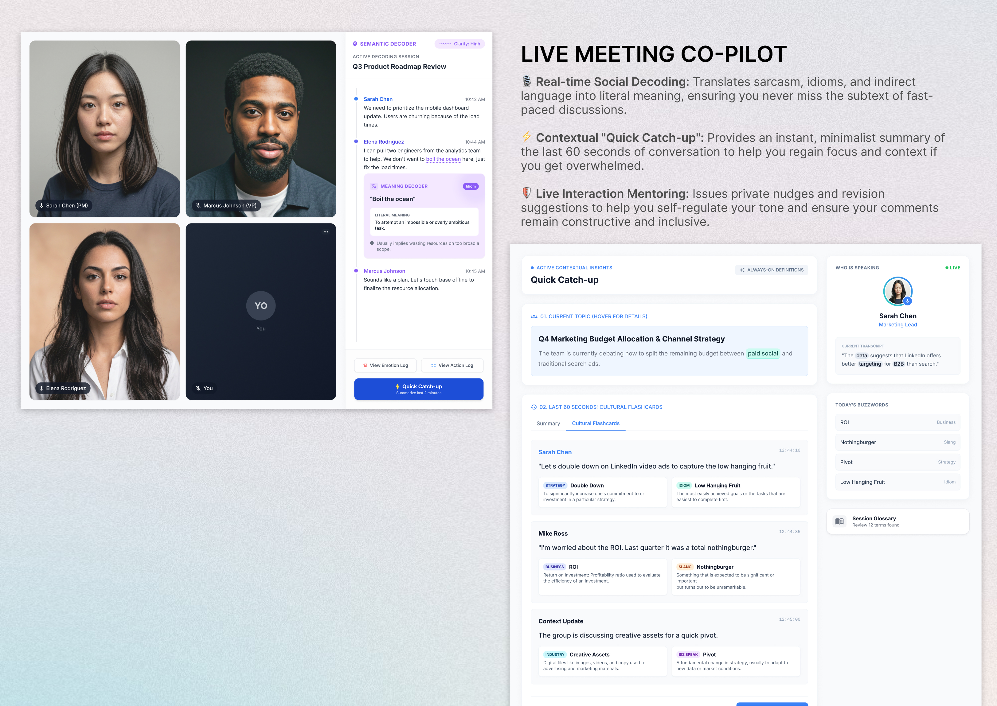 Meeting Support: This live "social prosthetic" provides a Contextual "Quick Catch-up"—a minimalist summary of the last 60 seconds of conversation—and Real-time Social Decoding to clarify subtext during active meetings.