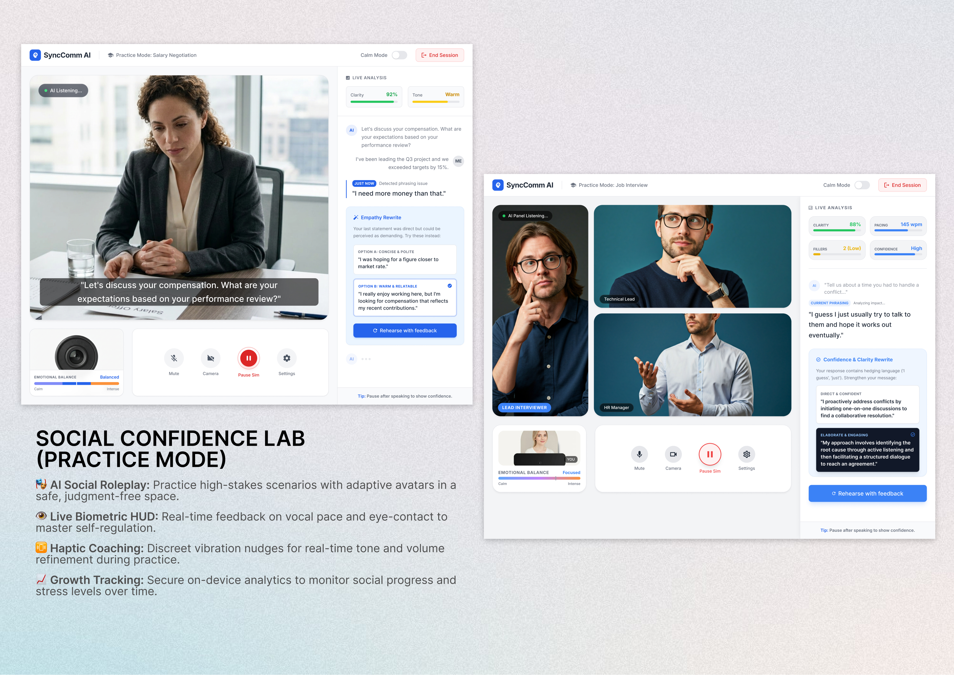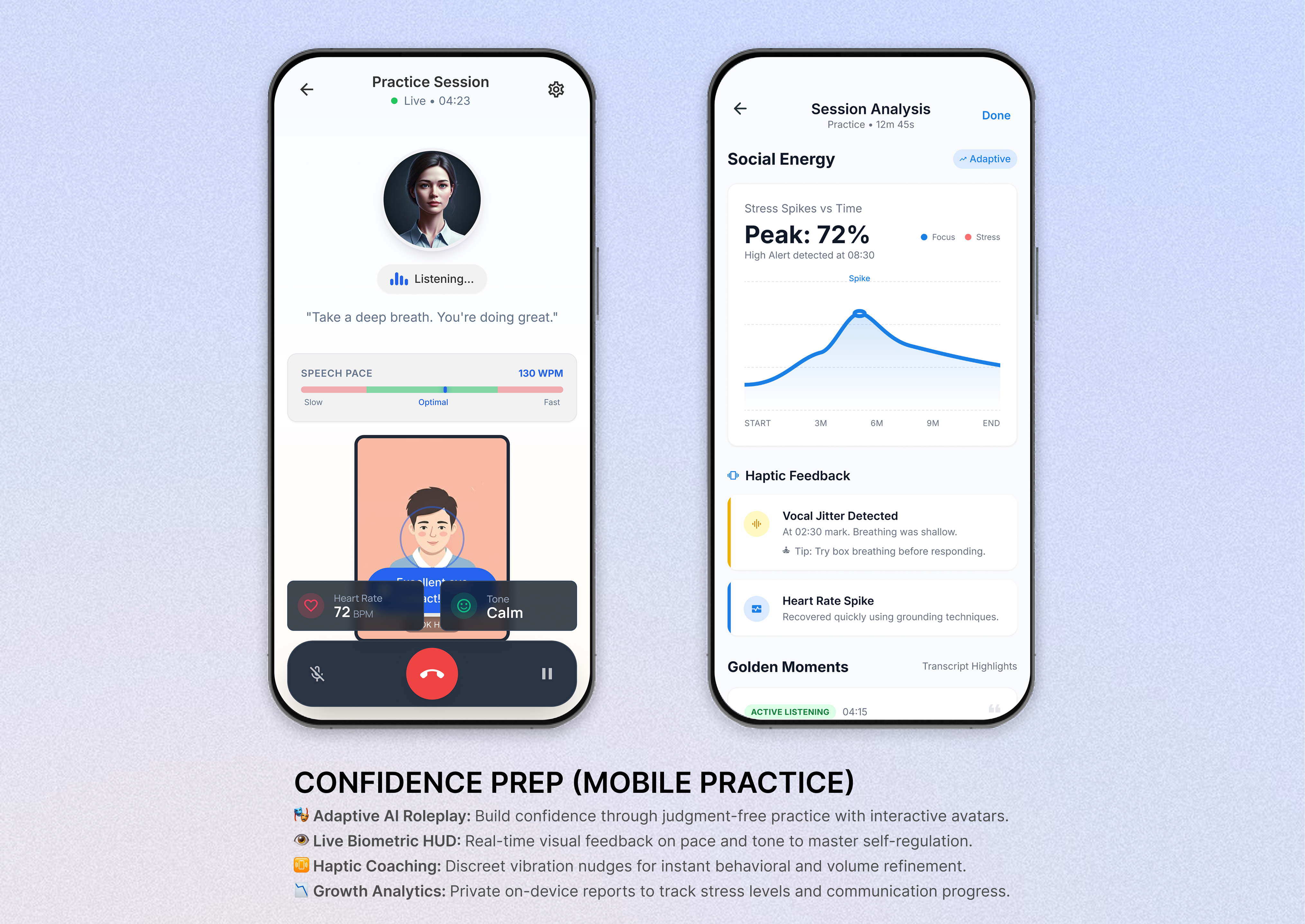 Practice Mode: A "flight simulator" for social interaction, offering on-demand role-playing with realistic "push-back" AI avatars to build confidence before high-stakes moments like salary negotiations.