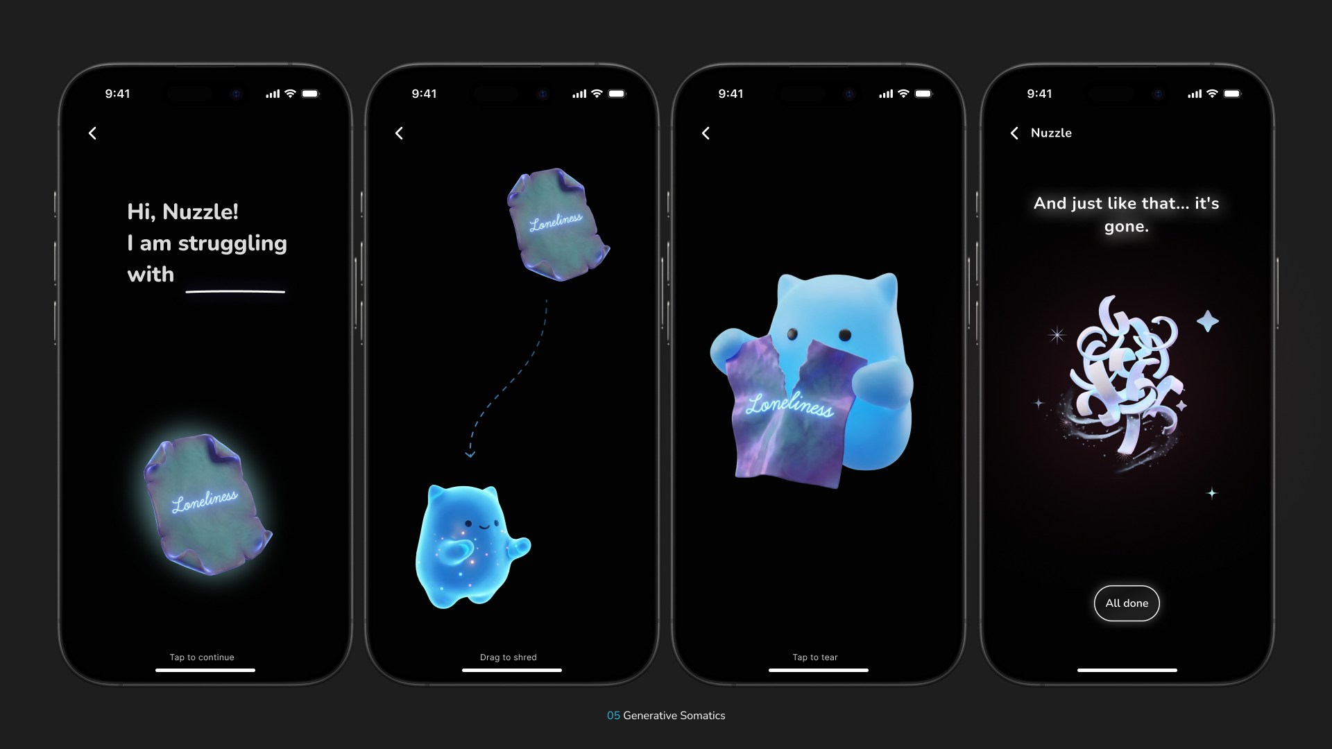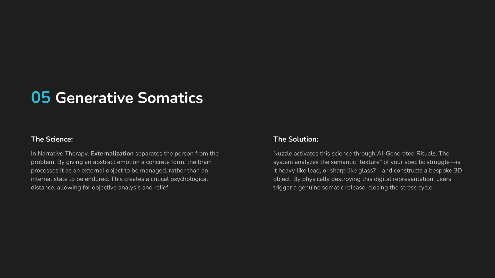 Nuzzle is a voice-first therapeutic companion that redefines mental healthcare through "Generative Somatics." Unlike static wellness apps that offer generic tools, Nuzzle uses AI to construct a bespoke physics-based mini-game tailored to the user's specific emotional state in every session.