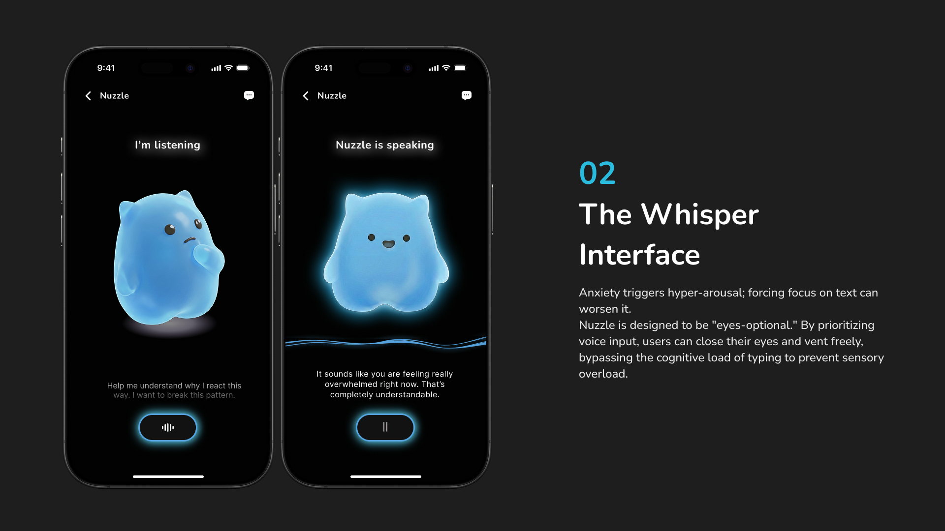 The journey begins with a voice-first "Whisper Interface." Recognizing that staring at a screen often amplifies anxiety, Nuzzle utilizes specific CBT prompts to gently guide verbal reflection in a dark, immersive environment. The AI analyzes this spoken emotion to materialize abstract feelings into unique 3D objects—a process of "Externalization."