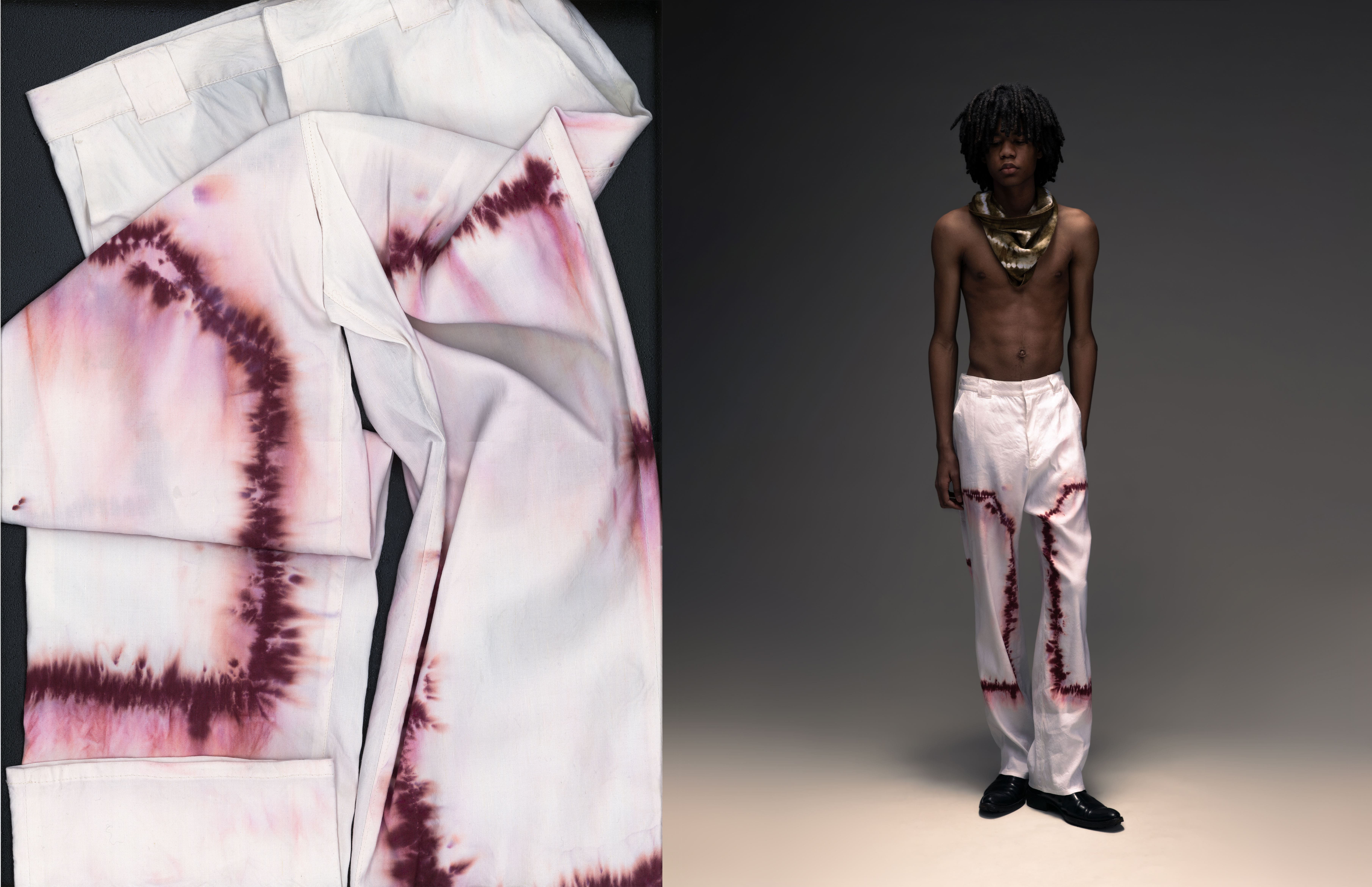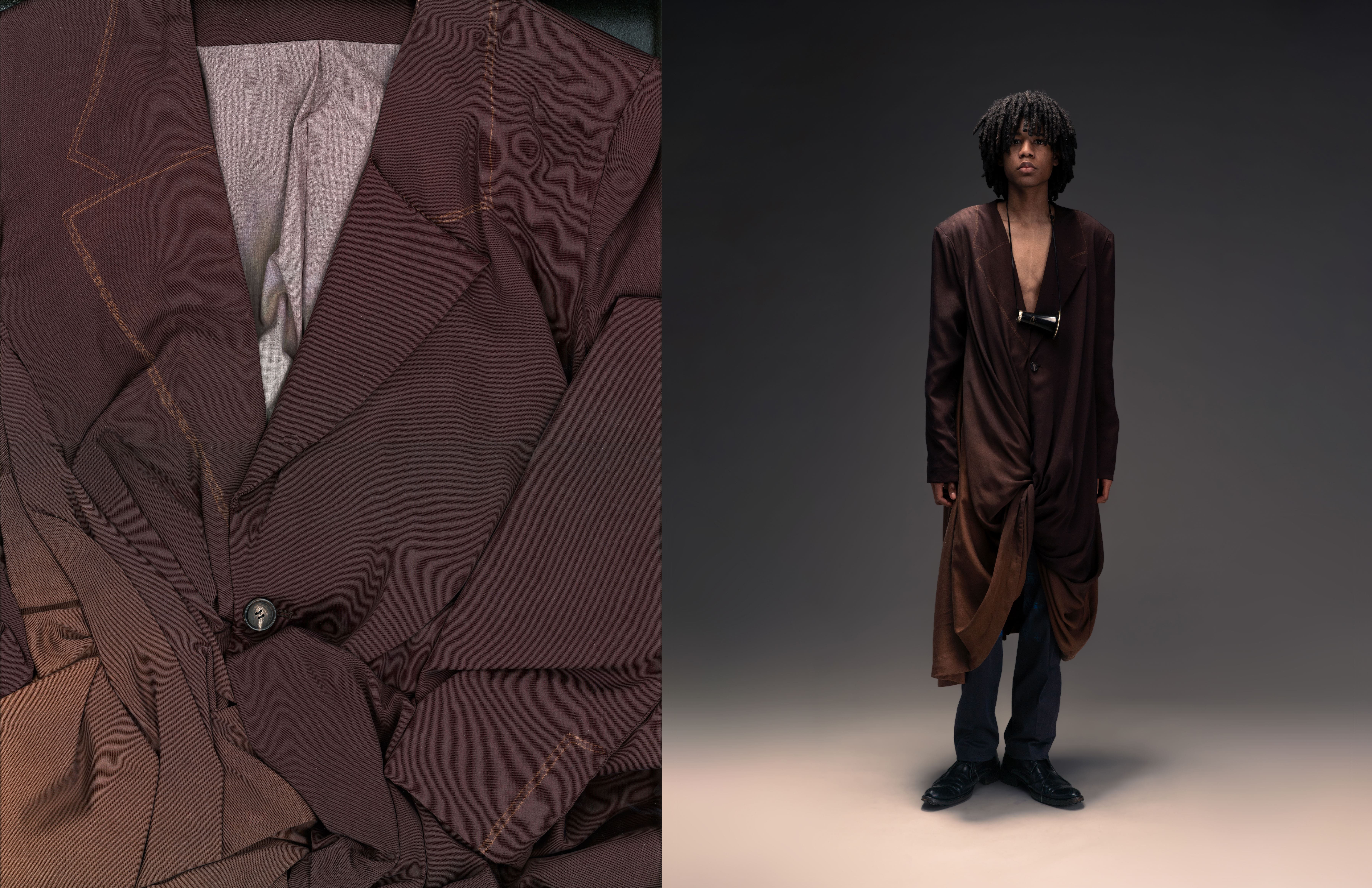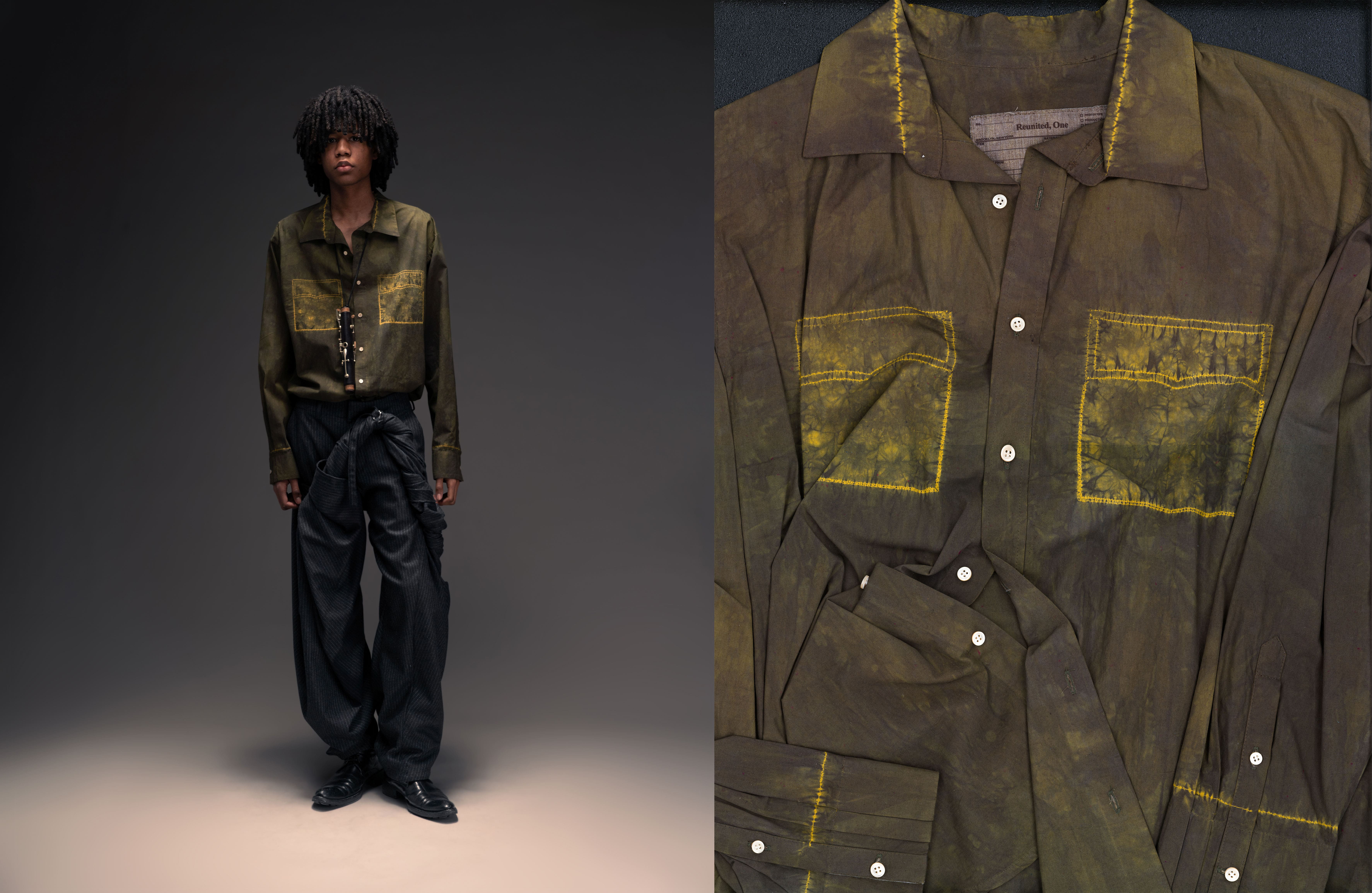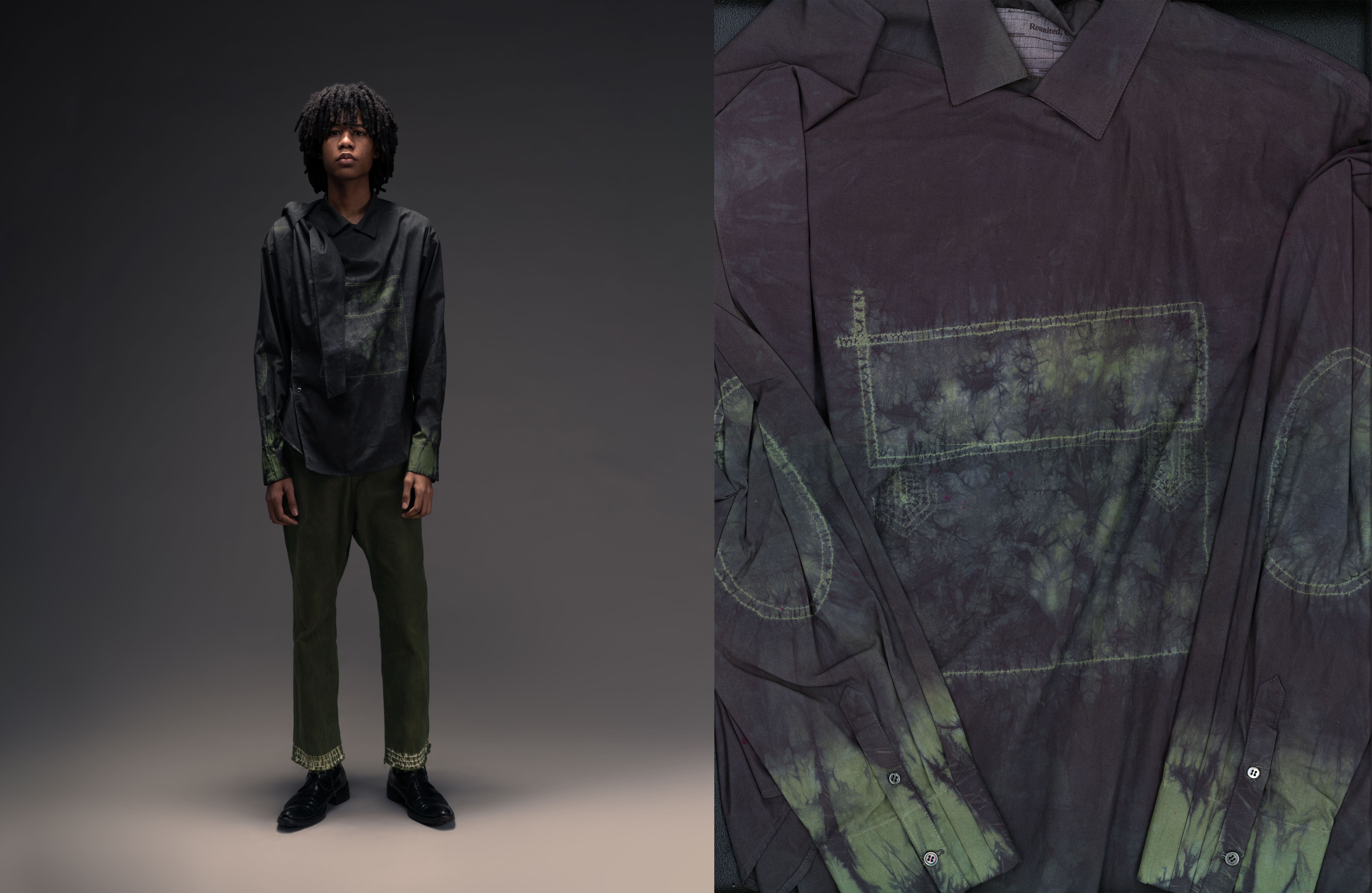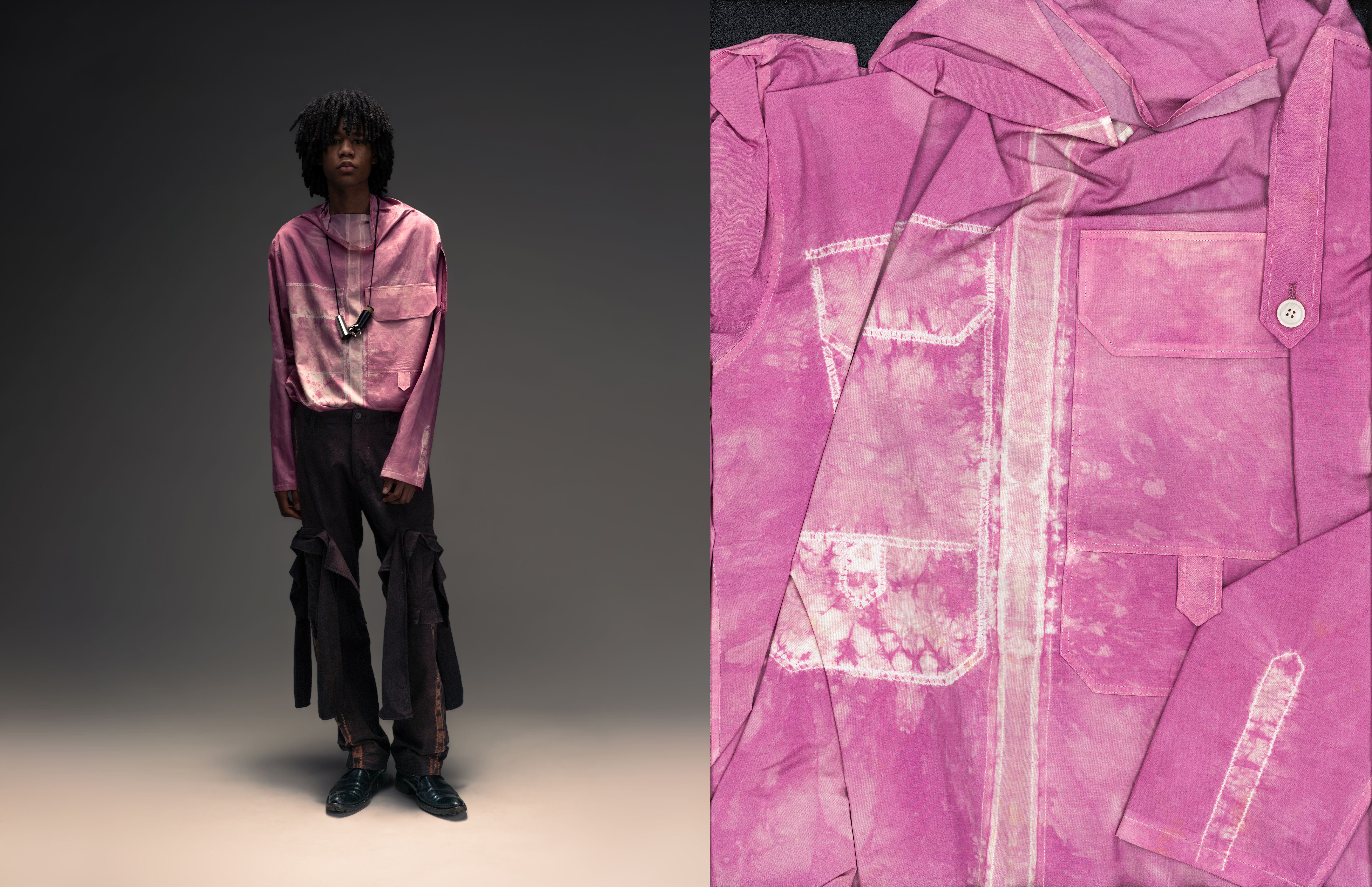 Garment dyeing became a natural way to express this. The colors shift depending on the environment, and the stitch resist technique adds subtle, unpredictable changes to the fabric. In this collection, familiar garments are reimagined with slight distortions that reflect instinct and emotion. Through many trials, this process became a way for me to practice trusting my own intuition.