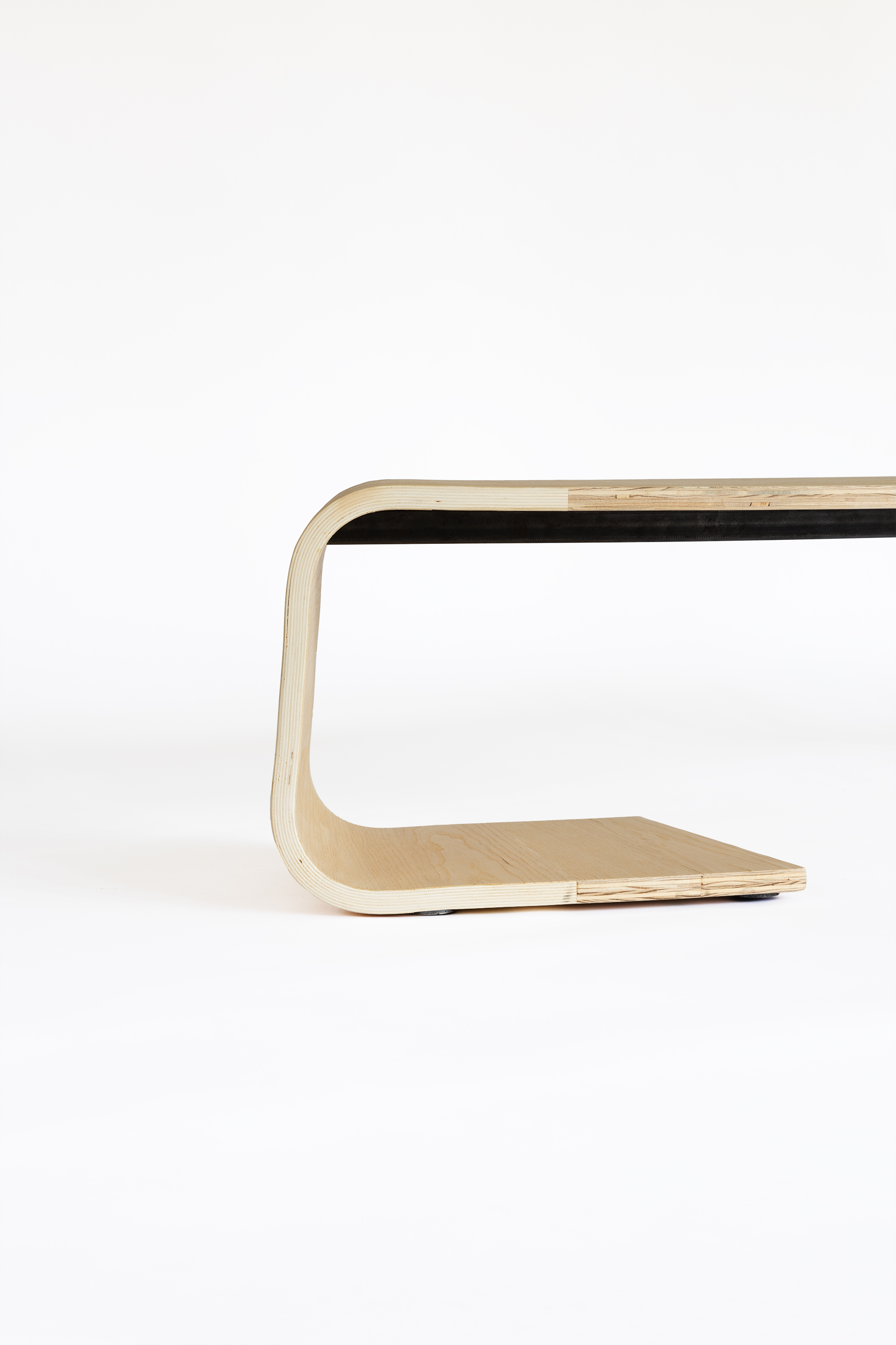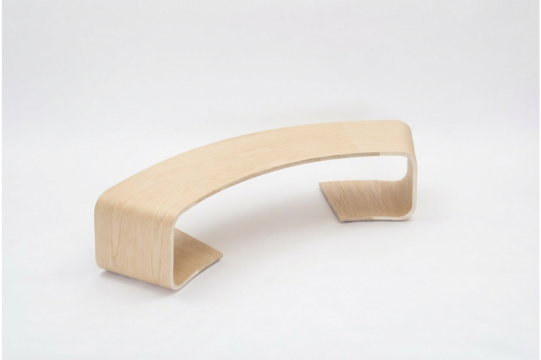 The bench's top is finished with ash veneer, enhancing the materiality of the bent plywood, which maximizes its visual and physical minimalism. The absence of a central leg, made possible by the flexibility of the plywood, contributes to a clean, continuous form. The legs are composed of eight layers of bent plywood, jointed with a central plywood board and supported by a metal stretcher for added weight-bearing capacity. The differentiated orientation of the veneer grain, with straight grain on top and cross-grain on the bottom, further emphasizes its origami-inspired quality, making Crease Bench both functional and visually engaging in any space.