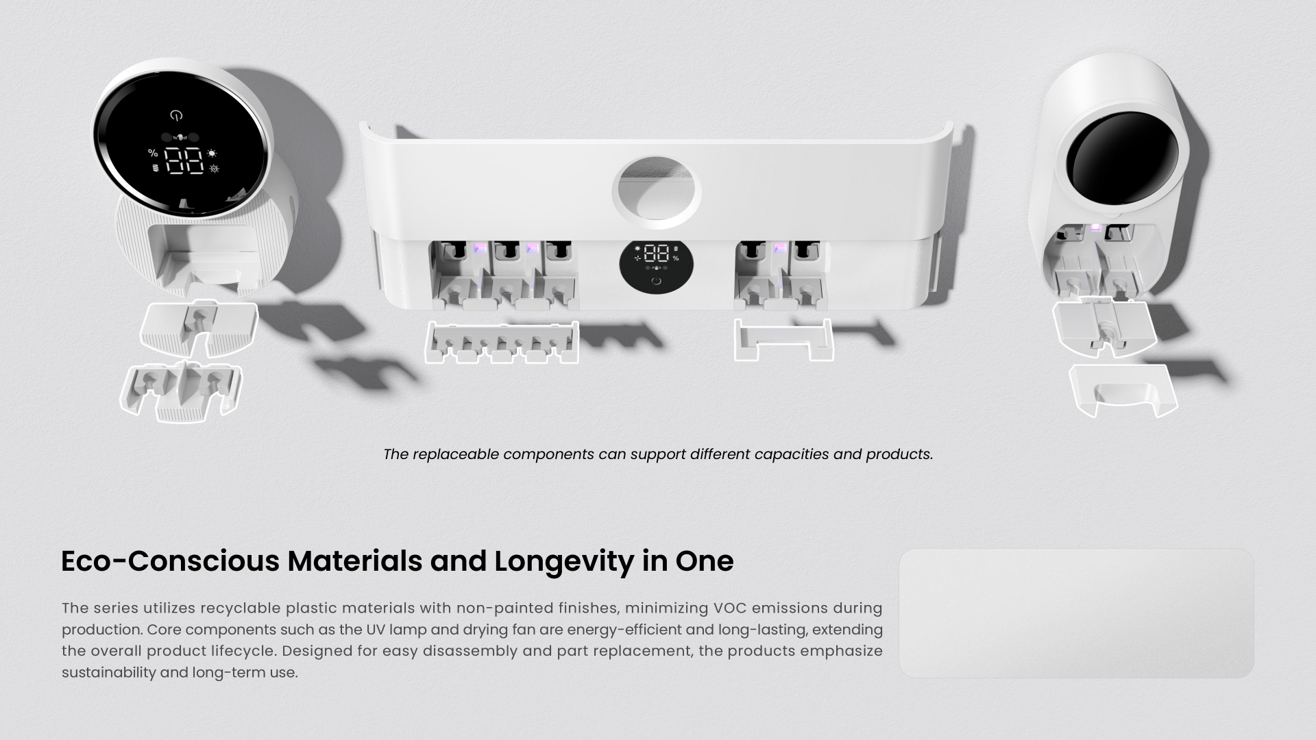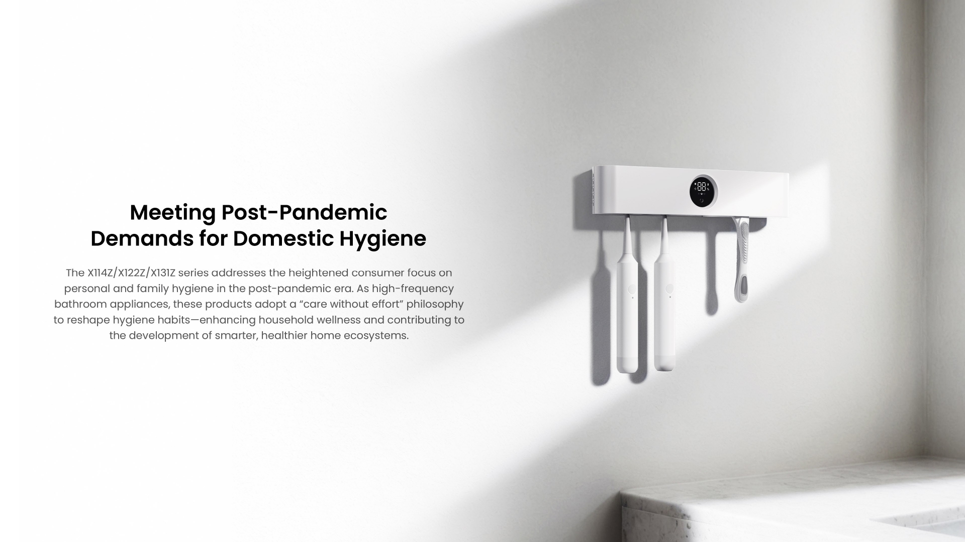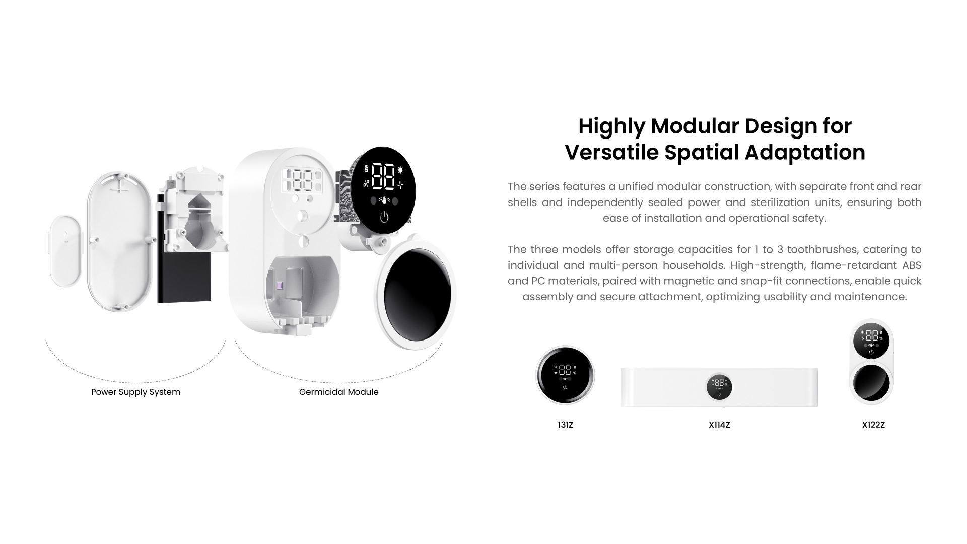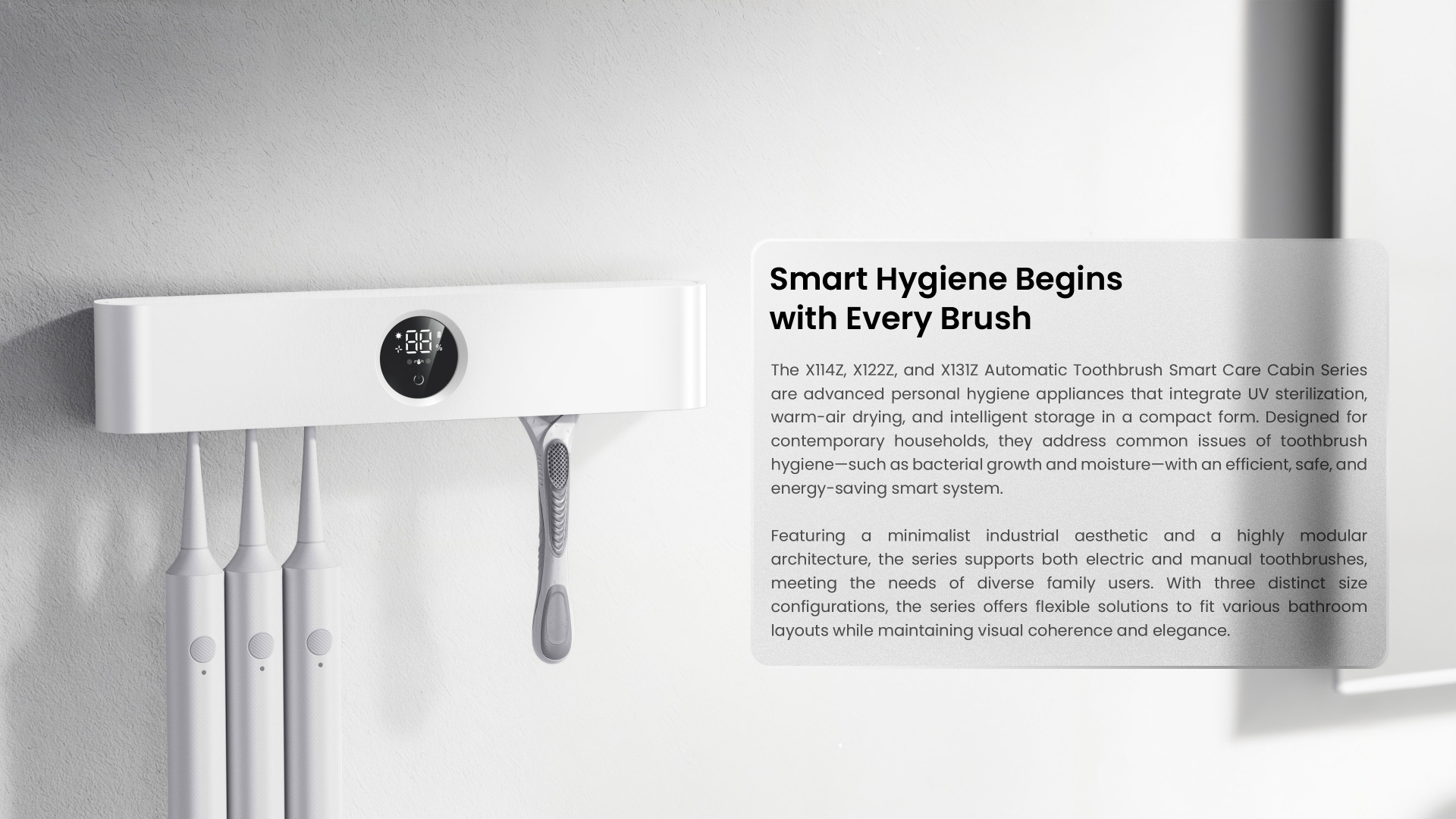 The X114Z, X122Z, and X131Z Automatic Toothbrush Smart Care Cabin Series are advanced personal hygiene appliances that integrate UV sterilization, warm-air drying, and intelligent storage in a compact form. Designed for contemporary households, they address common issues of toothbrush hygiene—such as bacterial growth and moisture—with an efficient, safe, and energy-saving smart system. Featuring a minimalist industrial aesthetic and a highly modular architecture, the series supports both electric and manual toothbrushes, meeting the needs of diverse family users. With three distinct size configurations, the series offers flexible solutions to fit various bathroom layouts while maintaining visual coherence and elegance.