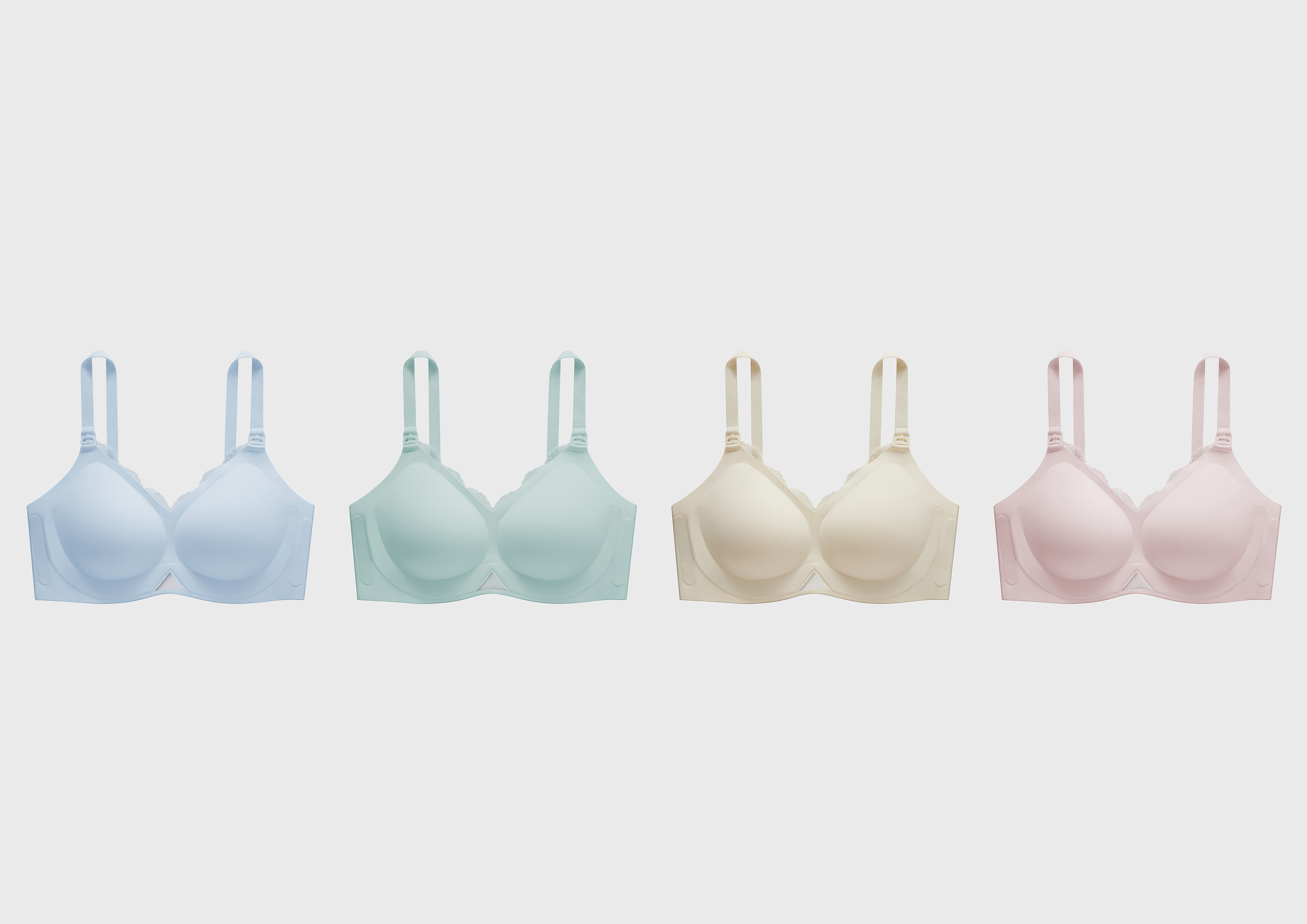 To break away from the typical bulky, dull look of traditional nursing bras, EMXEE Anti-G Nursing Bra features elegant lace trims along the neckline and nursing window—enhancing its visual appeal while uplifting the nursing experience. A triangular mesh panel at the lower gore adds a touch of lightness and breathability, balancing function and fashion. Available in four low-saturation tones—baby pink, milky white, cotton blue, and sea salt green—it serves as a soothing and comforting visual language to lift the mood of mothers during pregnancy and breastfeeding.