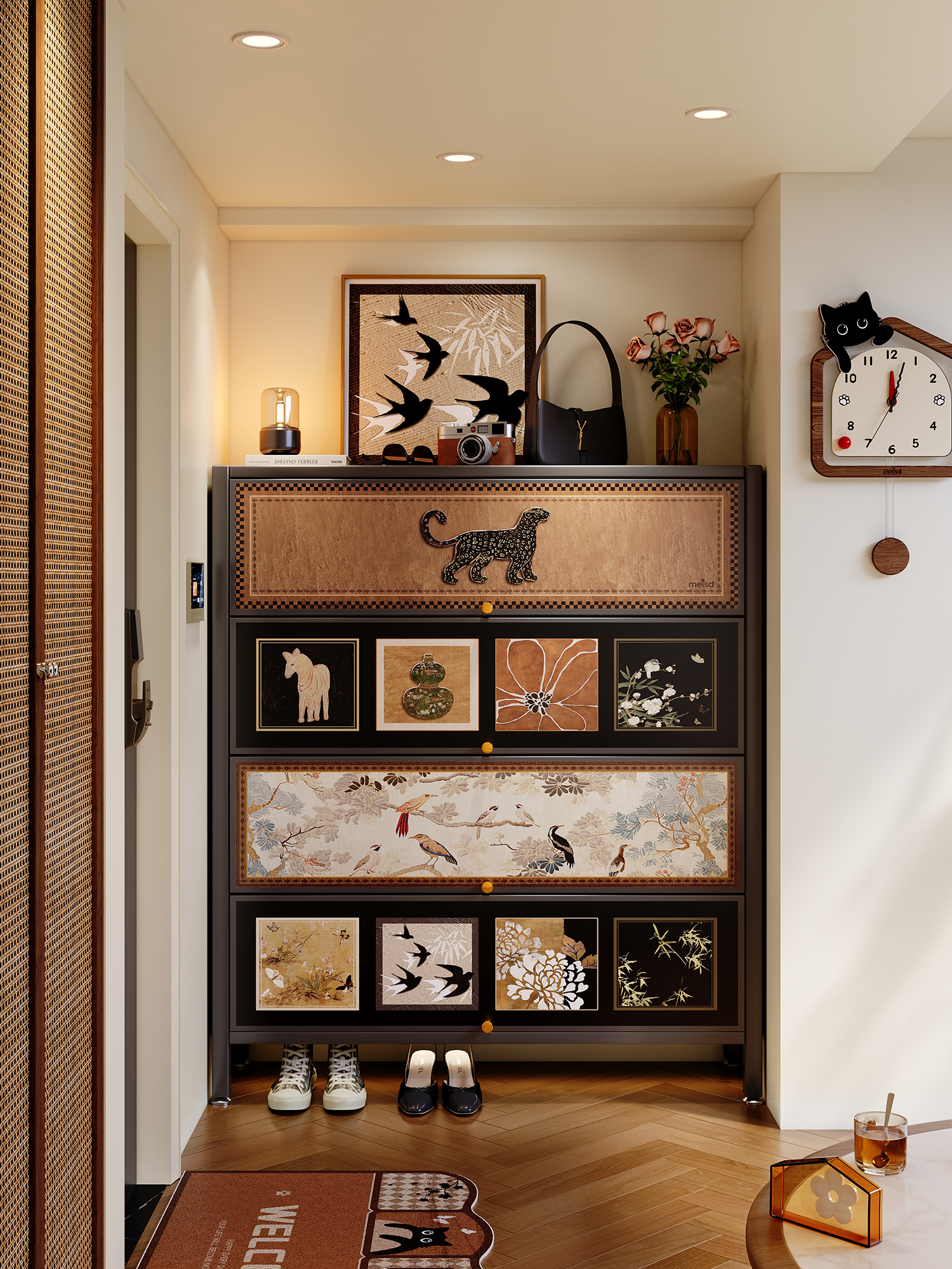 This shoe cabinet merges practical storage with artistic decoration in a creative way. By integrating patterns rich in Eastern cultural symbolism, it transcends its role as mere shoe storage, transforming into a meaningful home art piece.