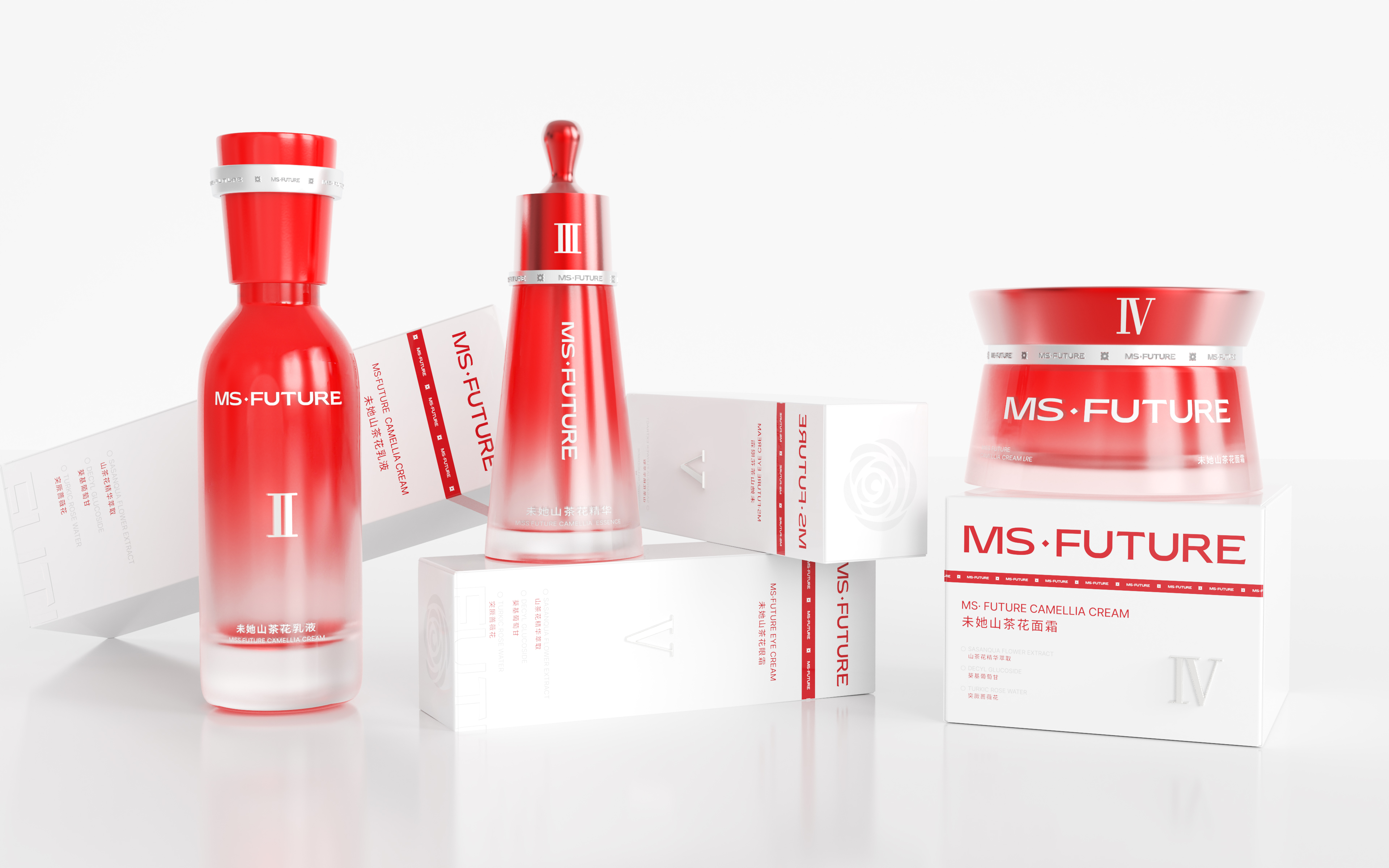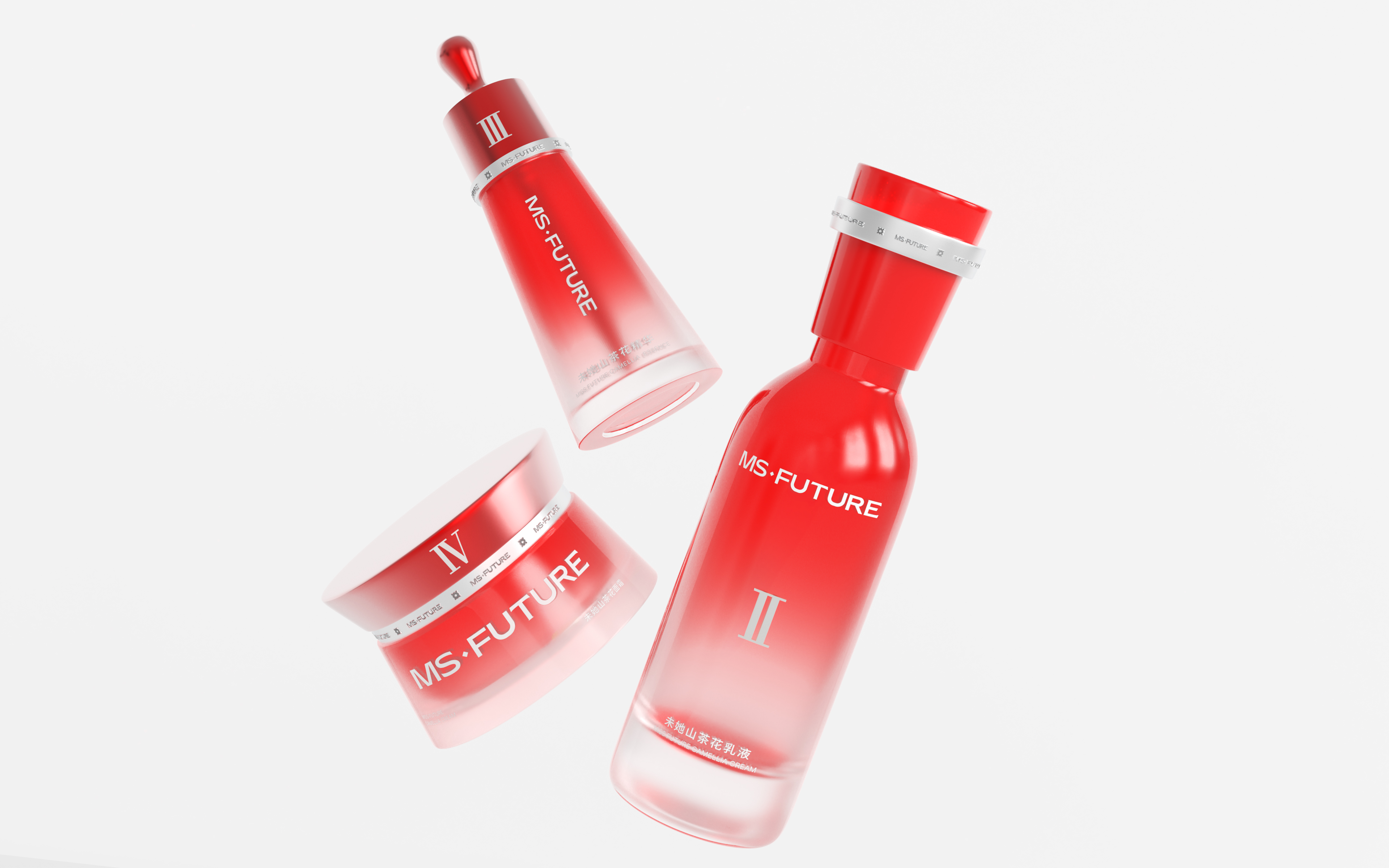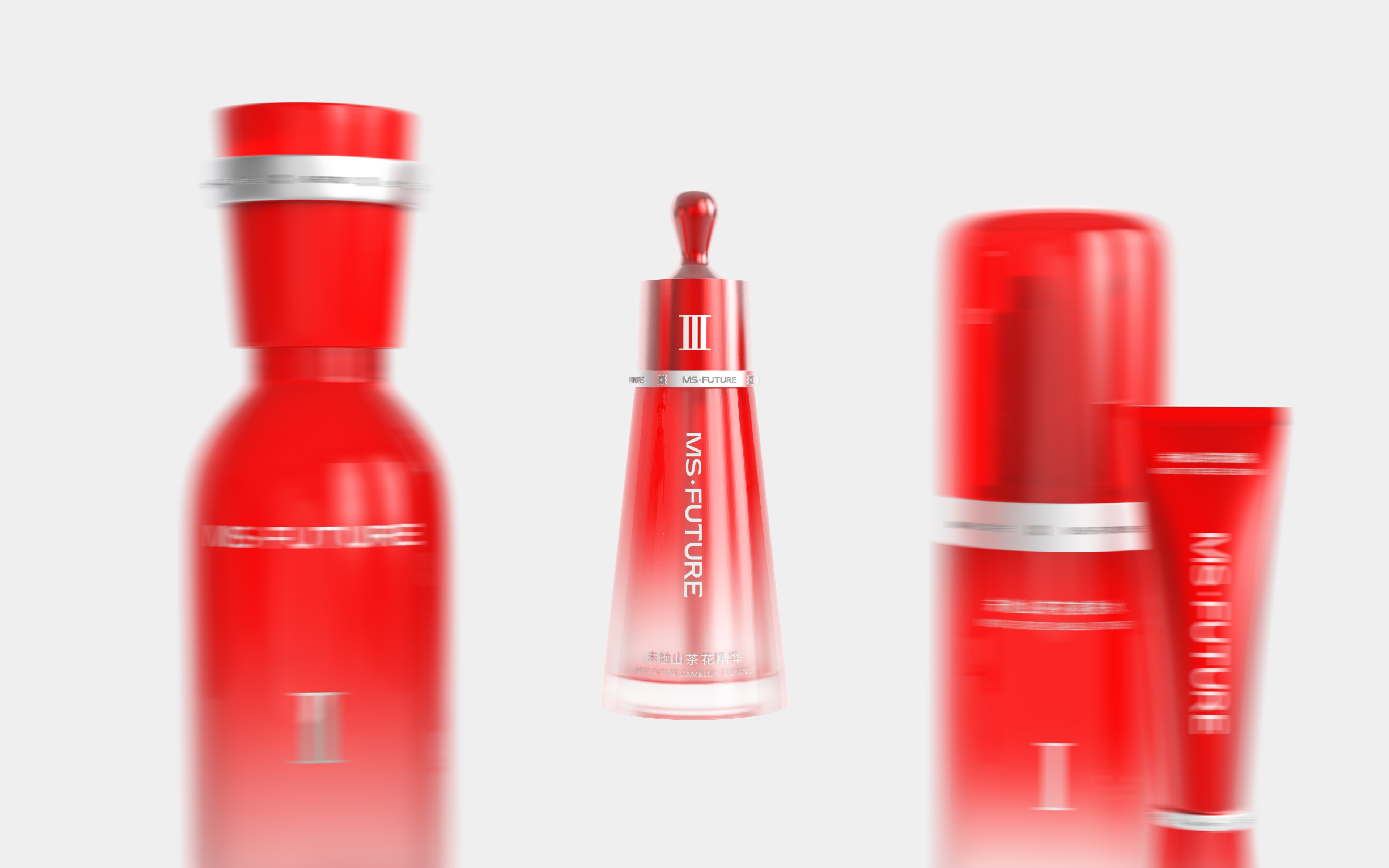 The design draws inspiration from the brand’s core natural camellia extract, using camellia’s vibrant red to show passion, energy, and restorative power. The red color highlights its botanical source and also represents the brand’s philosophy of drawing pure restorative power from nature, making each unboxing feel like a gentle touch of nature. Pure white is incorporated to balance the intensity of red, creating a soothing and harmonious visual effect while reinforcing a sense of technological sophistication. The bottles and tubes feature a red-to-transparent gradient, symbolizing the gradual penetration and restorative effect of the skincare ingredients. Silver-plated strips add a futuristic touch and visually echo the red strips on the outer box, symbolizing the flow of restorative power from one step of the routine to the next like an energy ring. The bottles and tubes are shaped in simple geometric forms—cylindrical or triangular—ensuring consistency across the series while conveying a stable and reliable product identity.