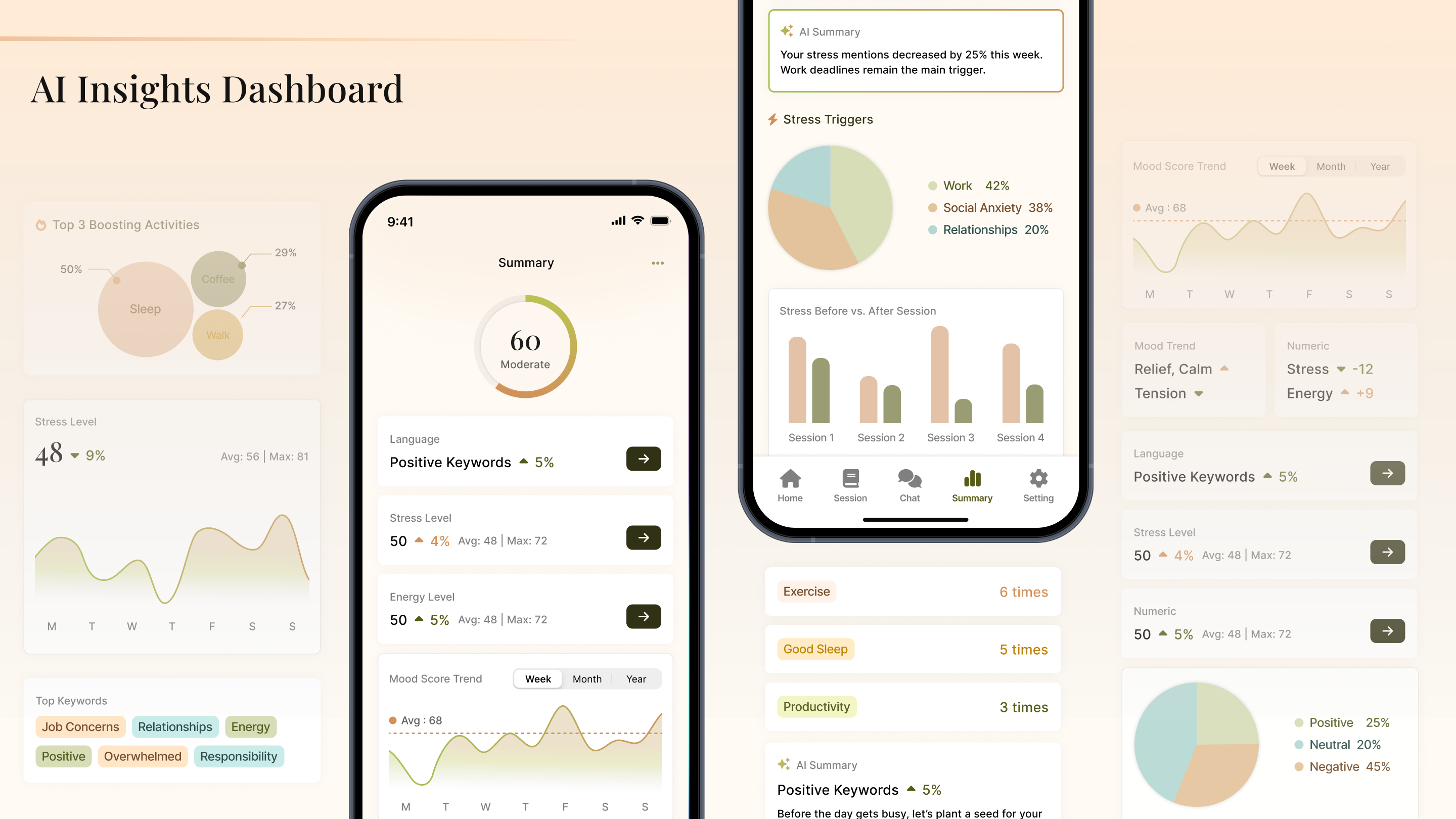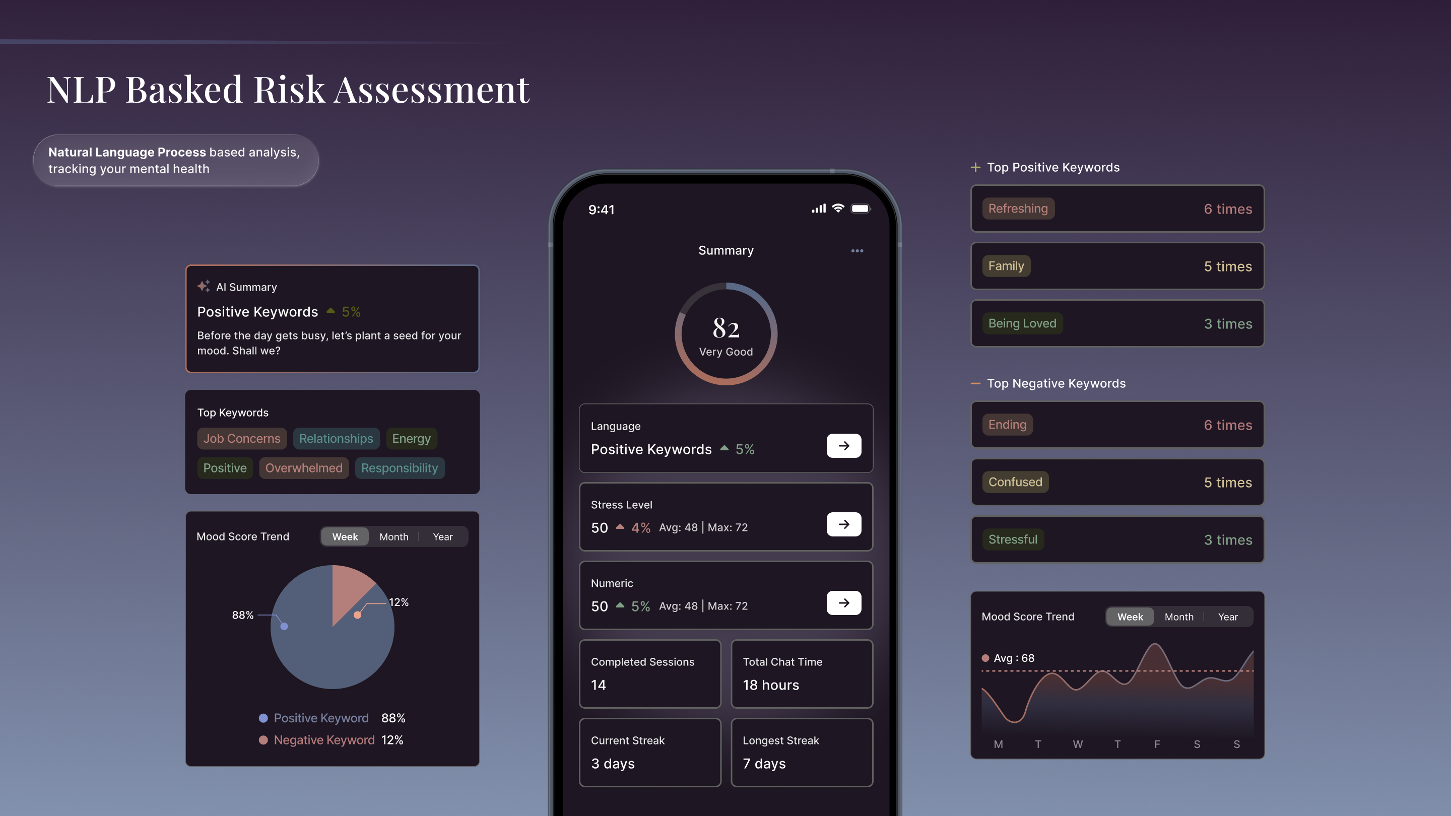 What makes Lumie unique is how it helps you understand yourself better. After each conversation or scheduled session, Lumie generates a personalized summary and reflection of your mental health. It highlights key themes in your words, tracks your emotional patterns, and detects trigger signals that may indicate higher stress or potential risk. Using this data, Lumie also measures overall mood, stress, and energy levels, turning your daily interactions into valuable insights about your well-being. Over time, you can view both simple summaries and detailed analytics, giving you a clear picture of how your mental health is evolving. And when needed, Lumie responsibly recommends next steps, such as reaching out to a clinician or taking practical actions to protect your well-being.