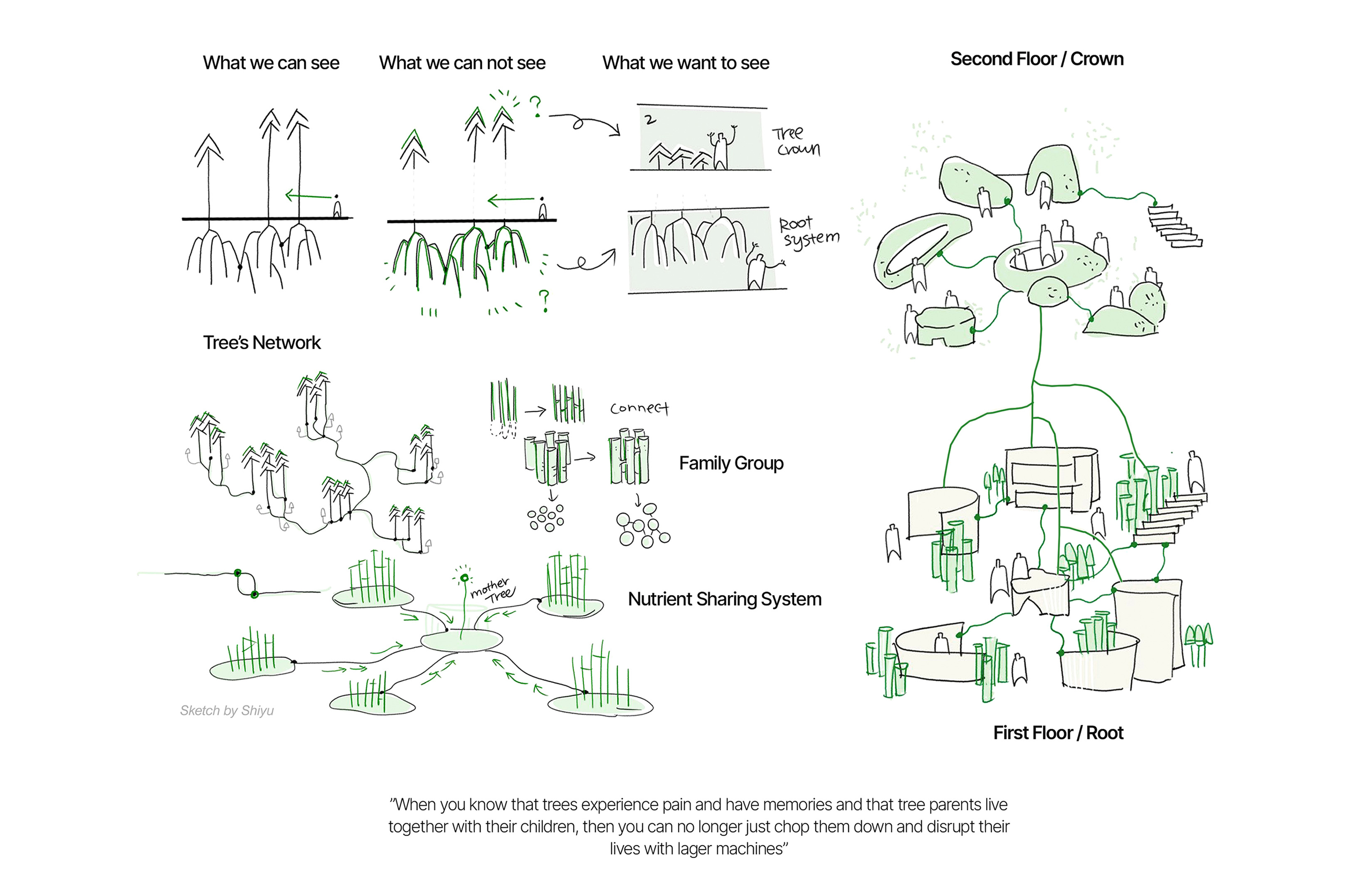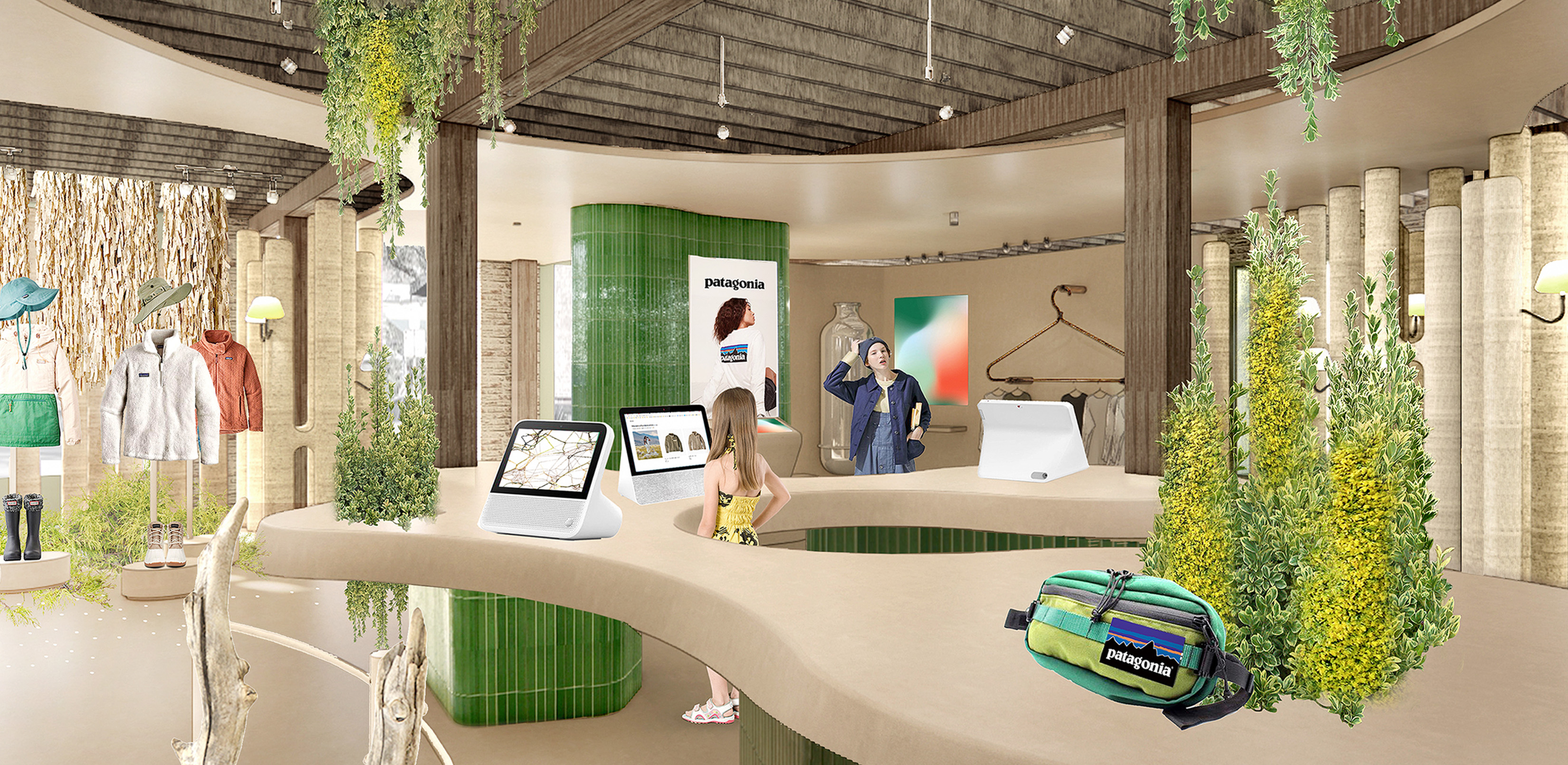 This space is more than retail; it is a story of reconnection. Inspired by the hidden world beneath the forest floor, the design unfolds like an underground family network — roots, fungi, and soil weaving silent conversations of care and coexistence. Here, every beam and surface speaks to Patagonia’s ethos: respect for the Earth, and reverence for the quiet systems that sustain it.
