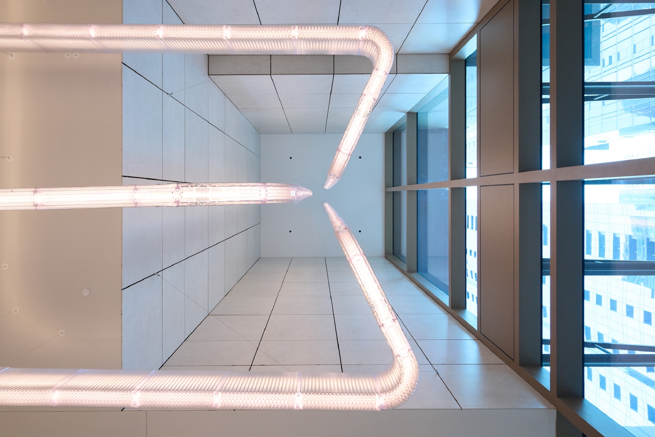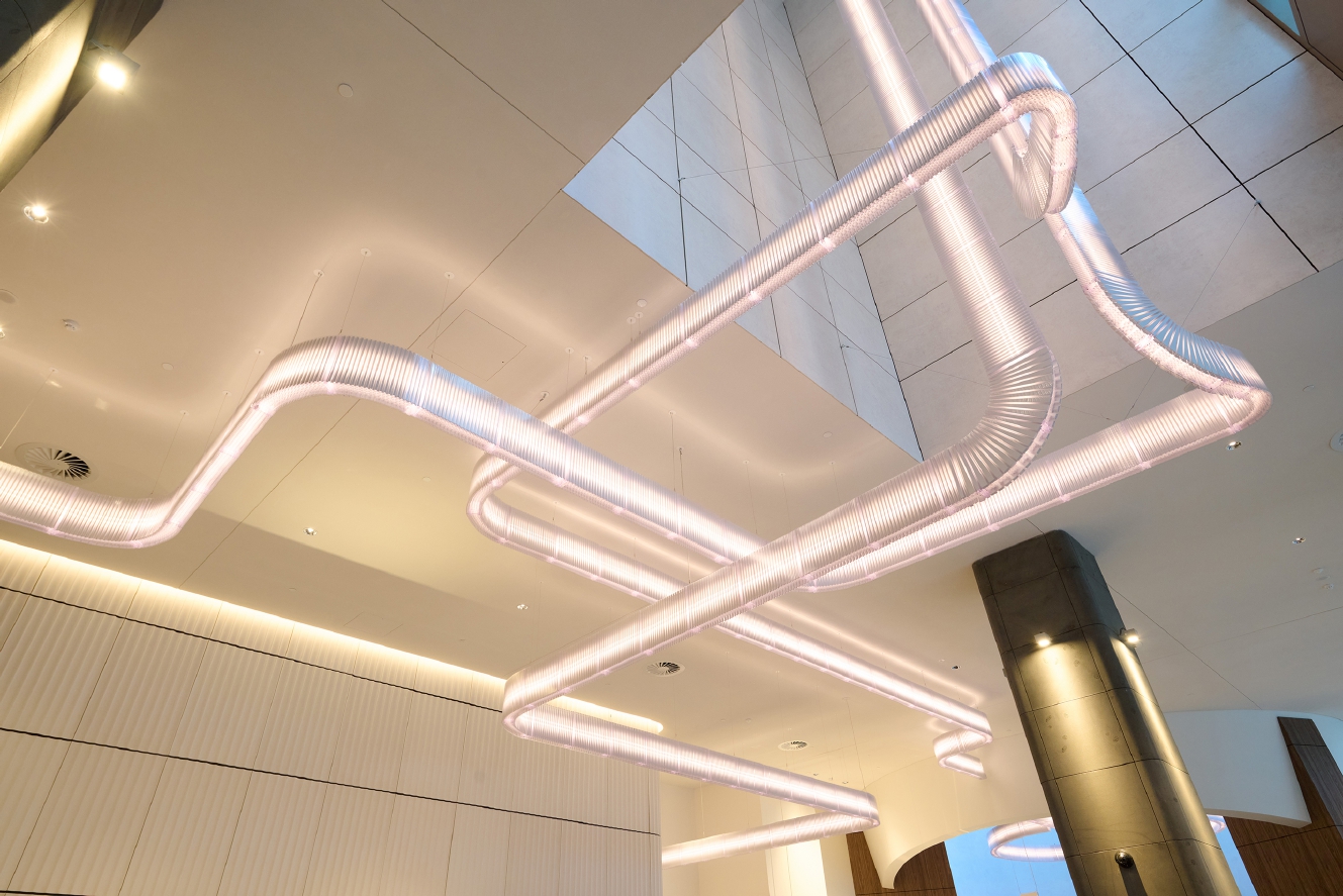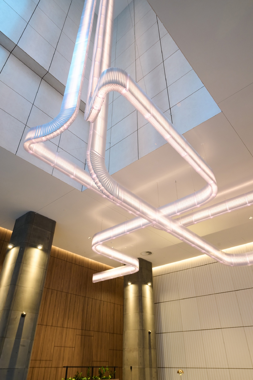 The glass like structures are 300m long in total and the vertical sections are suspended on steel cables secured at the very top of the lightwell ceiling. Multiple drivers power the extensive length of 3000K LED Neon strip, and an internal bus cable ensures there are not dull sections where the LEDs change to another driver.