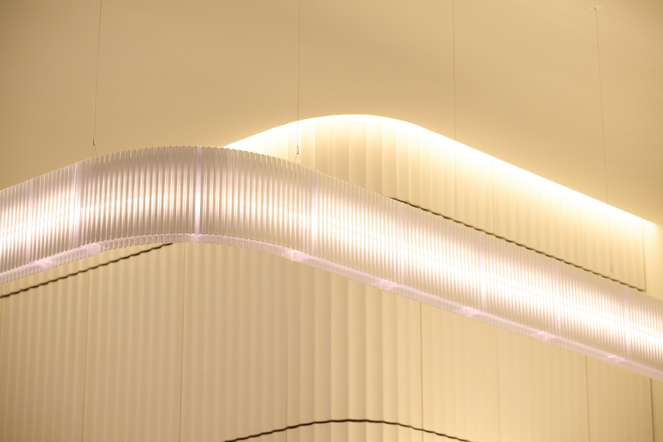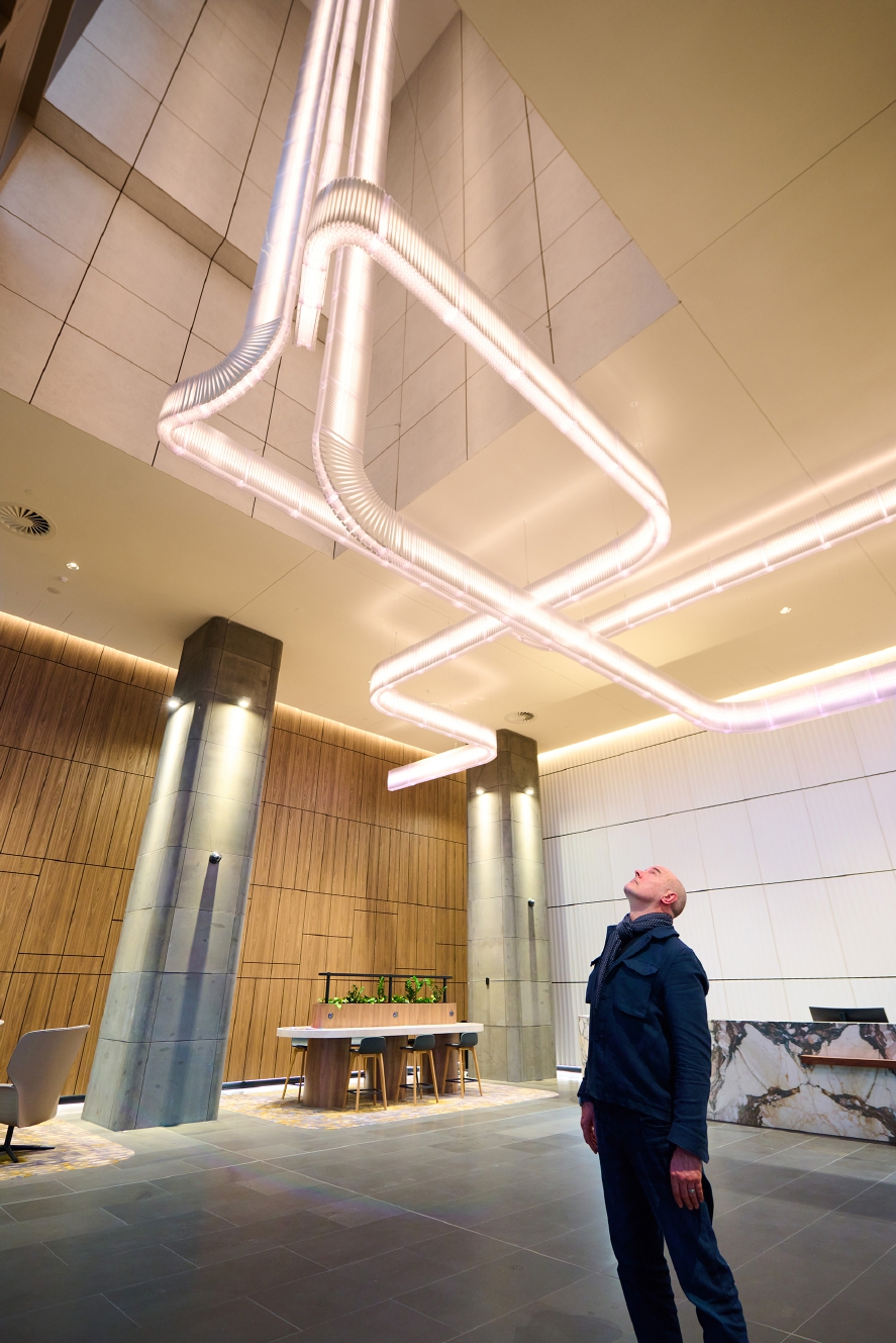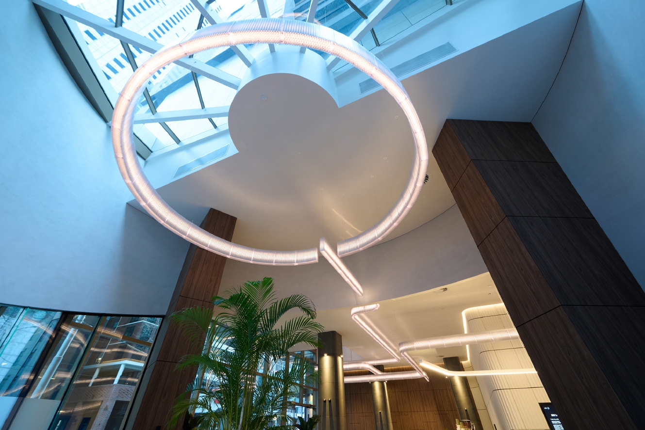 The glass like structures are 300m long in total and the vertical sections are suspended on steel cables secured at the very top of the lightwell ceiling. Multiple drivers power the extensive length of 3000K LED Neon strip, and an internal bus cable ensures there are not dull sections where the LEDs change to another driver.