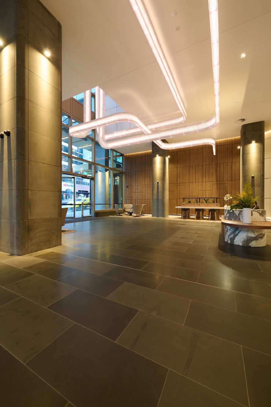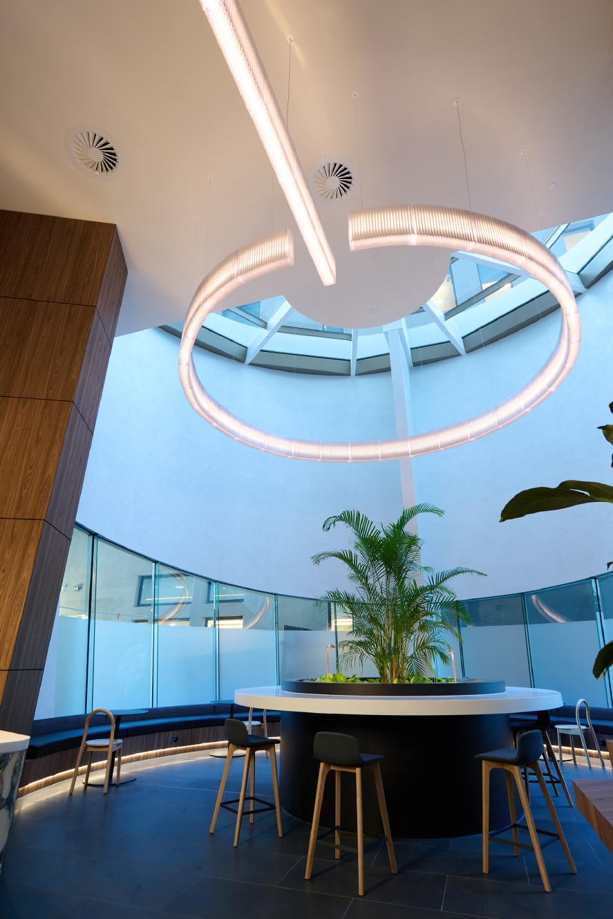 Beacon rises 5 stories into the façade’s lightwell before spreading out like a river of light into the main atrium, creating subtle wayfinding suggestions. The 3 arms offer potential directions, breakout area, lift lobby and Café. In the café area it extends again, with a circumference of the space and creates a warm contained nook.