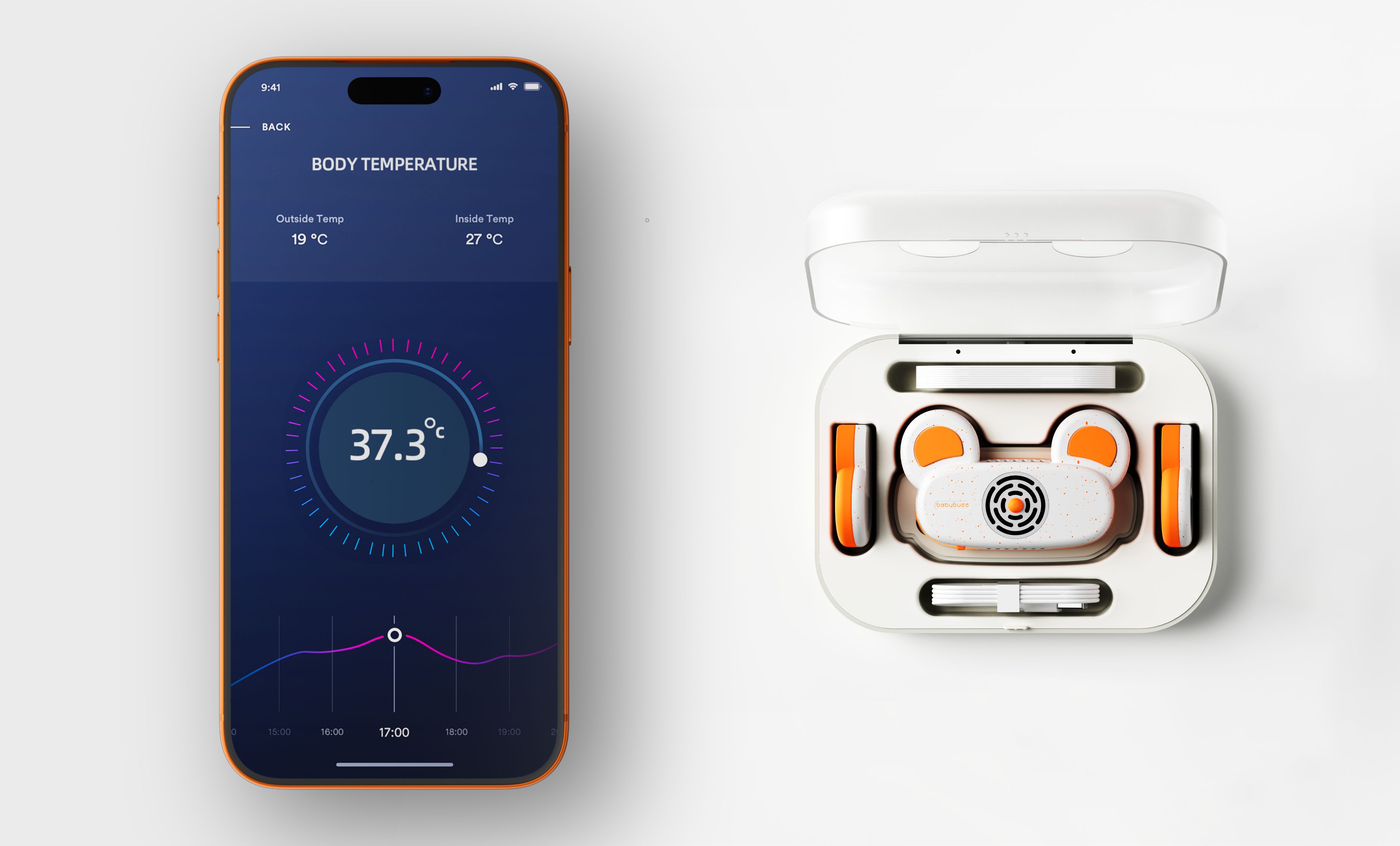The device utilizes a semiconductor chip for efficient cooling, complemented by a silent fan to dissipate heat, ensuring an efficient and quiet cooling process. The glycerin cooling pad, combined with a medical-grade gel patch, ensures gentle contact with the infant's skin, delivering a comfortable cooling experience. A thermocouple monitors the cold-end temperature of the semiconductor in real time, while an infrared sensor tracks the skin's surface temperature, providing critical data for precise cooling. Meanwhile, an audible buzzer and status indicator can promptly alert users to the device’s operational state. The mobile mini-program also allows for real-time temperature monitoring and recording, making it convenient for parents to stay informed about their infant’s health status at any time. This data can also be shared with family members, offering peace of mind to caregivers both at home and away. Additionally, the product includes a replaceable backup battery and a rechargeable storage case, significantly enhancing both convenience and battery life for extended use.