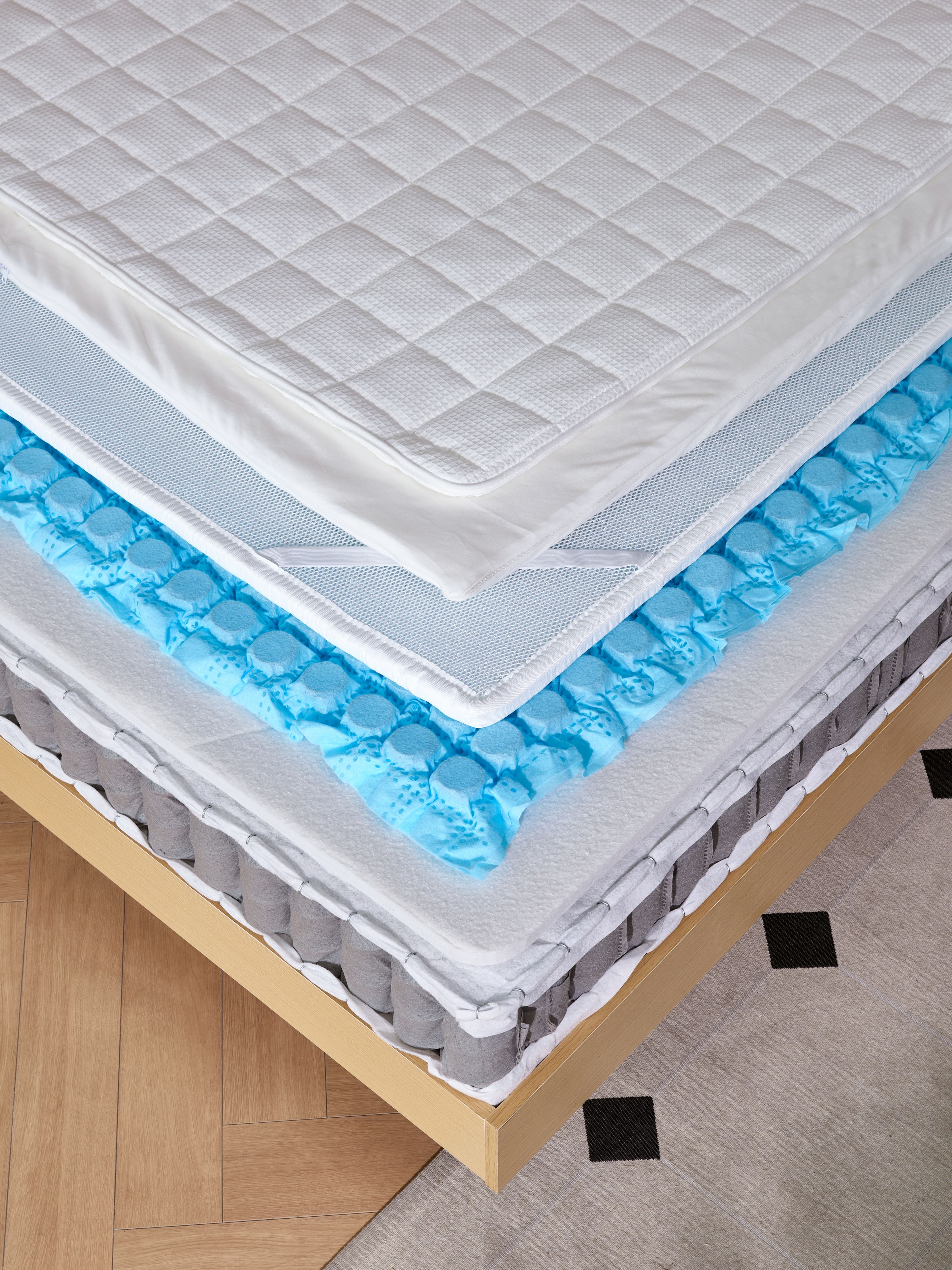 In terms of structure, the 360-degree detachable design is a major highlight. Exposed zippers and a layered structure make the interior clear at a glance, allowing users to freely check the fabric, filling layers and support layers, achieving transparent interaction in both vision and function. The three-zone cool fabric independent pocket springs accurately support different parts of the body, remaining quiet and offering excellent motion isolation; the concave-convex non-slip particles at the bottom prevent slipping and shifting. In terms of material selection, it fully demonstrates environmental friendliness and quality: the waffle fabric is lightweight, warm and easy to maintain; the bamboo charcoal spine-supporting cotton is elastic, breathable, antibacterial and anti-mite; the jute fiber cotton also has the same antibacterial and anti-mite properties. The springs adopt ultrasonic stitching technology with zero glue bonding, ensuring safety, environmental friendliness and reduced pollution. Additionally, the fully detachable and washable design facilitates cleaning, the filling layers allow adjustment of firmness, and the mattress can also be customized to personal size and needs for a tailored sleep solution.