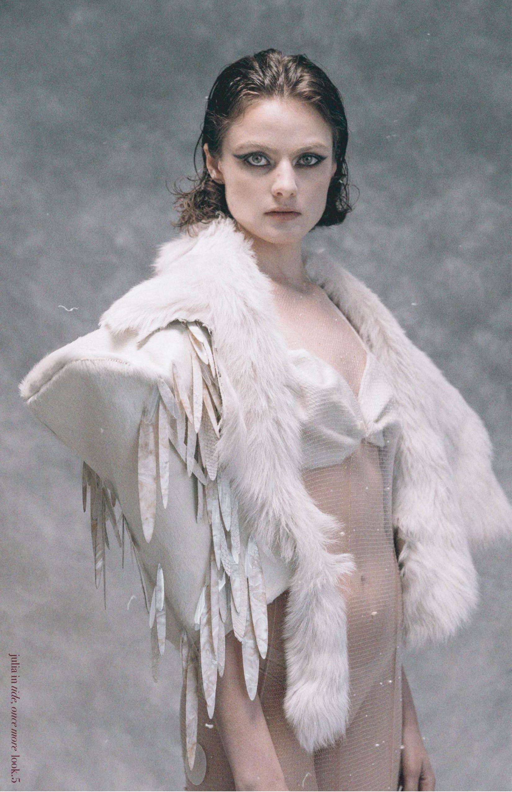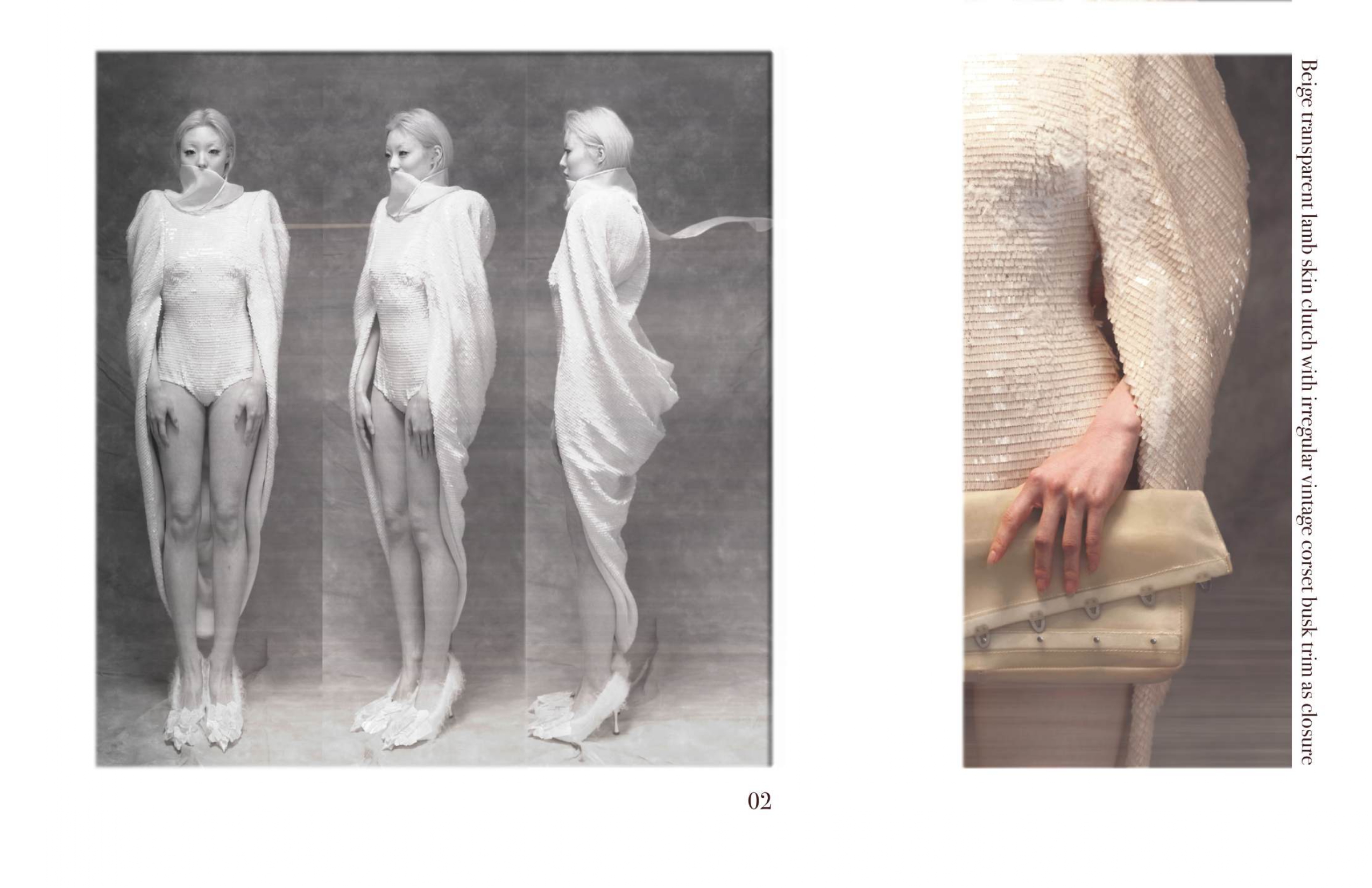 Drawing from the skeletal structures of marine organisms, the silhouettes reference shells, mollusks, and deep-sea anatomy. Spiral pattern cutting mirrors natural growth patterns, creating garments that wrap, coil, and unfurl around the body. The tension between restriction and fluidity becomes a key narrative element: limited arm and leg mobility evokes the shift from land-dwelling creature to aquatic being, while loose, draped layers echo the process of molting and shedding outdated forms.