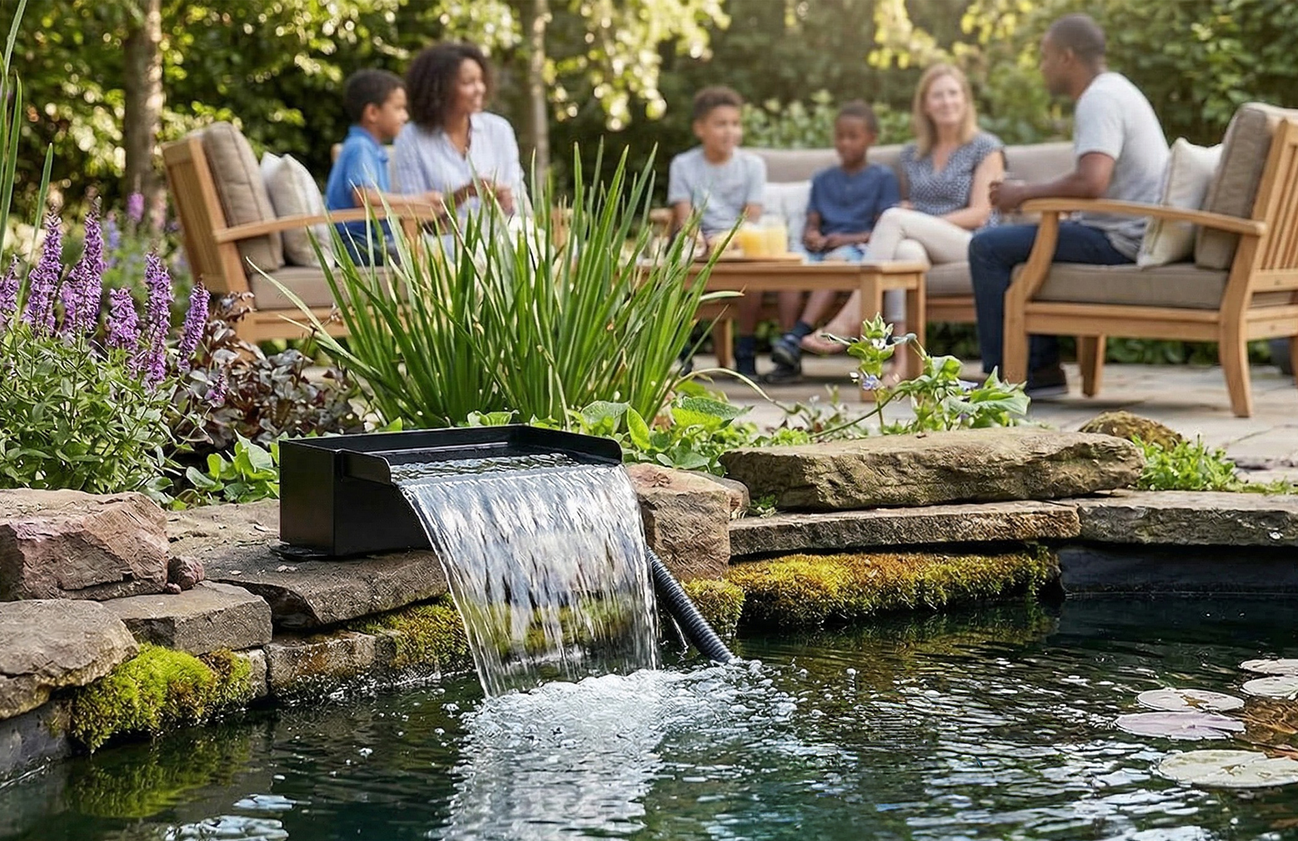 A matching 40W pump delivers a steady water supply to support prolonged operation. The corrugated hose offers sufficient flexibility, allowing users to adjust the routing to fit the pond structure during installation. Designed for reliability and easy maintenance, the system fits perfectly into scenes of relaxation, family gatherings, or daily appreciation. The sound and sight of flowing water create a relaxing natural atmosphere, making the water feature a constant companion in family life.