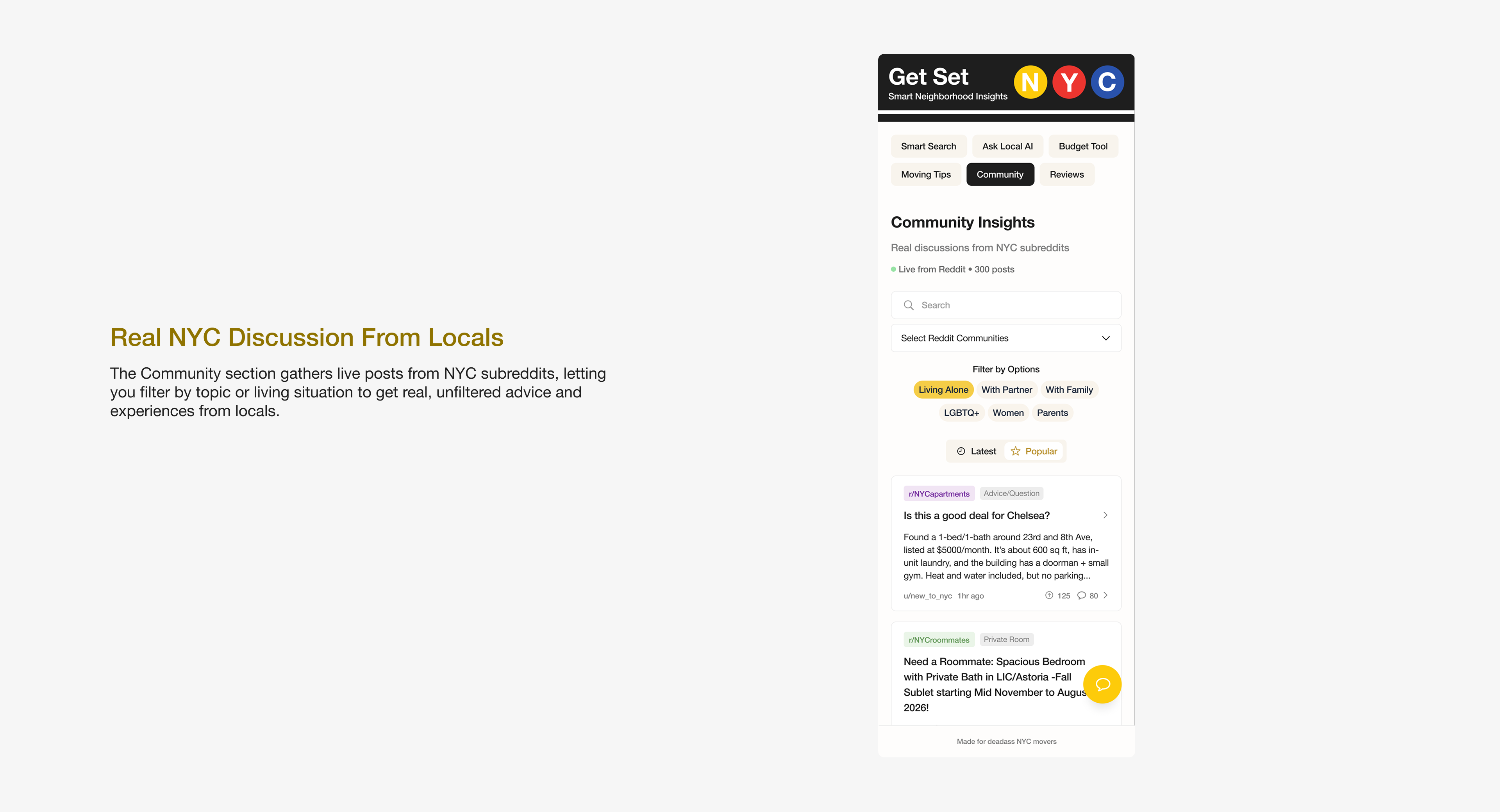 Get Set NYC also connects data with lived experience. Community insights are curated and organized into clear themes such as international newcomer concerns, LGBTQ+ safety, commuting realities, and lifestyle trade-offs. This allows users to quickly surface relevant perspectives without wading through noisy or misleading content.
