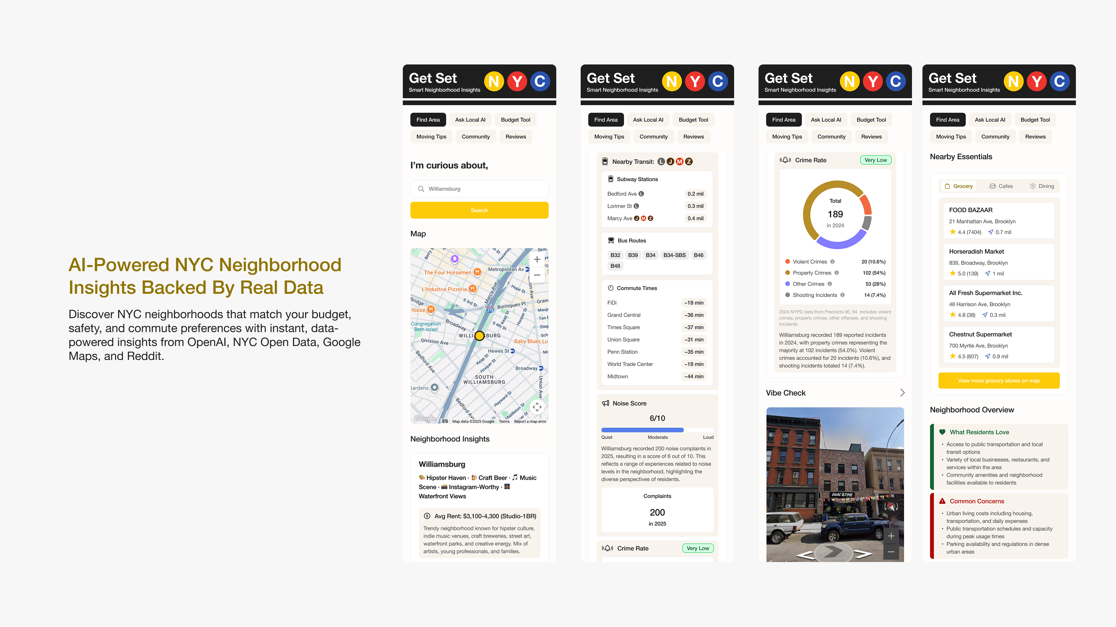 Get Set NYC brings the signals that matter most into one decision-ready snapshot. Safety, noise, rent reality, transit access, and local context are structured into a clear, scannable experience designed to be understood in seconds. Instead of comparing raw numbers across platforms, users can quickly form a grounded mental model of what a neighborhood feels like to live in.