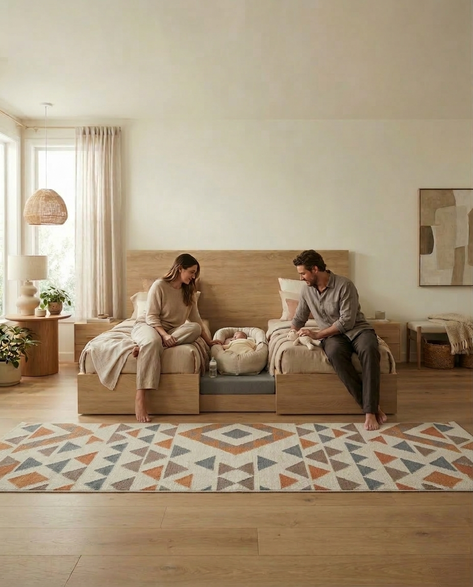 The center platform remains grounded at all times, ensuring structural stability while simplifying the mechanism. Beyond separation, the expanded configuration can also create additional usable space for co-sleeping, offering flexibility that standard king dimensions cannot provide.