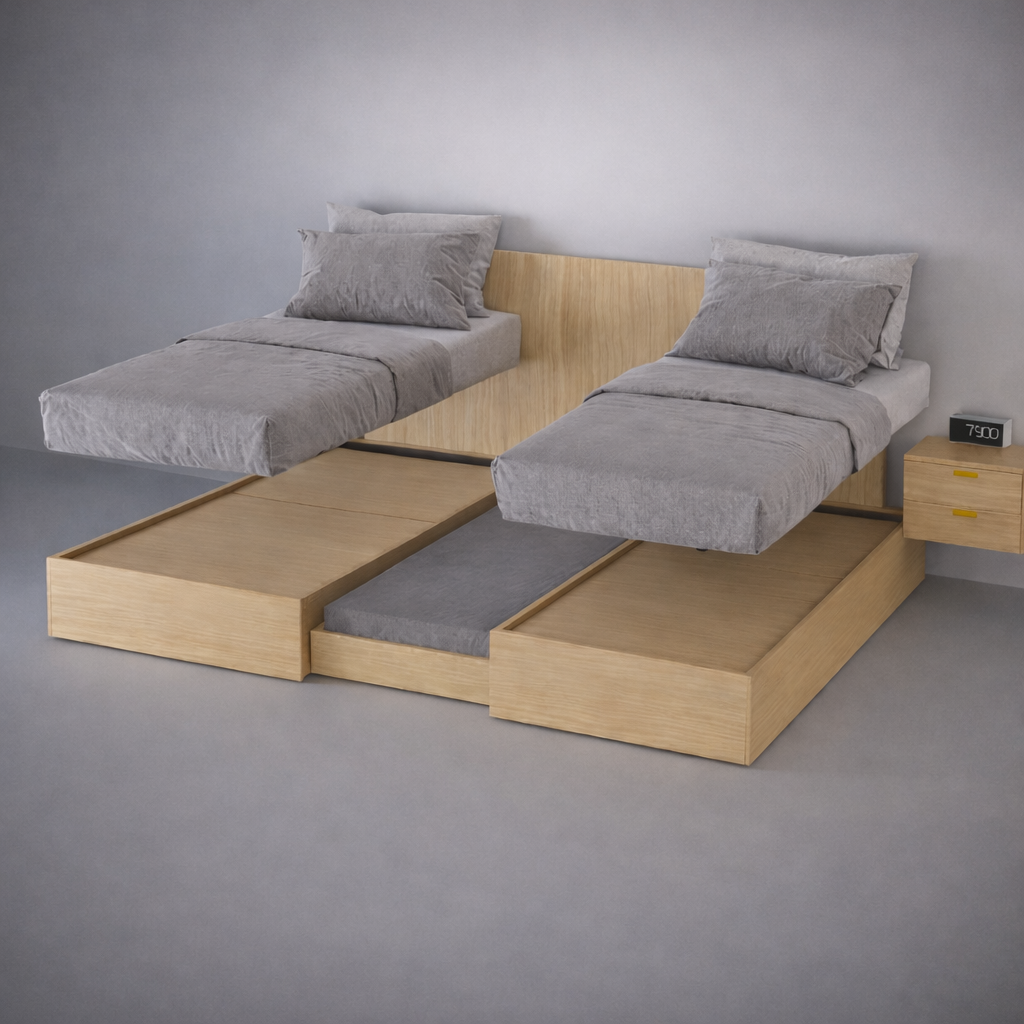 By rethinking how boundaries function within the bedroom, Castaway Bed expands the possibilities of shared sleep—introducing configurational flexibility without sacrificing stability or design integrity.
