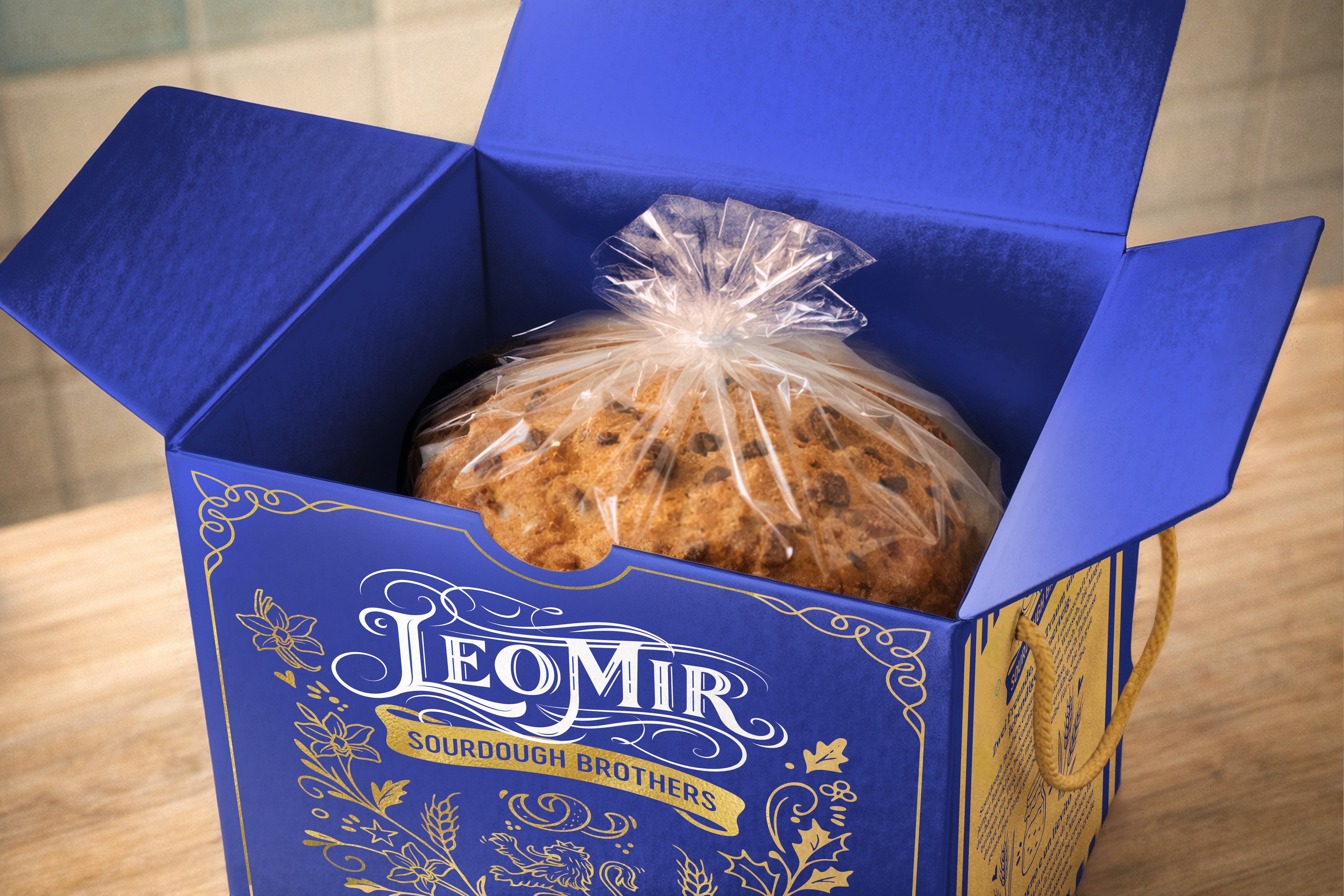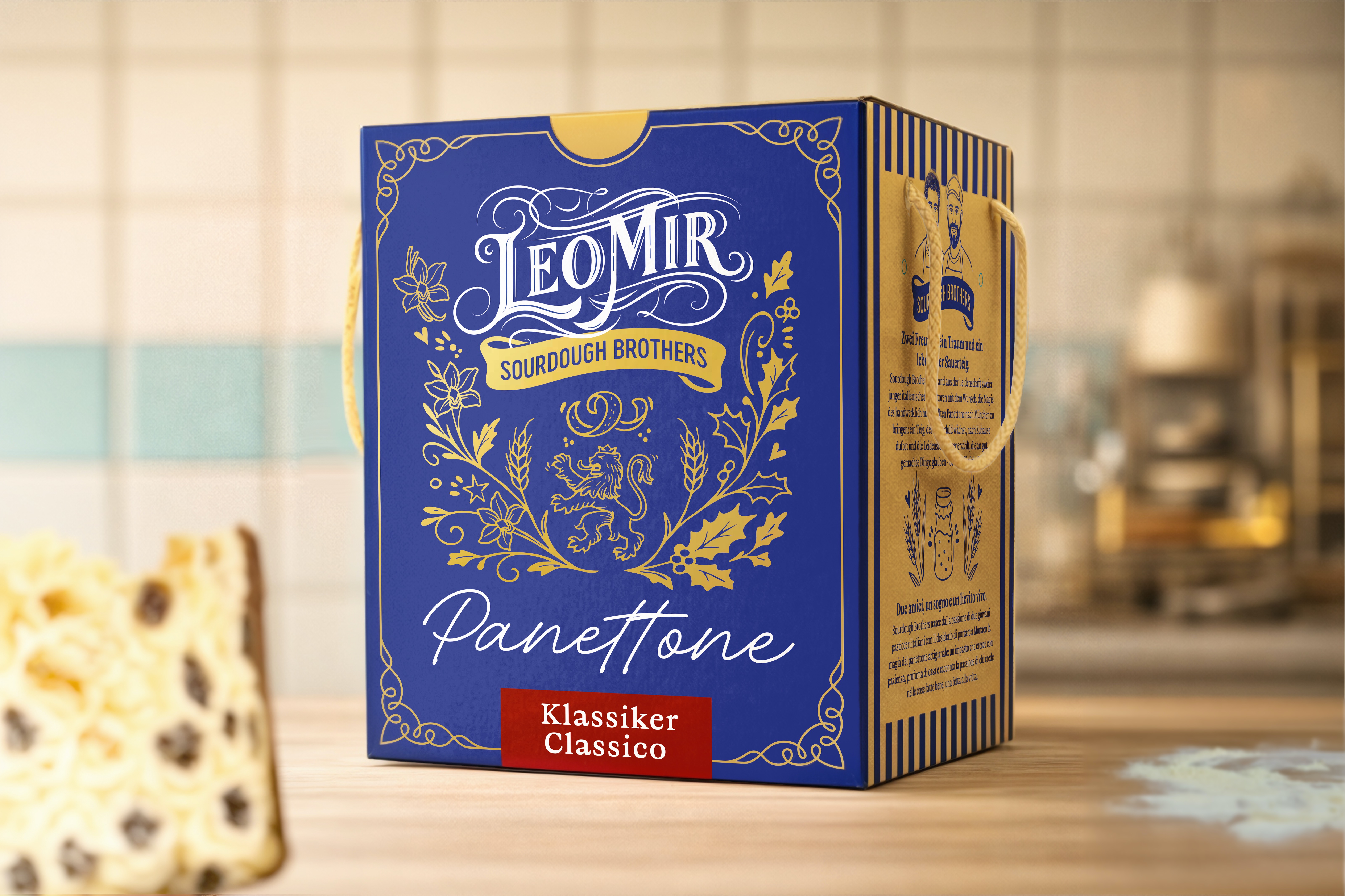 Color palettes — deep blue and gold for panettone, light blue and gold for colomba — convey elegance and heritage. Refined lettering, the Bavarian lion crest, handmade-style illustrations, including the founders’ portrait, introduce the brand’s manifesto: “Two friends, one dream, and a living sourdough.”