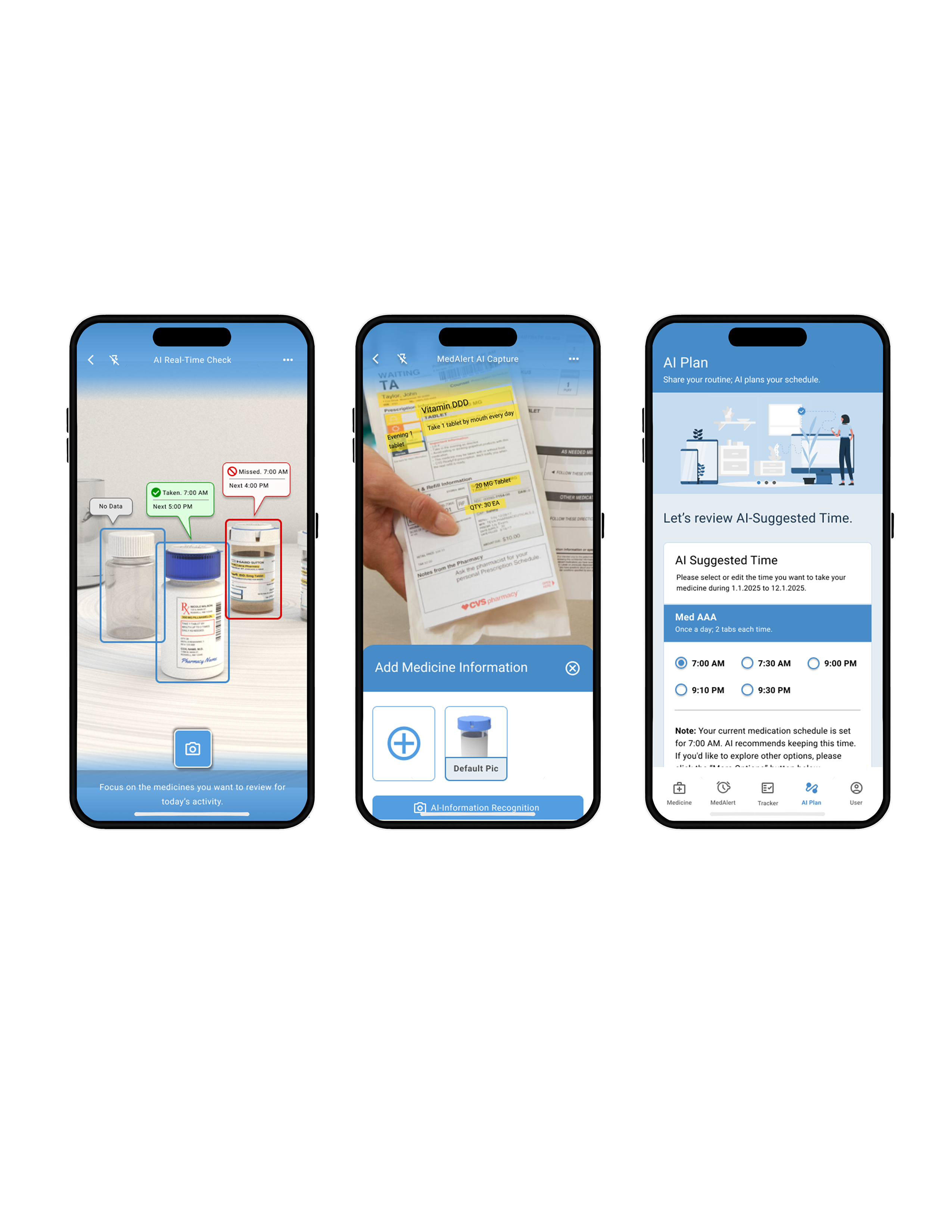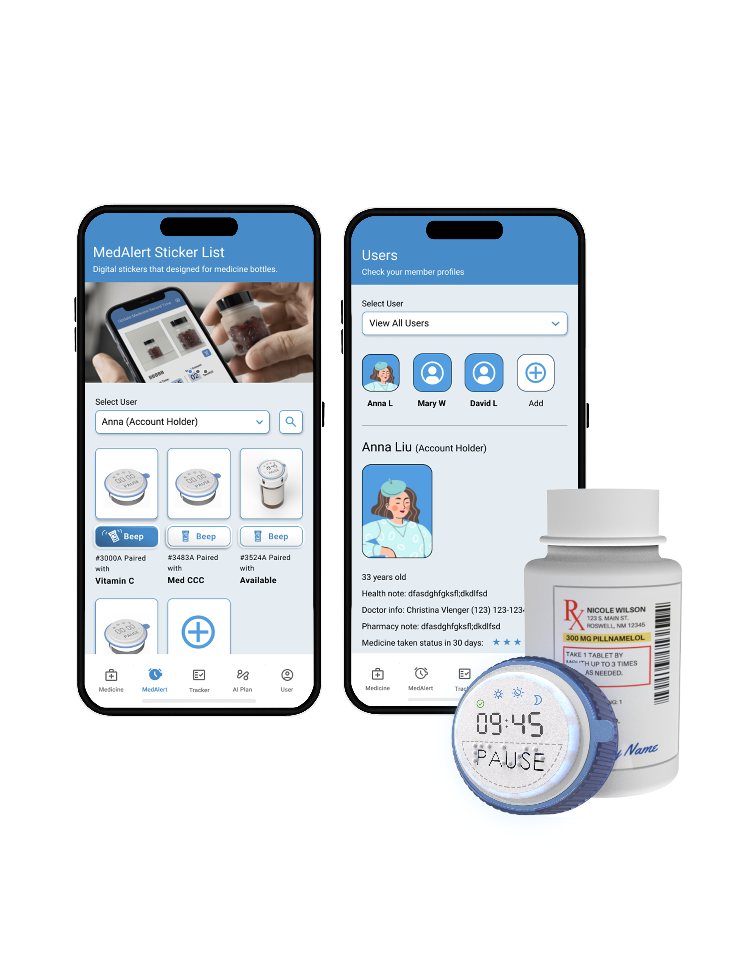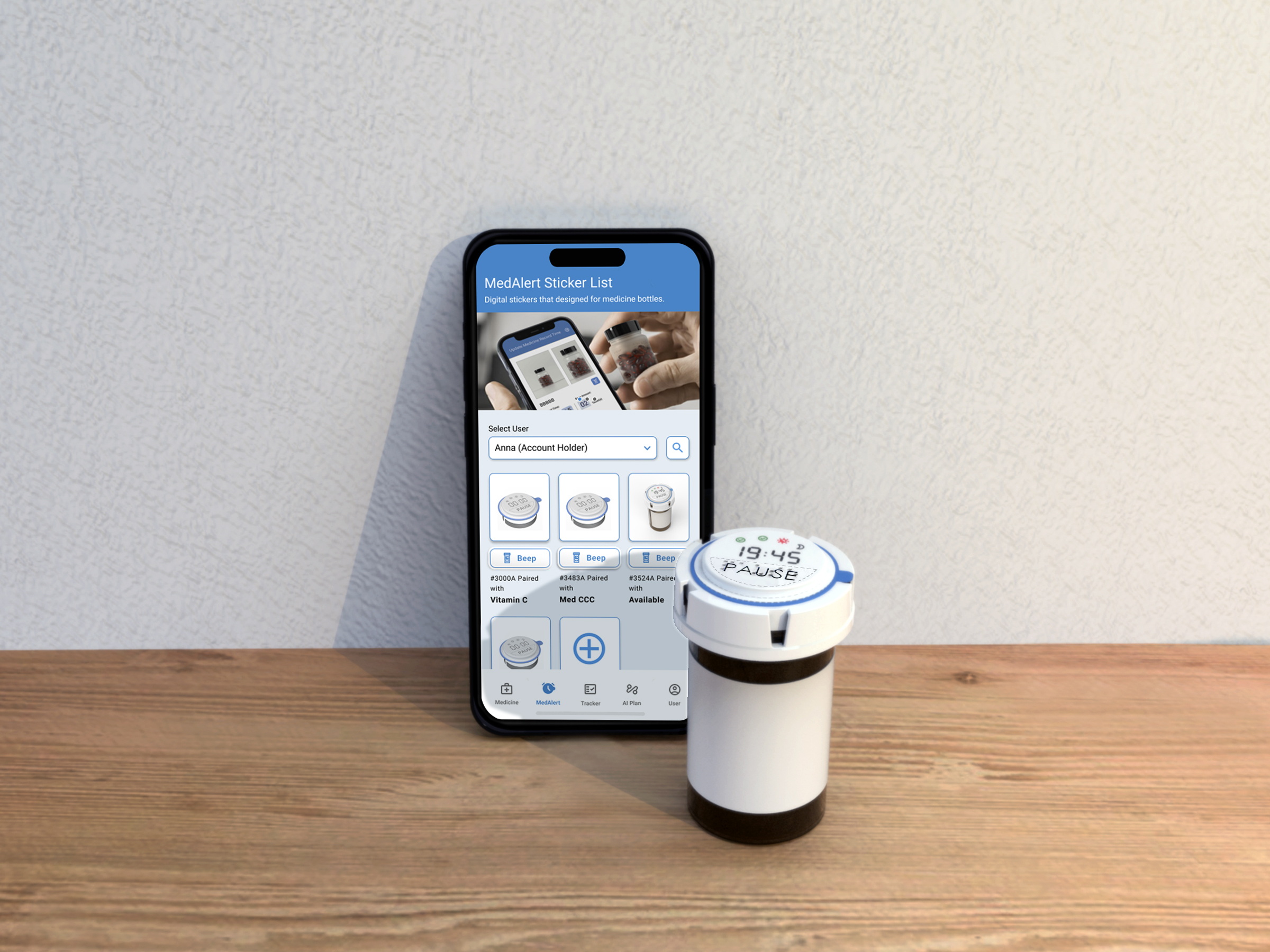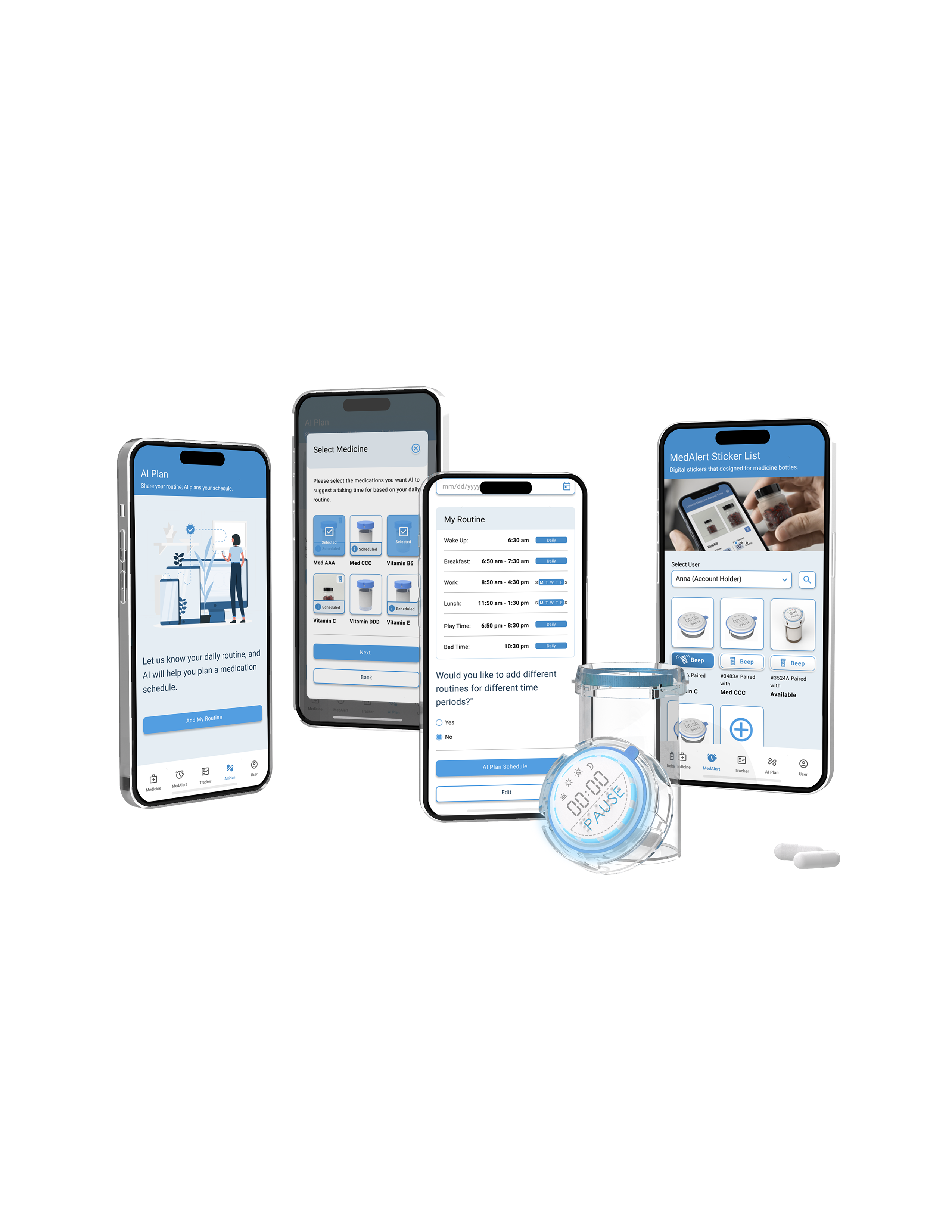 The MedAlert AI combines a compact device with AI and UX-driven solutions to simplify medication management. It includes a physical sticker that can be attached to any medicine cap and a mobile app for digital support.