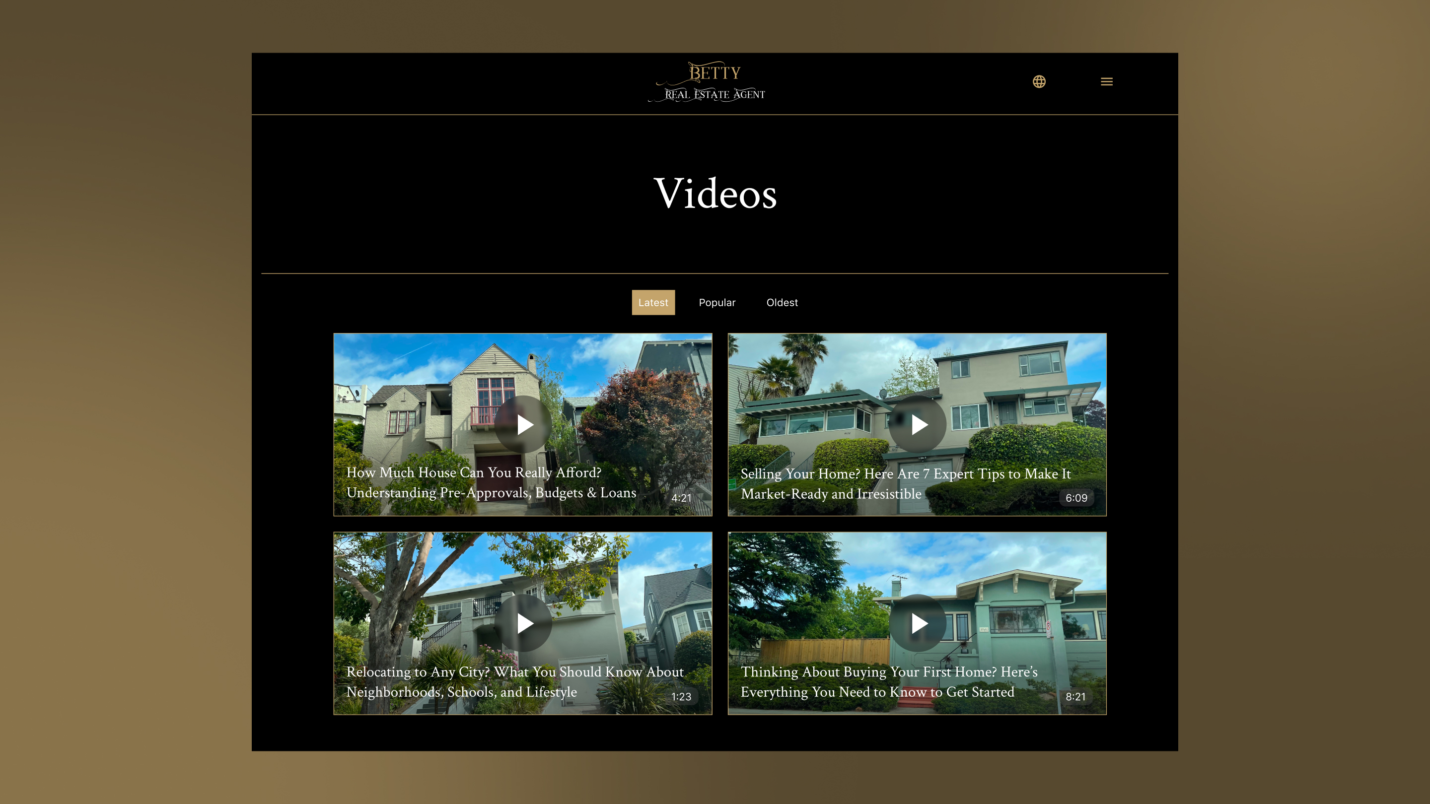 Additional sections include Blog, News, and Video pages, enabling agents to share professional insights, industry updates, and property tours. Video content can be filtered by time or popularity, and controlled loading improves site performance.