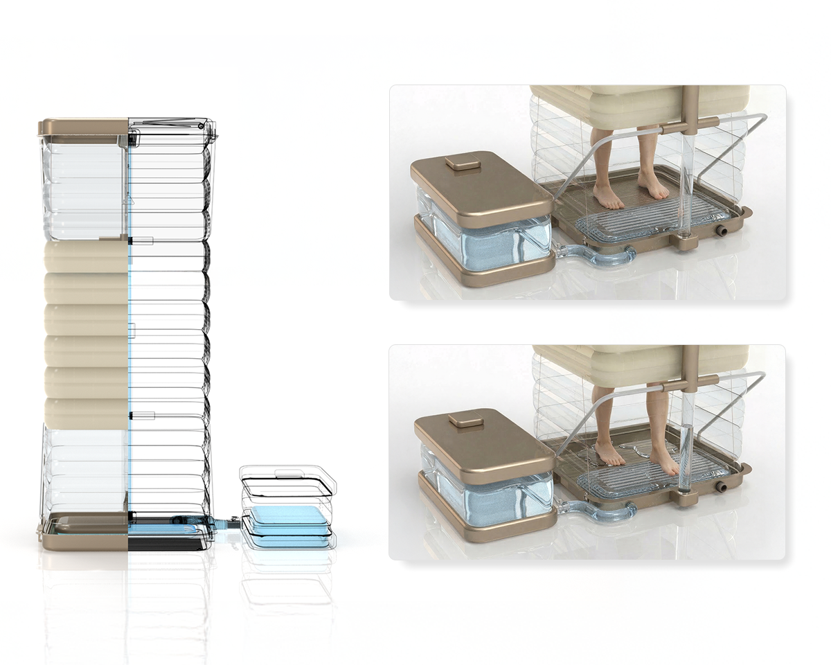 Thanks to its modular design, the system can be easily assembled and disassembled. All components are designed to fit within a box-like structure formed by the base and top panel, allowing the product to transform into a compact and portable unit when not in use. This feature provides a strong logistical advantage in disaster scenarios and enhances portability for outdoor use, delivering a practical and user-friendly hygiene solution.