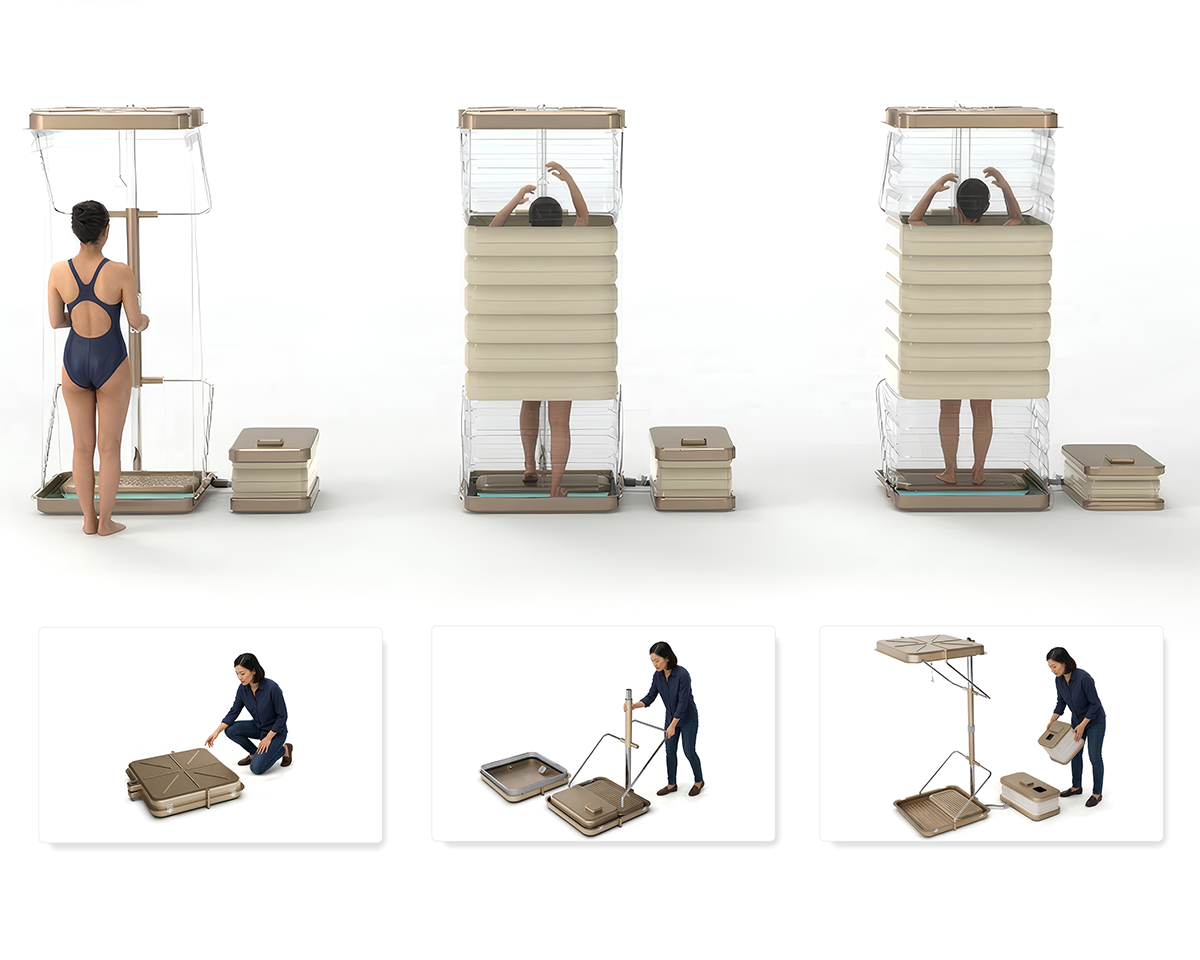 In disaster areas, temporary settlements, and outdoor environments such as camps, access to basic hygiene infrastructure is often limited. This makes it difficult for individuals to meet daily cleaning needs and can lead to health and comfort issues. In response, the foldable shower system is designed as a portable and practical hygiene solution that operates using physical principles without requiring infrastructure or external mechanisms. It enables rapid setup of hygiene points in disaster situations, supports basic cleaning needs in temporary living areas, and provides an accessible shower option for outdoor activities like camping.