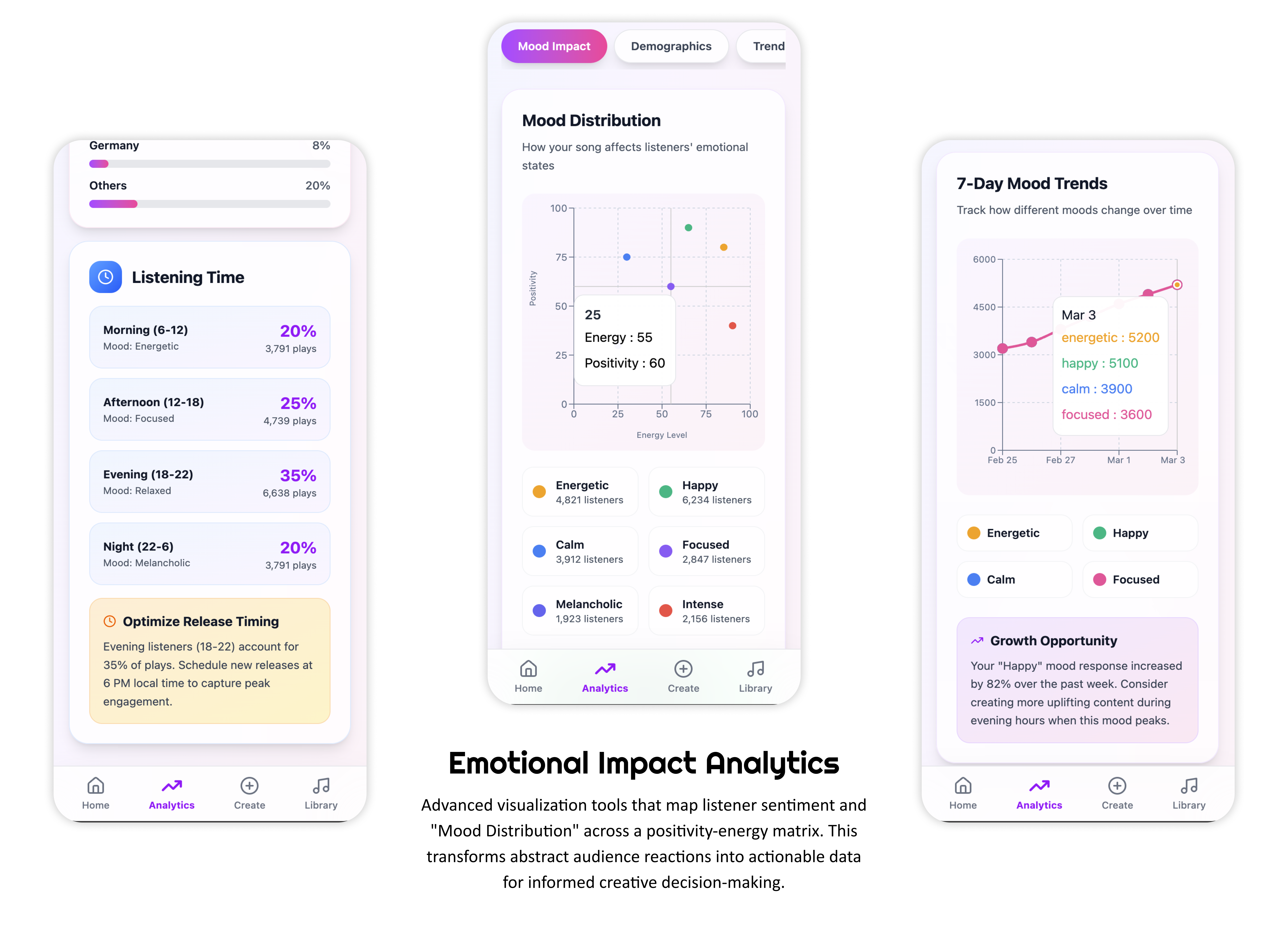 The platform’s standout feature is the Emotional Energy Matrix, a data-driven visualization tool that tracks listener sentiment across a spectrum of psychological states. For music creators, this provides an unprecedented level of insight: the ability to see how their work truly resonates with an audience's inner world. Whether a listener is seeking solace in a slow melody or motivation in a high-energy rhythm, MoodBoard translates these abstract human experiences into actionable creative intelligence.
