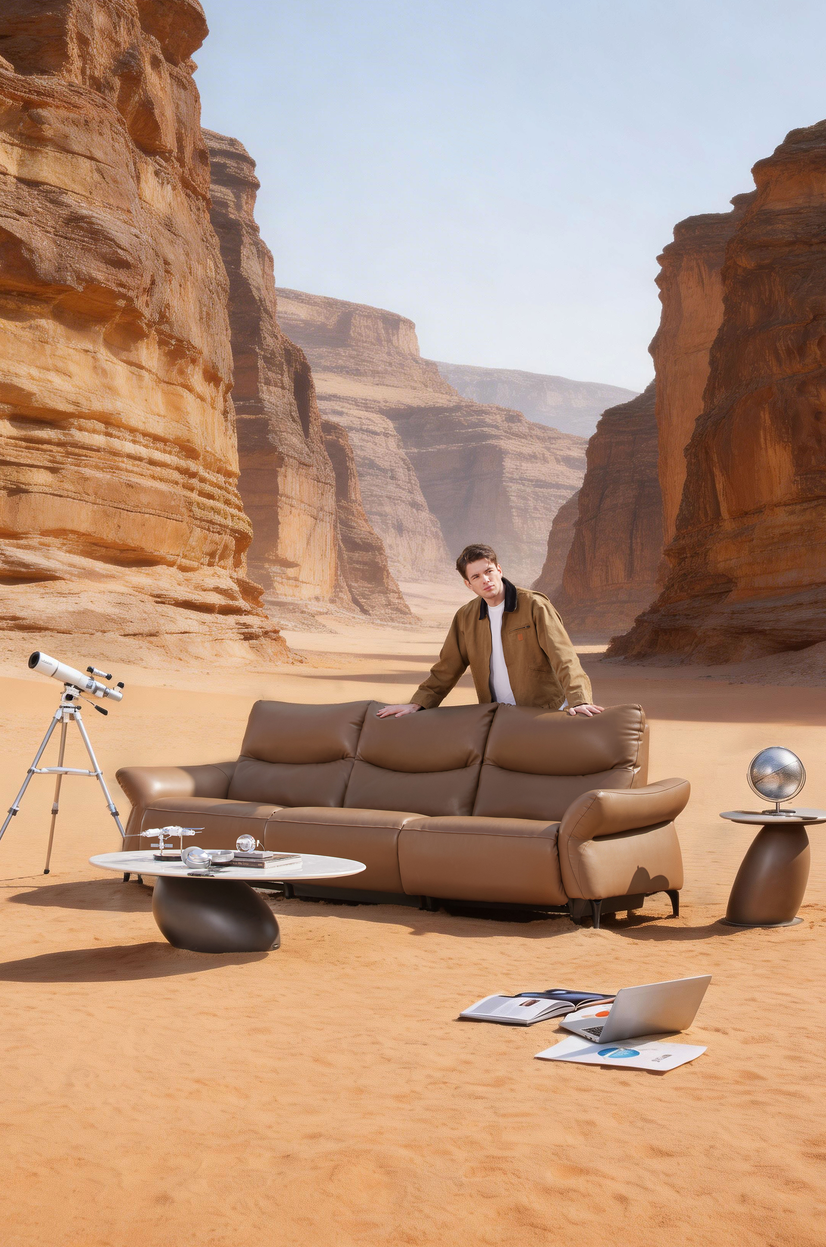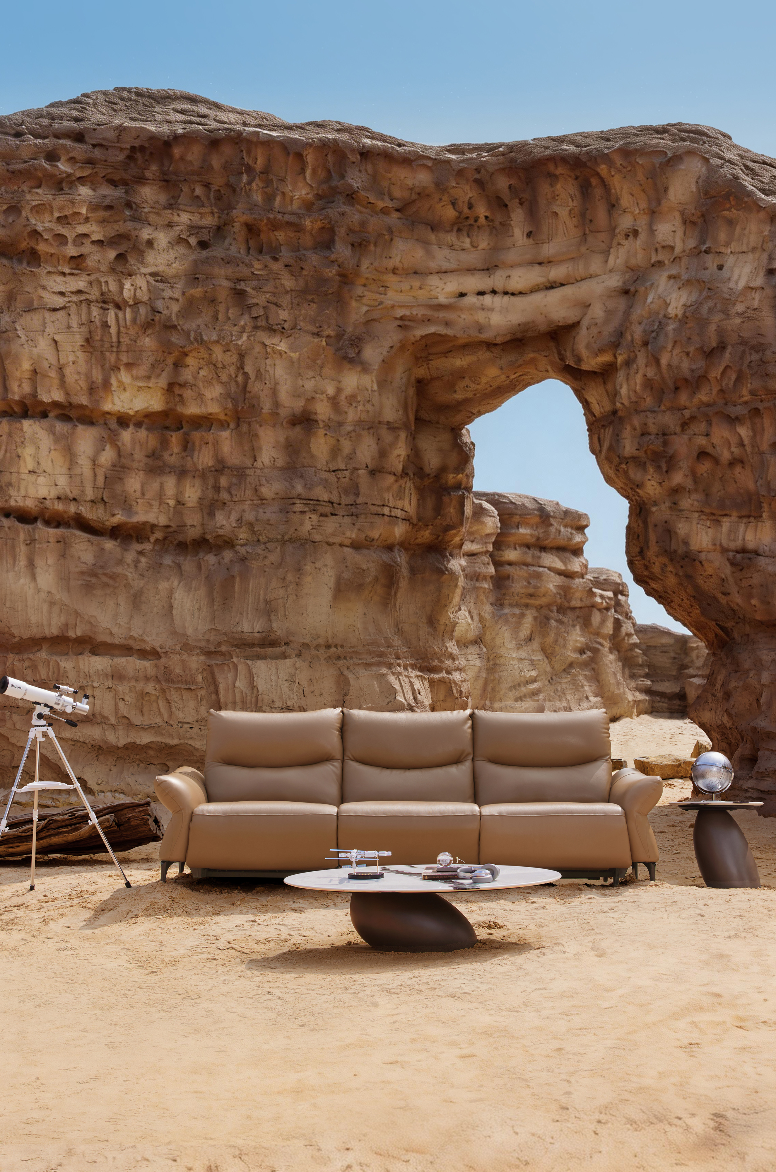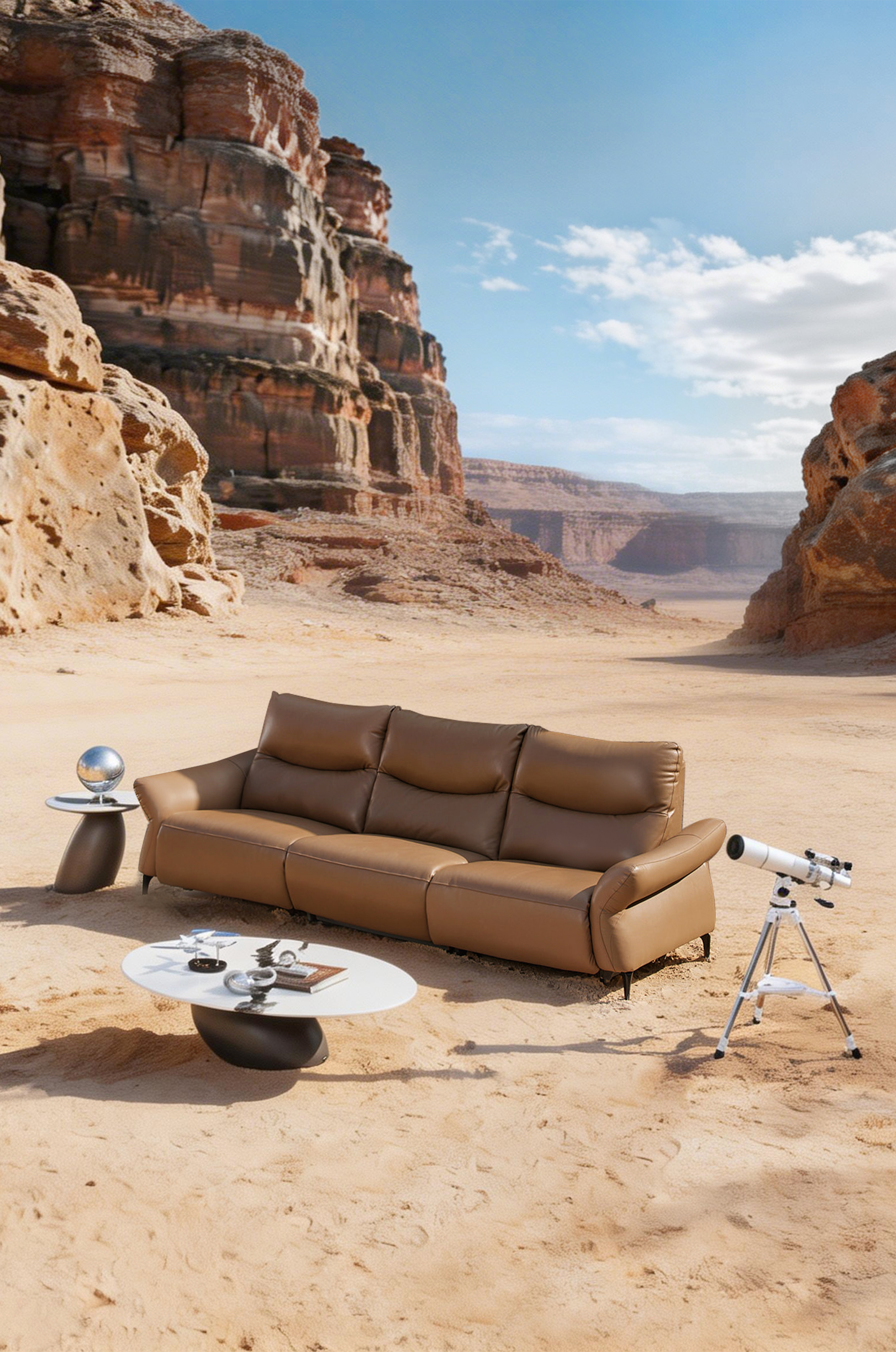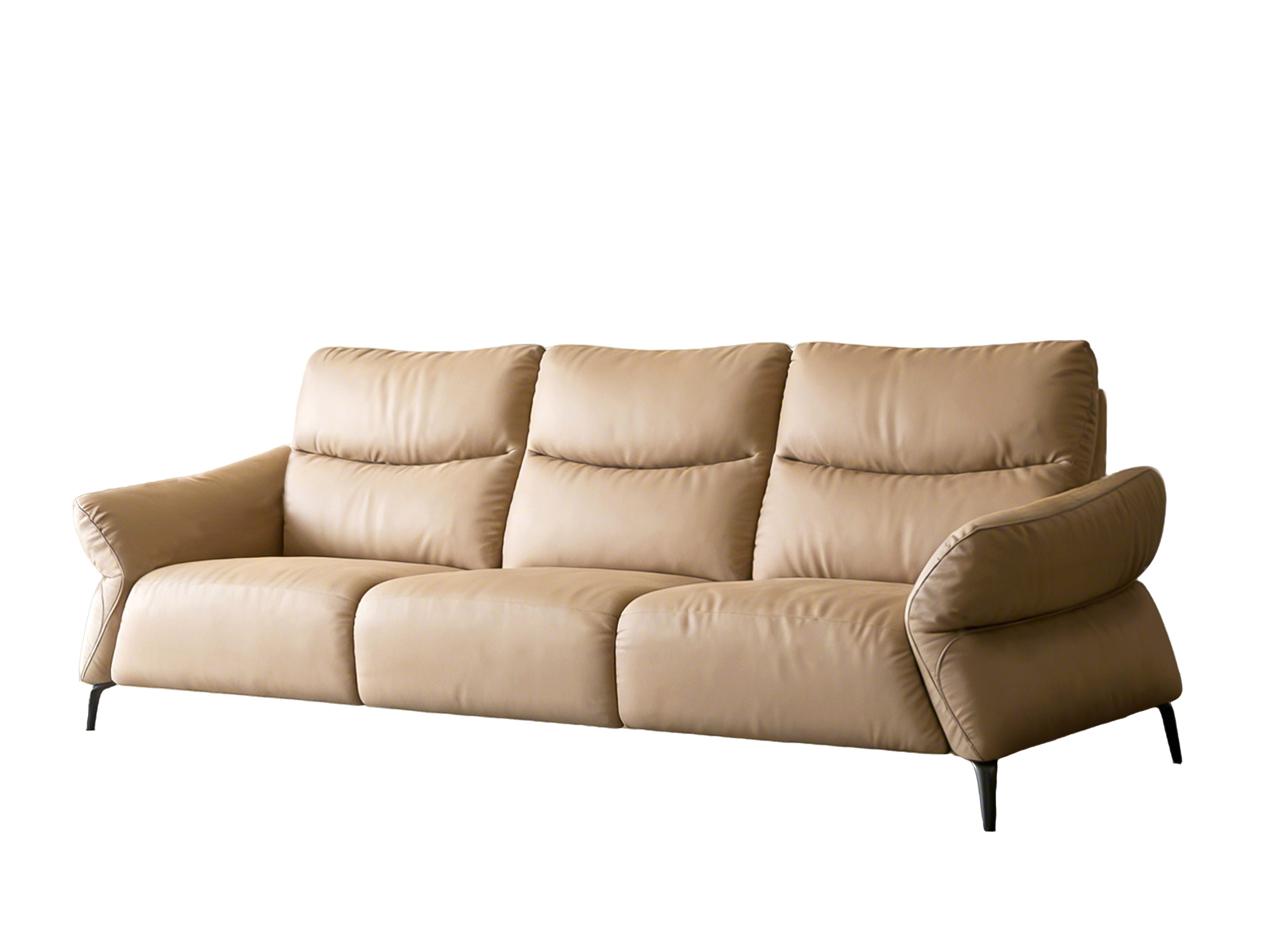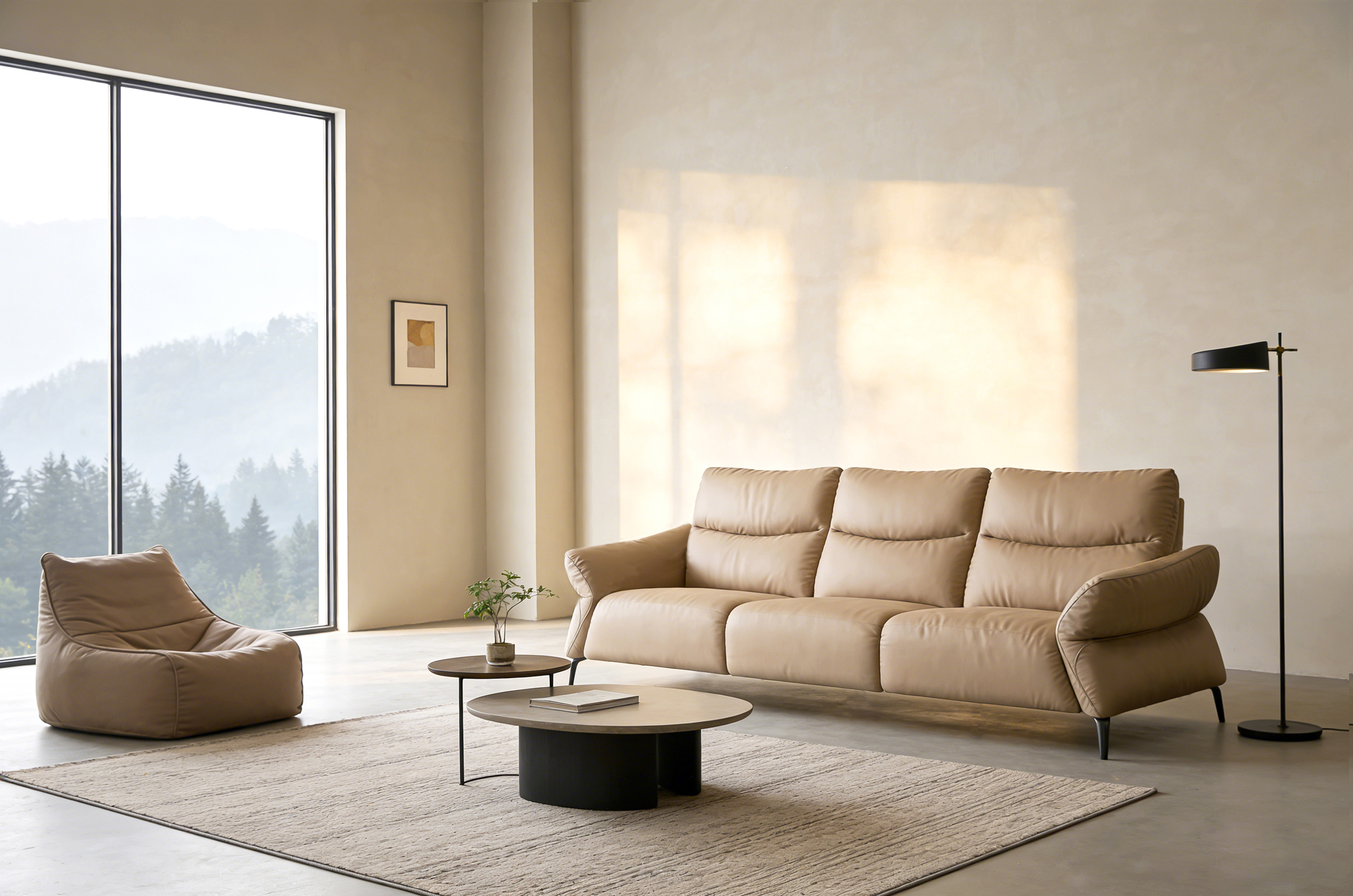 Regression embraces modern interior aesthetics. It draws inspiration from the morning mist over the Alps: fluid lines and rounded armrests create a gentle, inviting silhouette, while slender metal legs reduce the visual weight of the leather body and lend it a floating presence, harmonizing with various modern interior styles. The split backrest masterfully blends modularity—allowing for independent adjustment—with visual coherence. Moreover, a palette of muted neutral tones infuses the space with a soft visual foundation, fostering a calm, relaxing atmosphere.