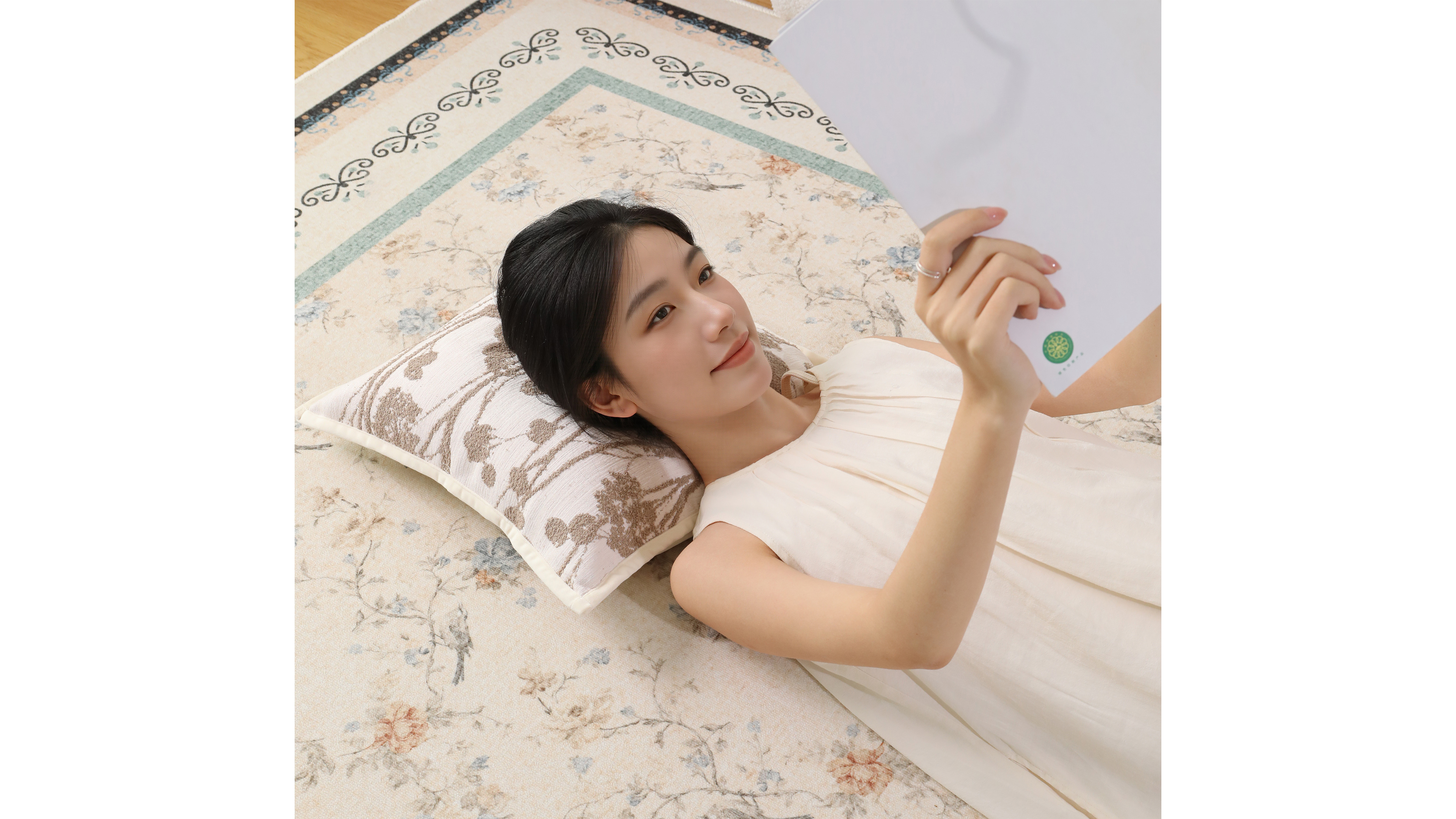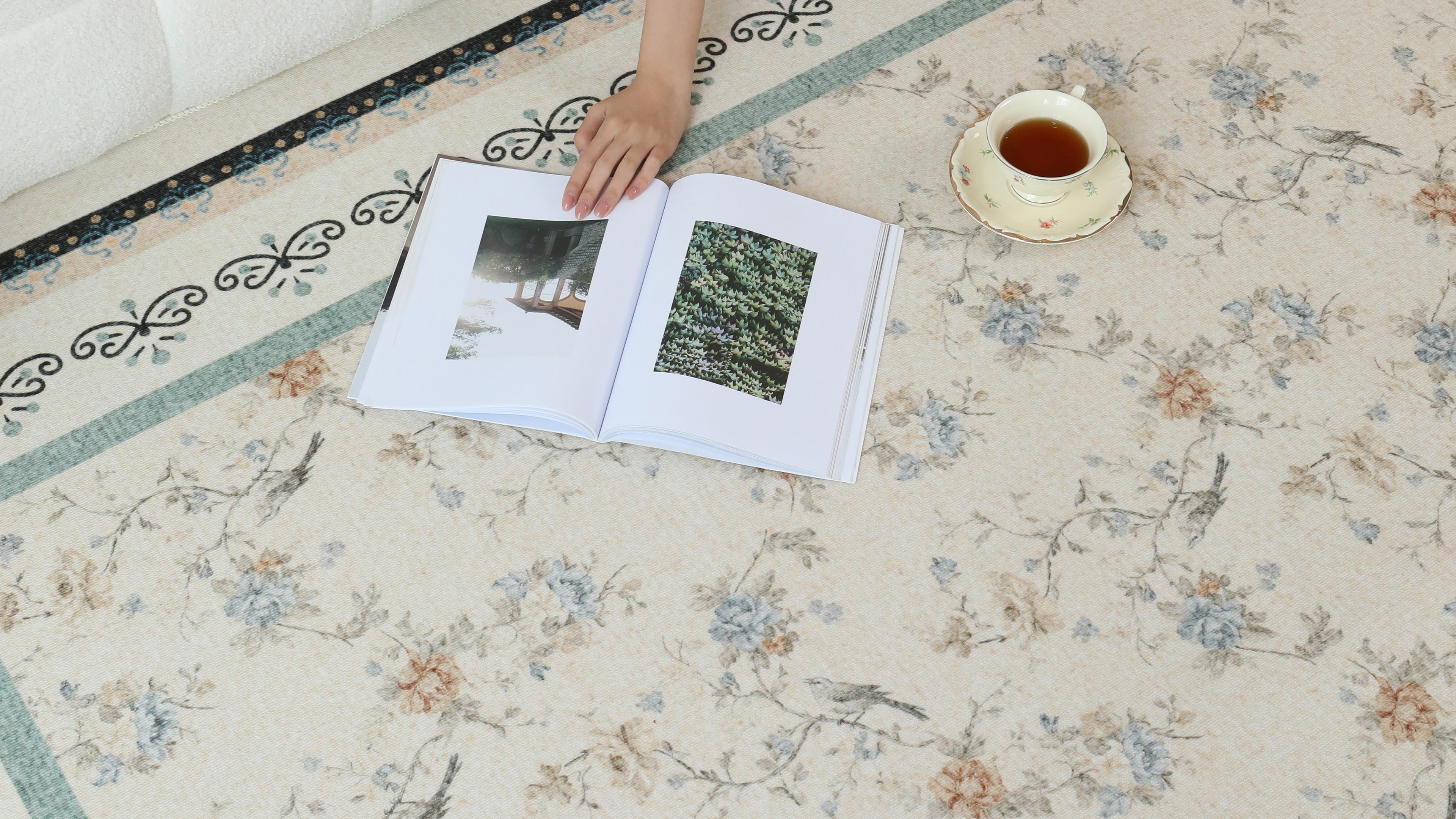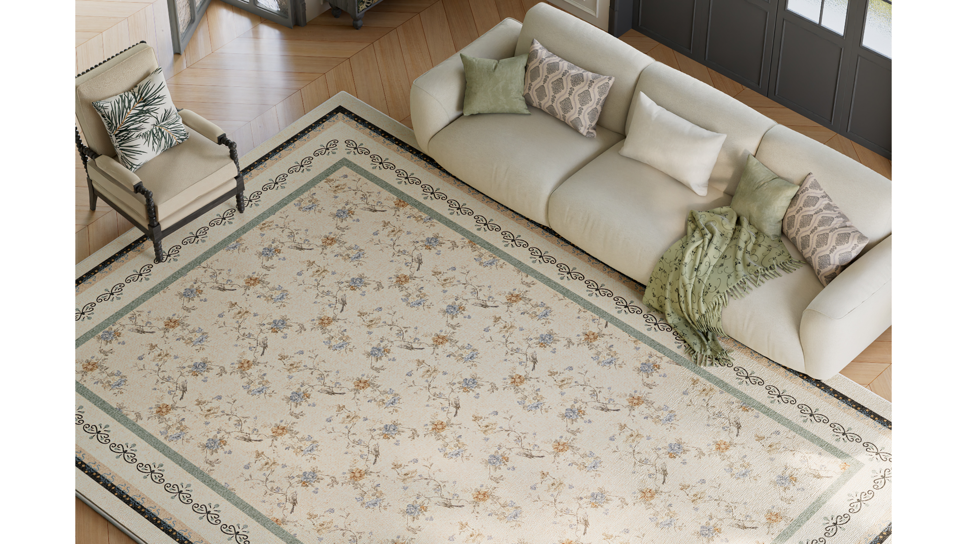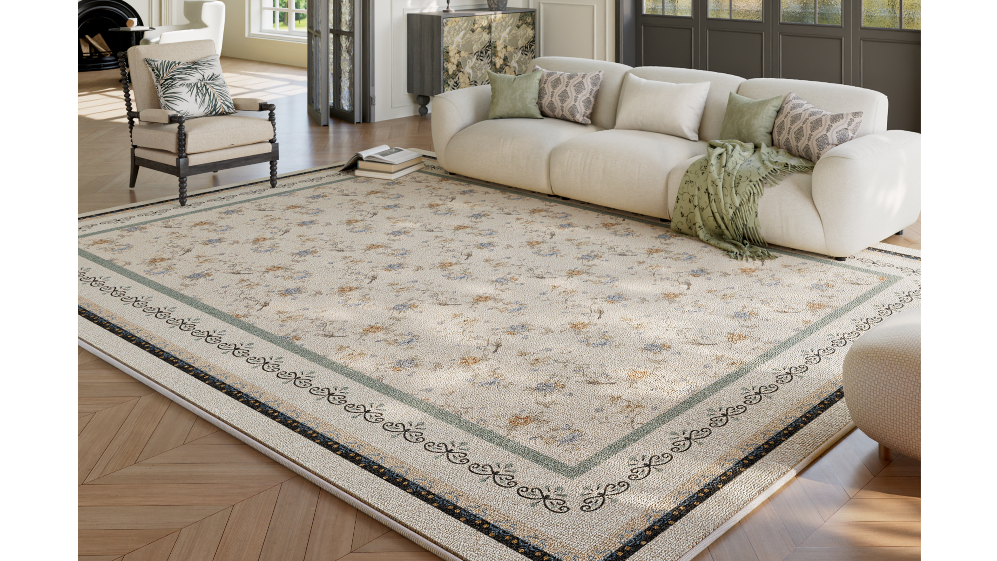 This poetic pursuit comes to life through a palette of soft cream yellow and mint green, reminiscent of Provence’s morning mist and golden afternoon sun. Delicate floral motifs and sophisticated borders evoke the effortless elegance of the Parisian Left Bank, turning the floor into a subtle yet sophisticated artistic statement.