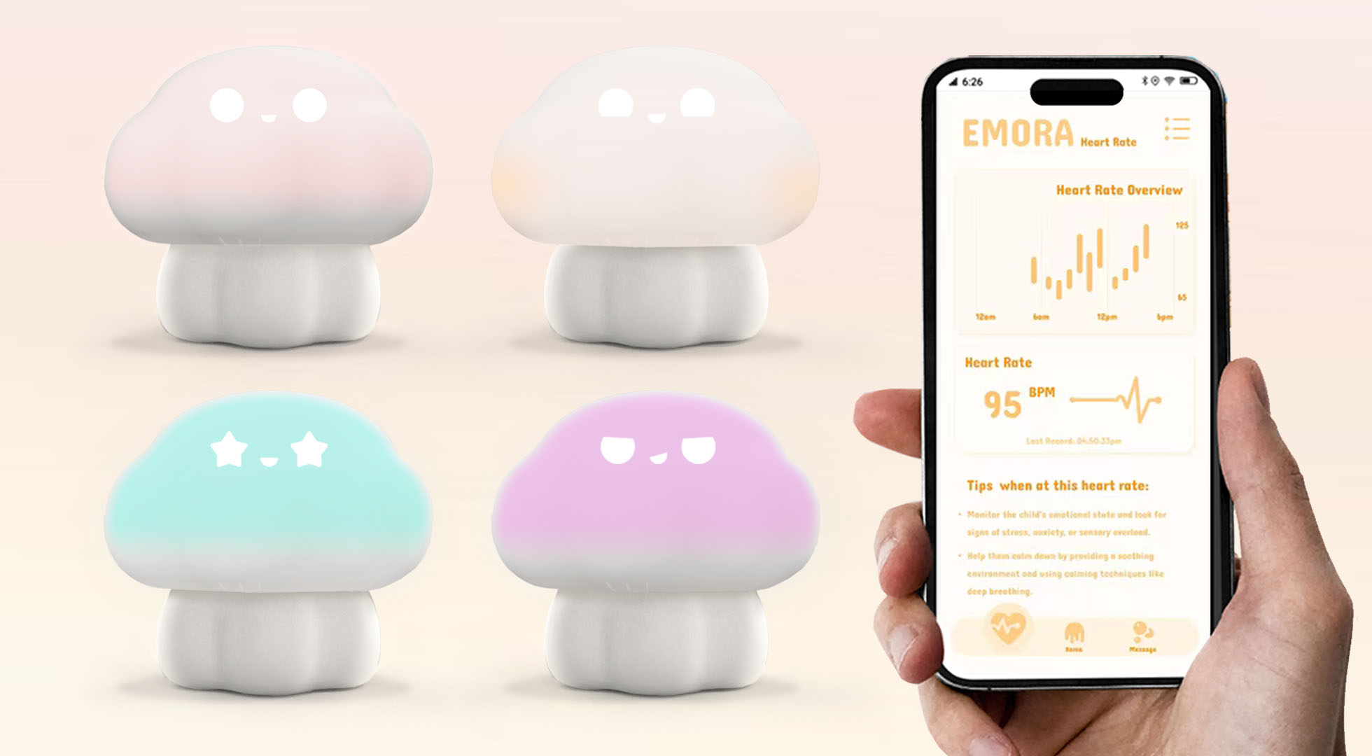 Emora’s jellyfish-inspired design features soft, child-safe materials and psychologically tested color schemes to create a calming, non-intrusive presence. Data collected from interactions is synced to a parent-facing app, providing insights into the child’s emotional trends and well-being.
